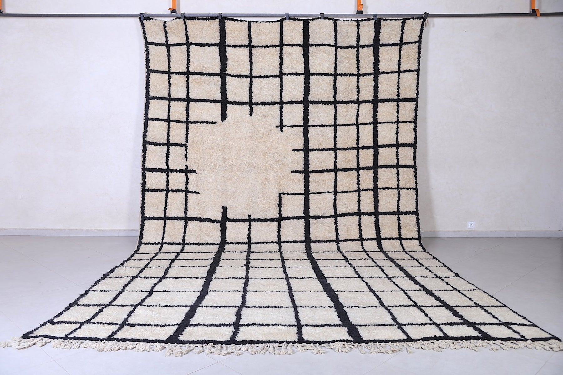 Add modern texture and artisan flair to your space with our Authentic White Moroccan Grid Rug, a bold yet timeless piece rooted in traditional Berber craftsmanship. Featuring a striking black grid pattern over a crisp white wool base, this handmade rug balances graphic design with heritage-rich style.