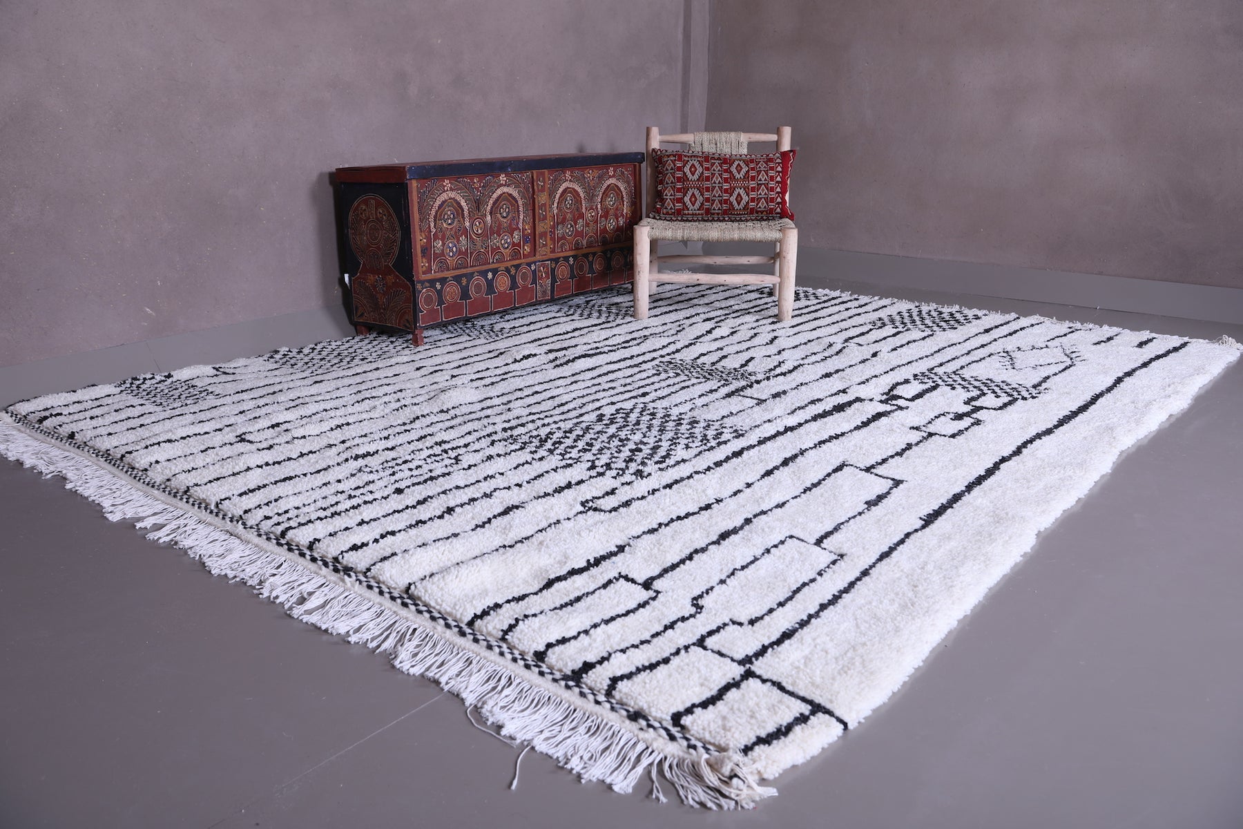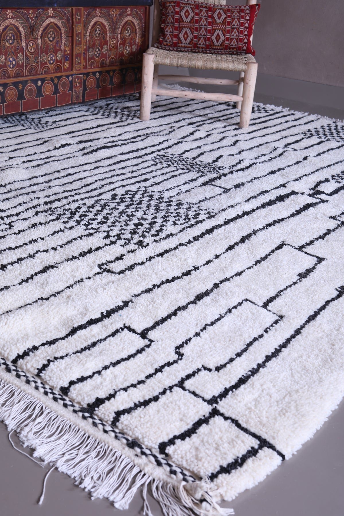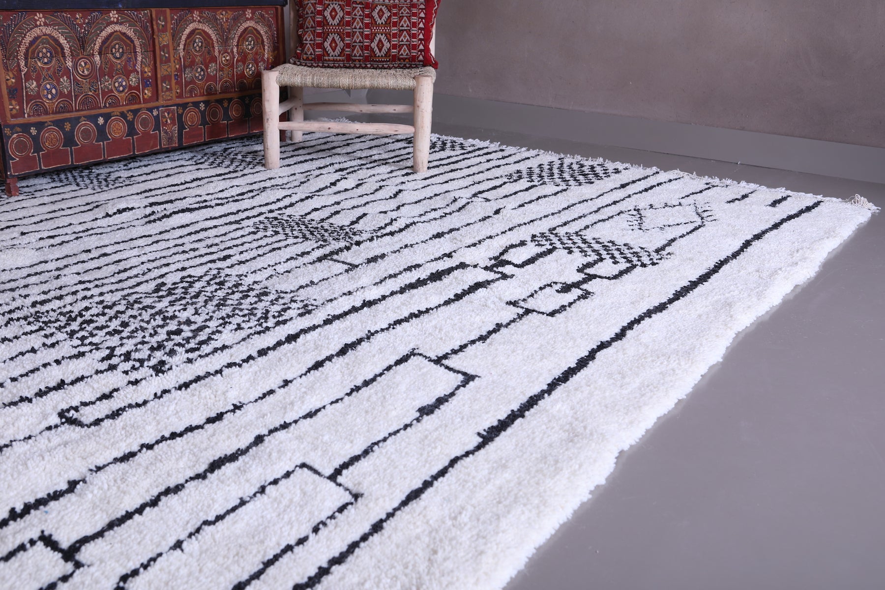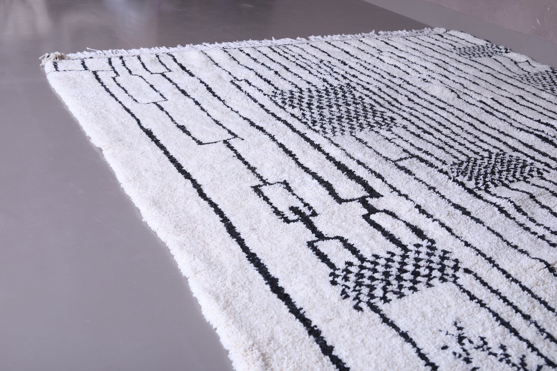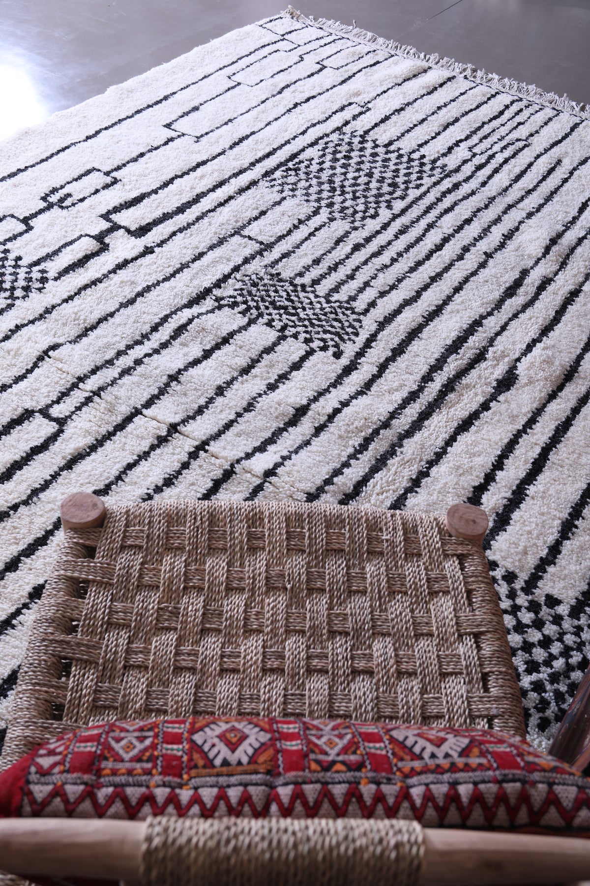 Add modern Moroccan elegance to your home with this striking White and Black Azilal Rug. Handwoven by Berber artisans in the Atlas Mountains, this rug features a clean white wool base adorned with abstract black linework and geometric motifs, creating a visually captivating, one-of-a-kind piece.