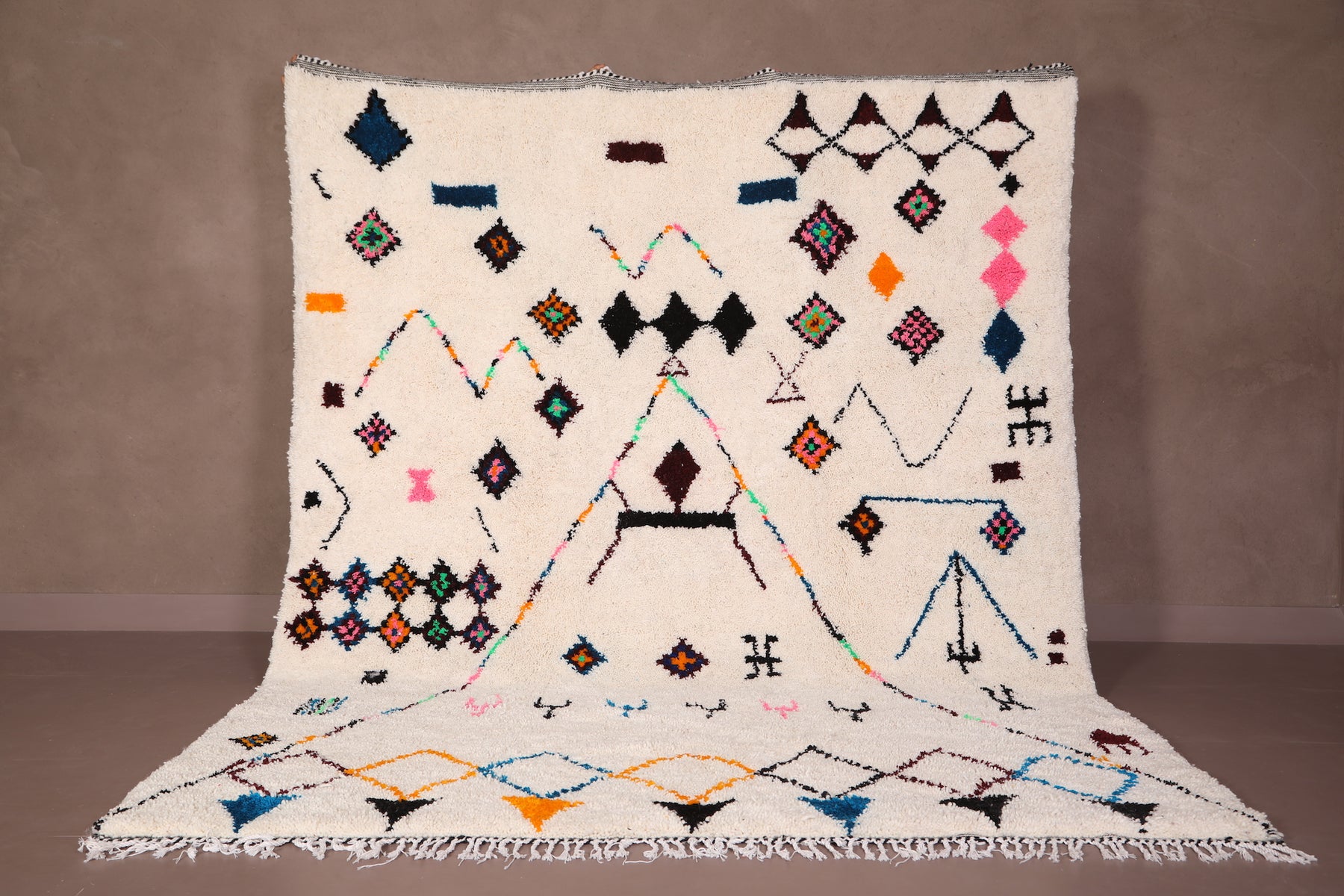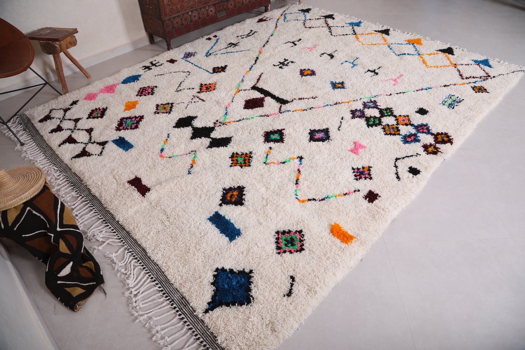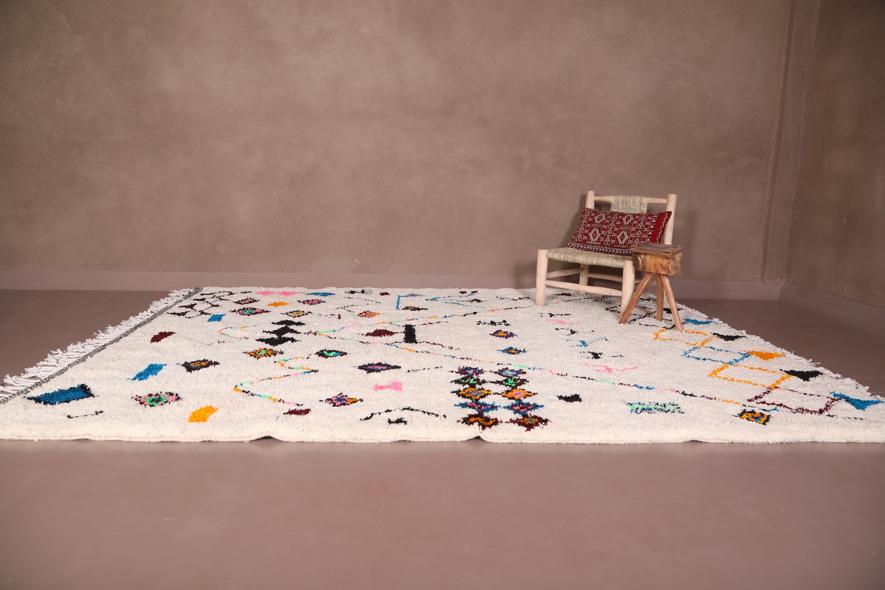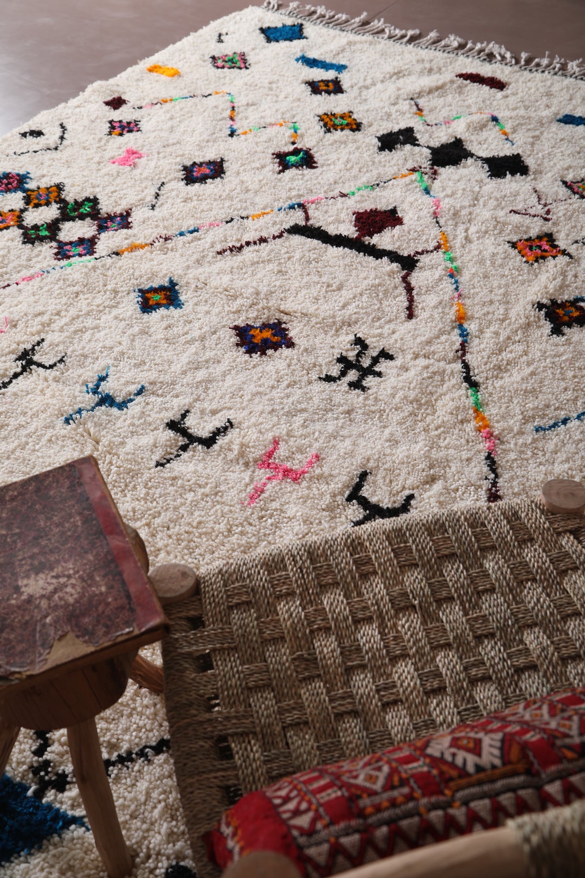 Introduce a burst of Moroccan artistry into your home with this handcrafted Azilal Rug. Featuring a soft white base adorned with vibrant, asymmetrical tribal motifs, this one-of-a-kind piece brings life and personality to any room. Each symbol tells a story, woven by Berber women in the Atlas Mountains using 100% natural wool.