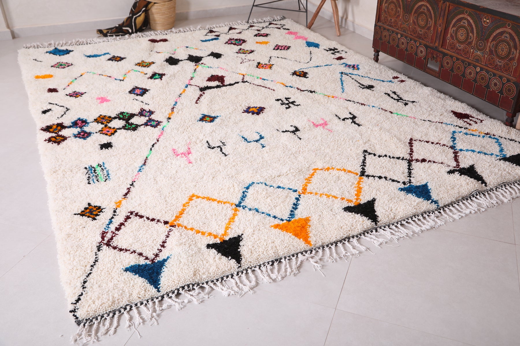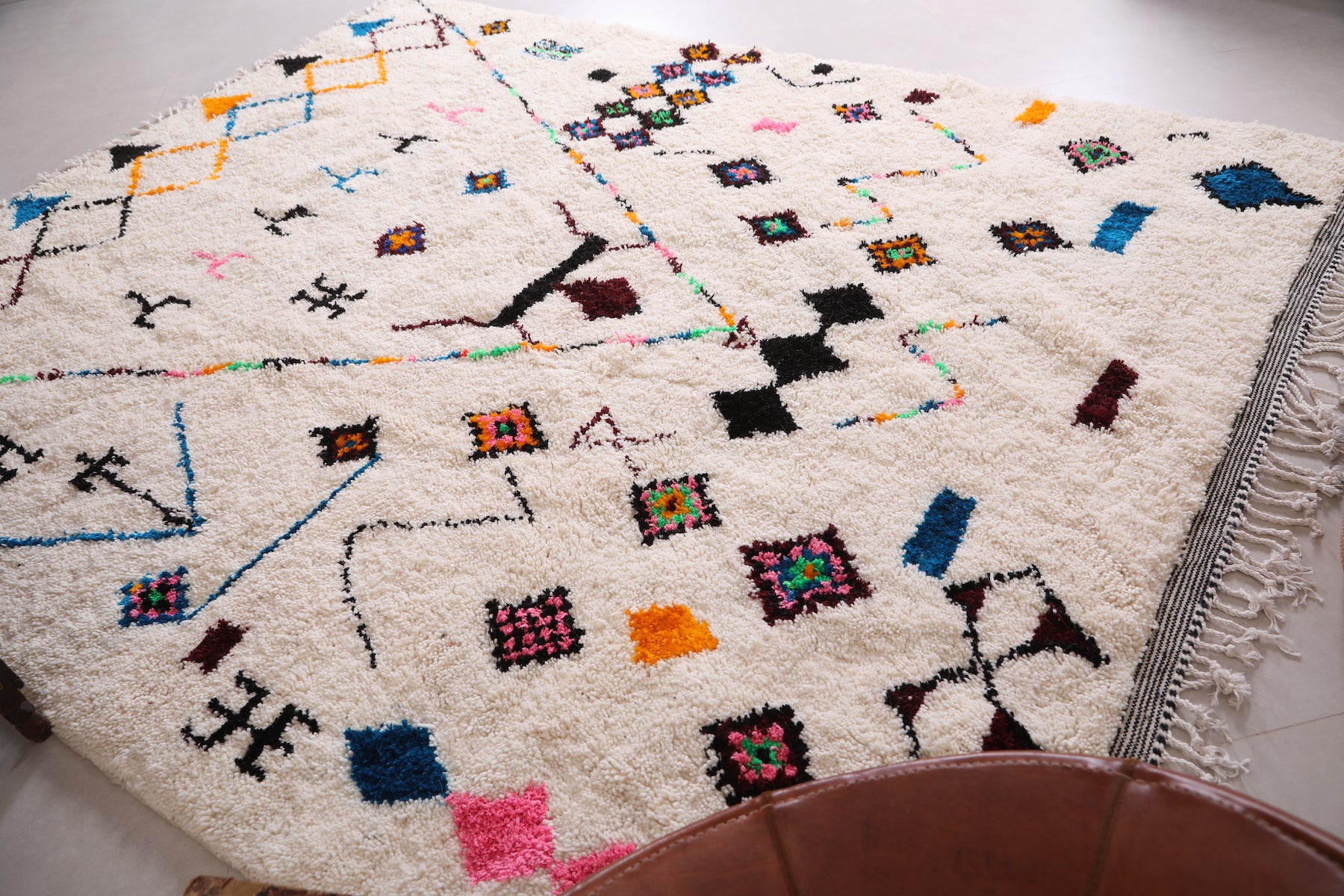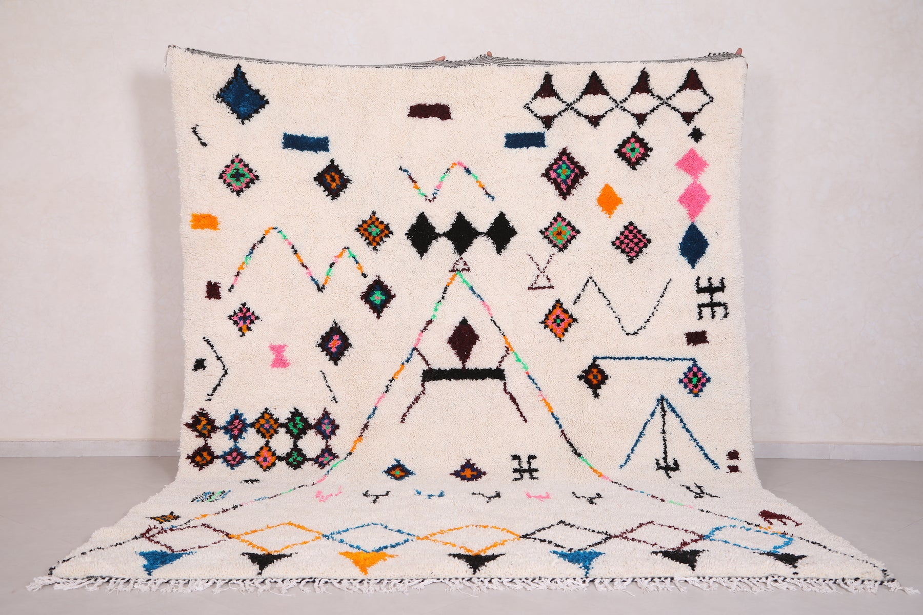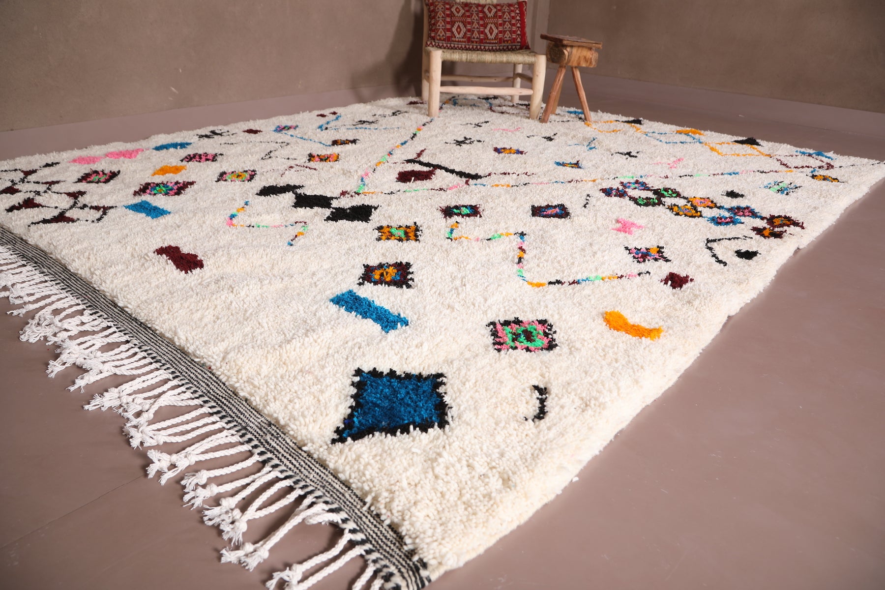 Introduce a burst of Moroccan artistry into your home with this handcrafted Azilal Rug. Featuring a soft white base adorned with vibrant, asymmetrical tribal motifs, this one-of-a-kind piece brings life and personality to any room. Each symbol tells a story, woven by Berber women in the Atlas Mountains using 100% natural wool.
