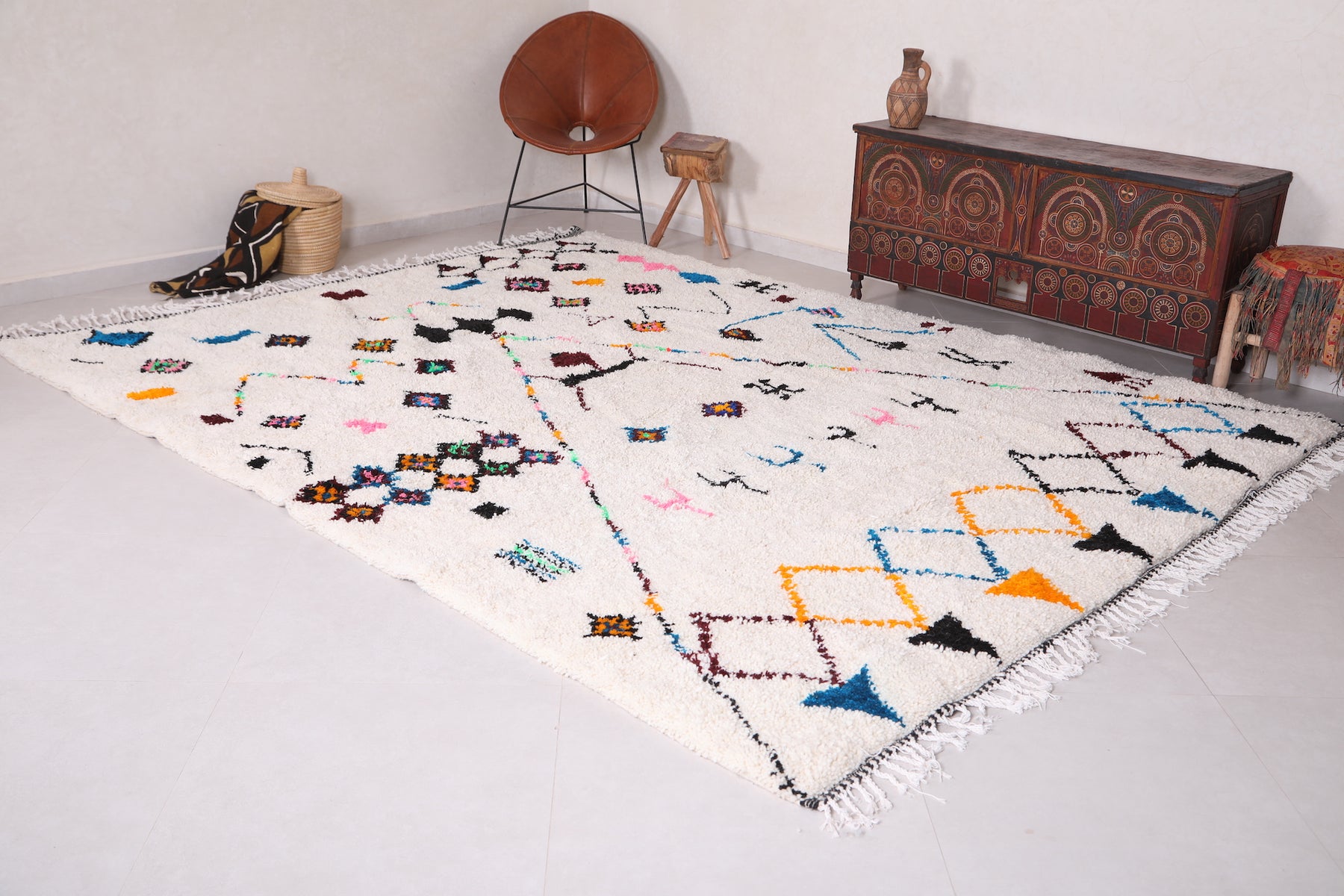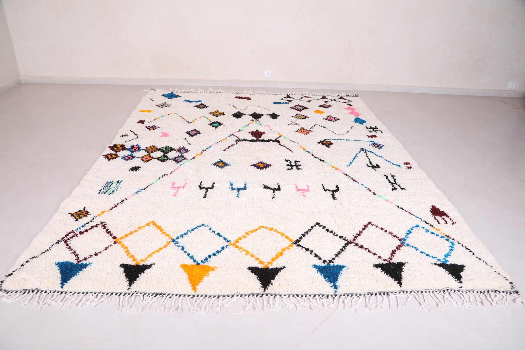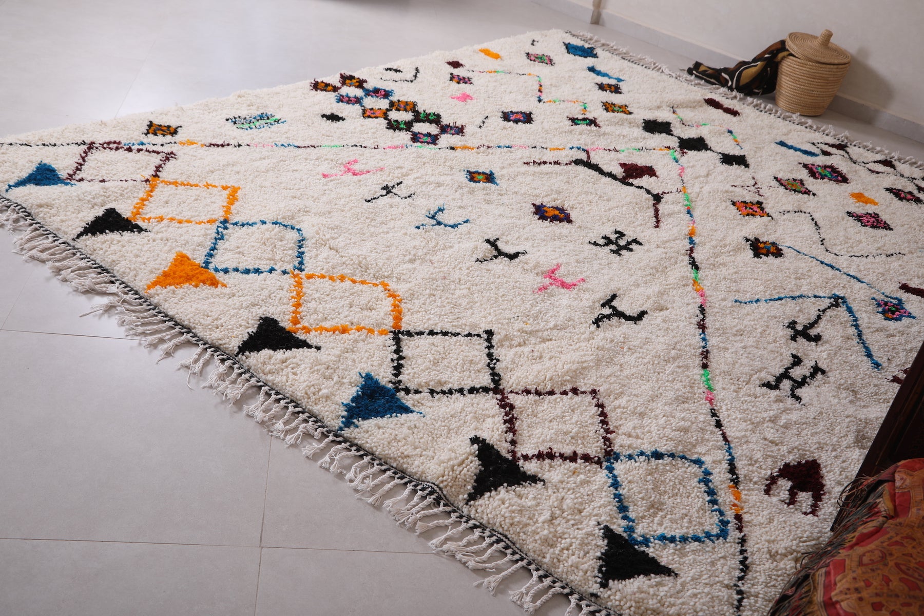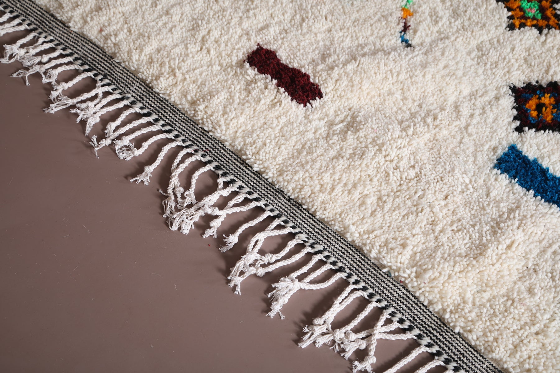 Introduce a burst of Moroccan artistry into your home with this handcrafted Azilal Rug. Featuring a soft white base adorned with vibrant, asymmetrical tribal motifs, this one-of-a-kind piece brings life and personality to any room. Each symbol tells a story, woven by Berber women in the Atlas Mountains using 100% natural wool.
