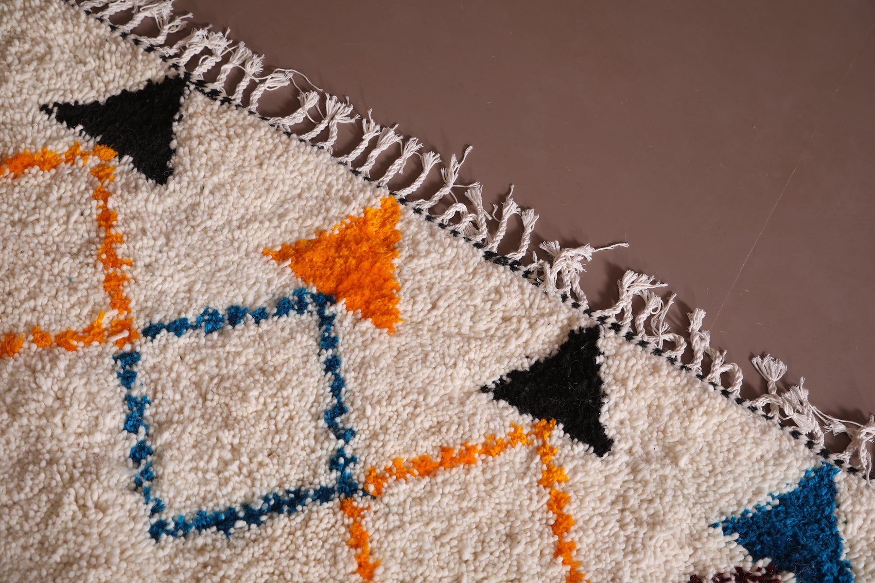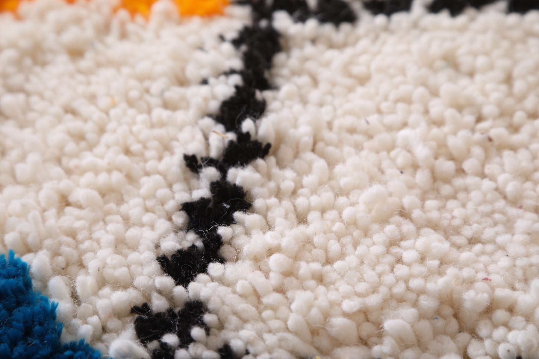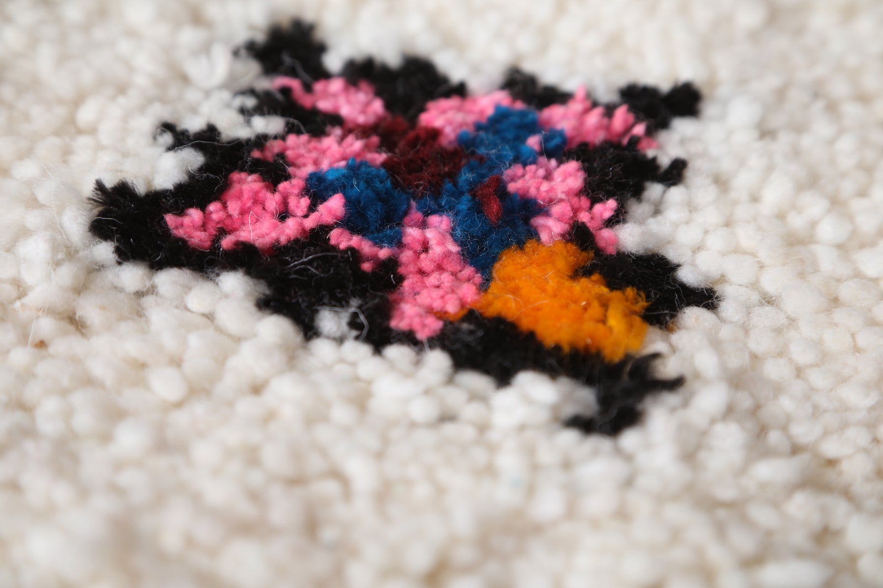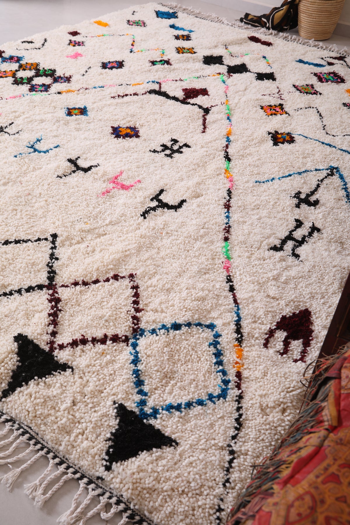 Introduce a burst of Moroccan artistry into your home with this handcrafted Azilal Rug. Featuring a soft white base adorned with vibrant, asymmetrical tribal motifs, this one-of-a-kind piece brings life and personality to any room. Each symbol tells a story, woven by Berber women in the Atlas Mountains using 100% natural wool.