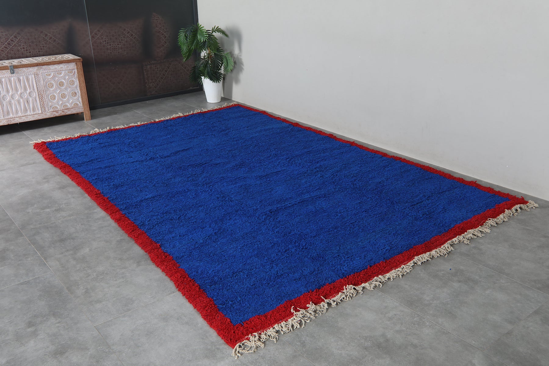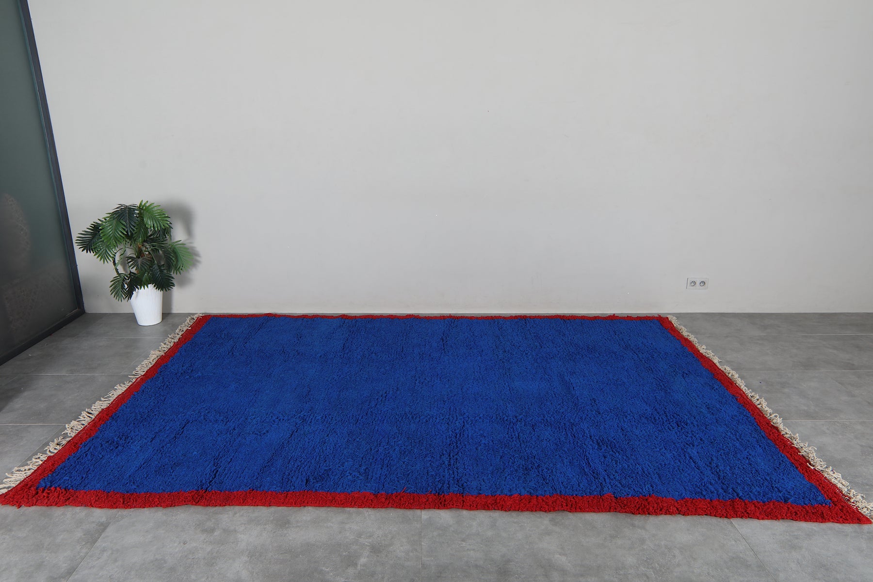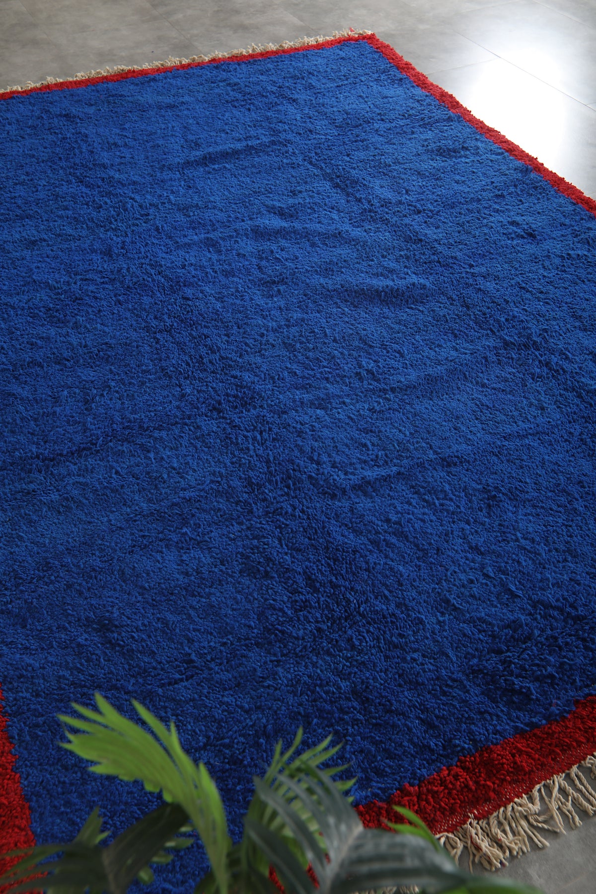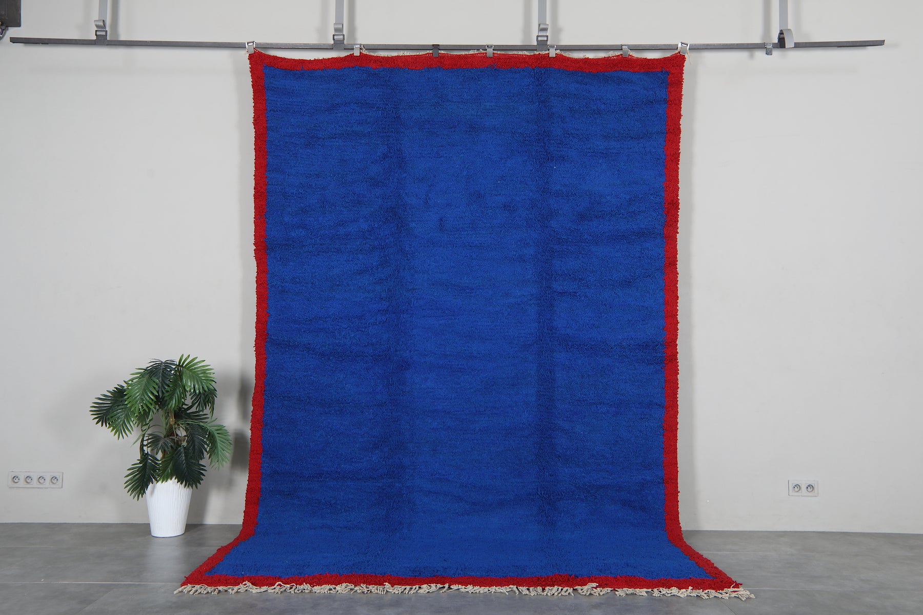 Make a bold statement with this striking handmade Moroccan Berber rug, featuring a rich deep blue field framed by a vibrant red border. The minimalist design highlights the beauty of color and texture, creating a powerful visual contrast that feels both modern and timeless. Handwoven from natural wool by skilled Amazigh (Berber) artisans, the rug offers a plush, soft surface underfoot while maintaining durability for everyday use. Its large size and dramatic palette make it ideal for living rooms, studios, or open spaces where a strong focal point is desired. The combination of vivid blue and warm red brings energy, warmth, and authentic craftsmanship into contemporary, eclectic, or bohemian interiors.