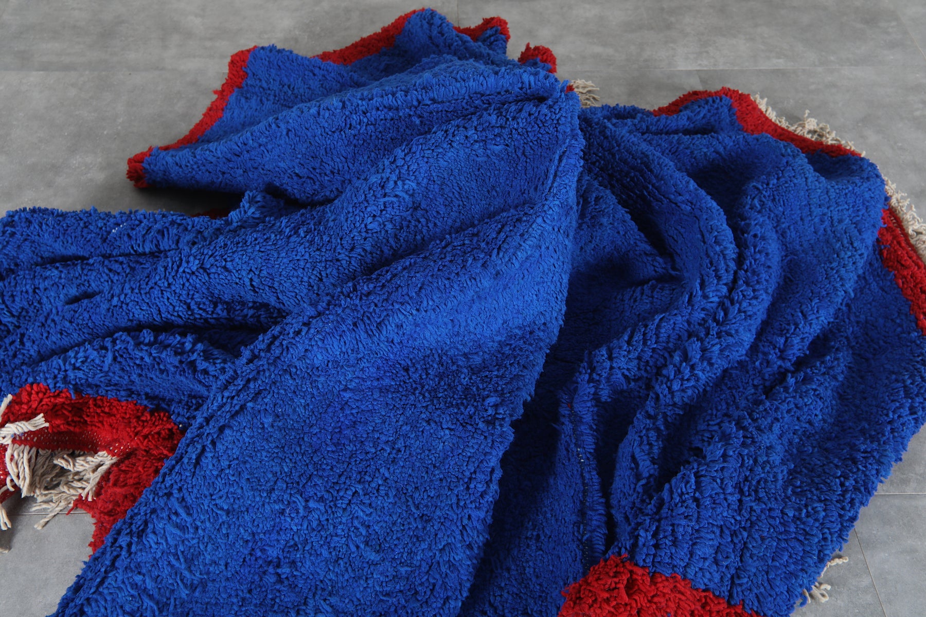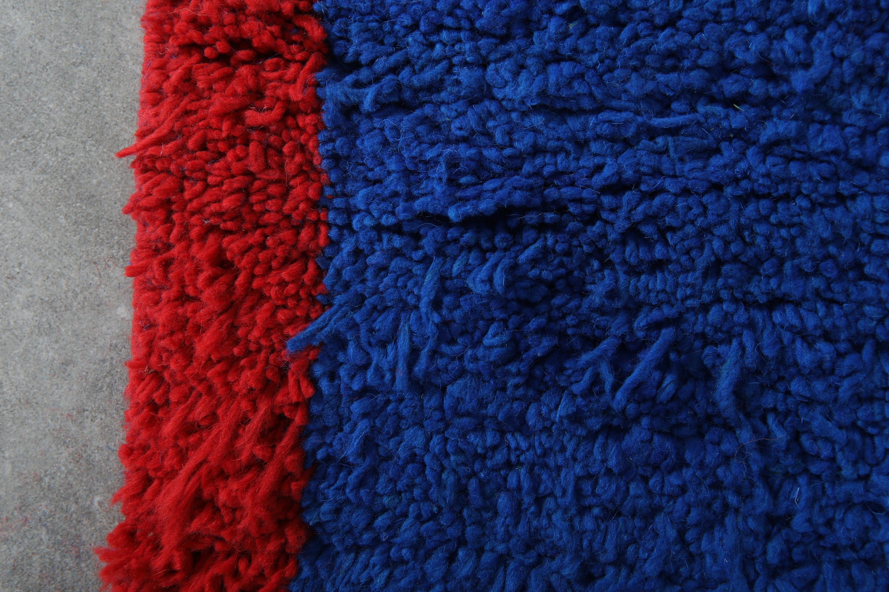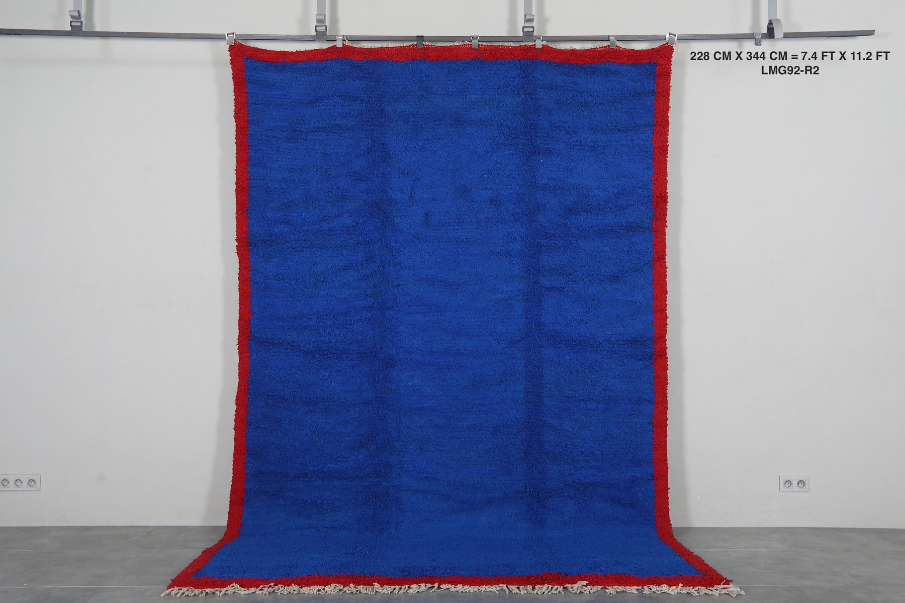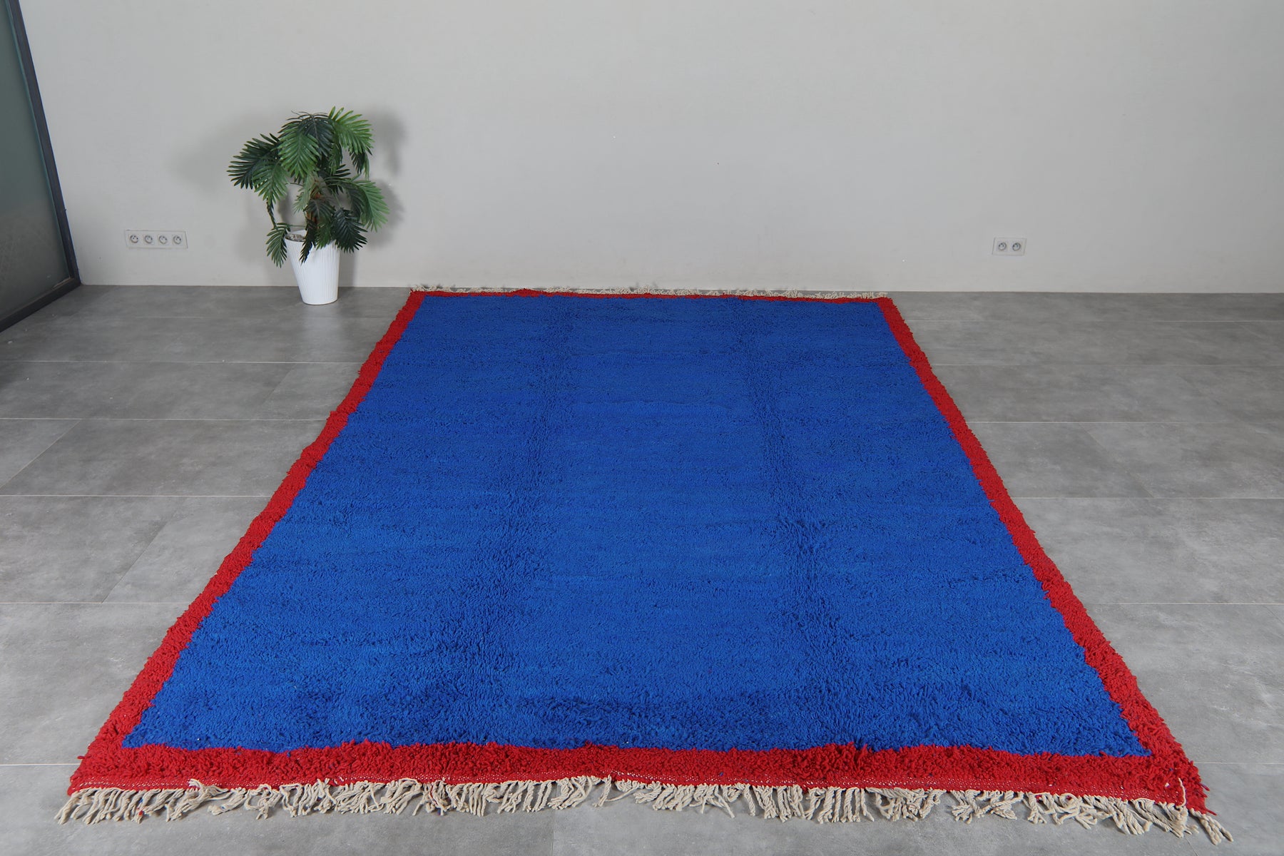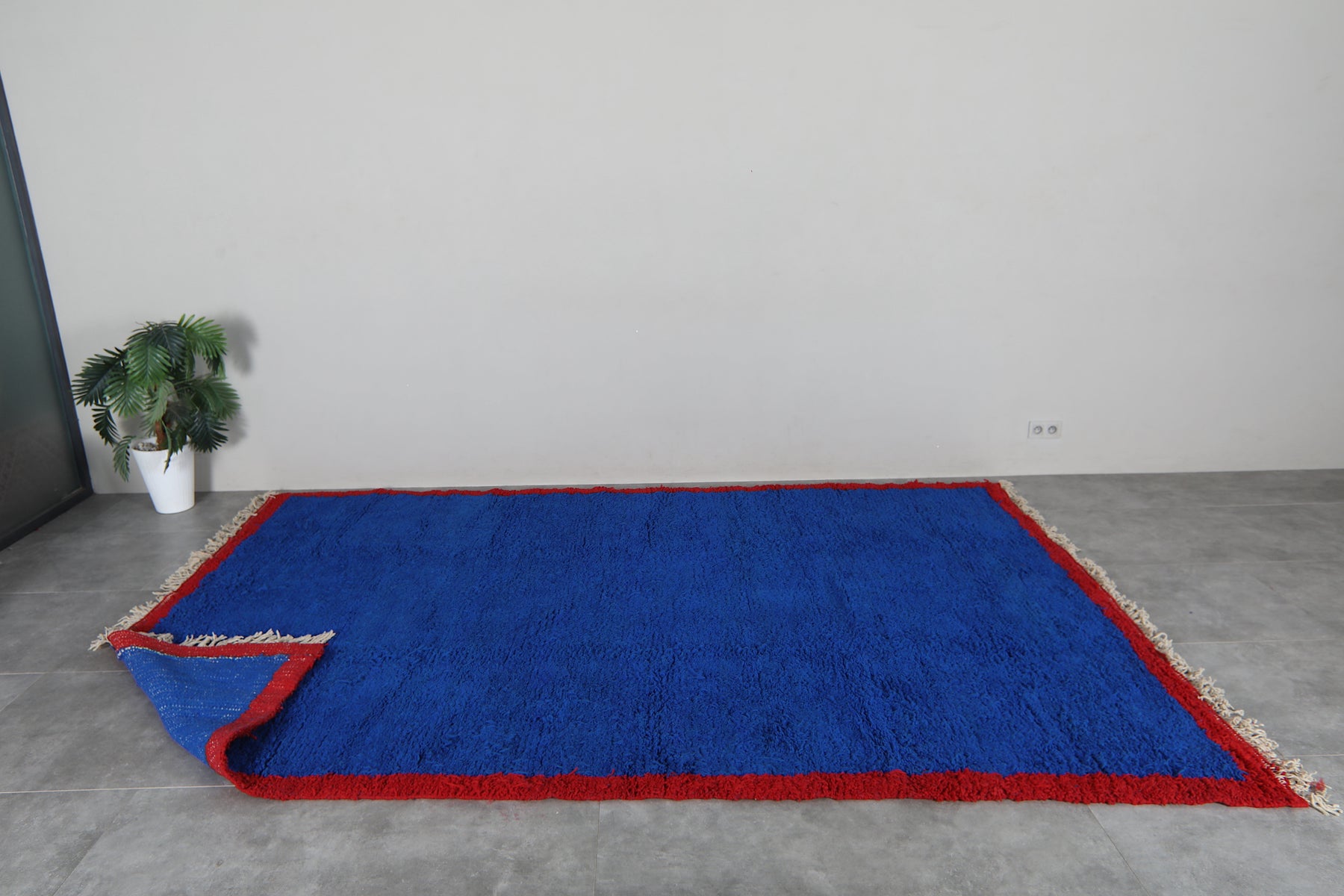 Make a bold statement with this striking handmade Moroccan Berber rug, featuring a rich deep blue field framed by a vibrant red border. The minimalist design highlights the beauty of color and texture, creating a powerful visual contrast that feels both modern and timeless. Handwoven from natural wool by skilled Amazigh (Berber) artisans, the rug offers a plush, soft surface underfoot while maintaining durability for everyday use. Its large size and dramatic palette make it ideal for living rooms, studios, or open spaces where a strong focal point is desired. The combination of vivid blue and warm red brings energy, warmth, and authentic craftsmanship into contemporary, eclectic, or bohemian interiors.