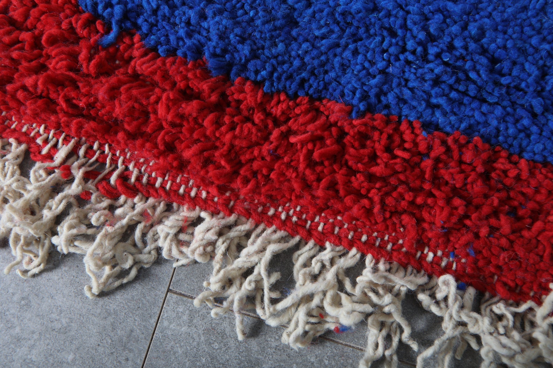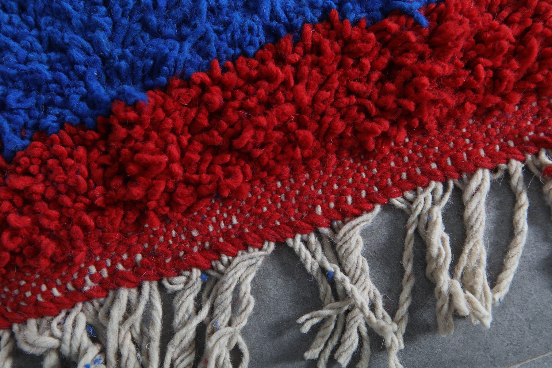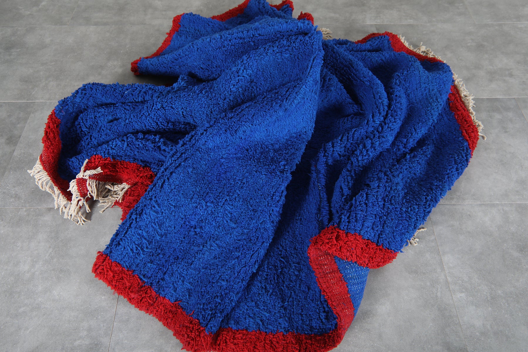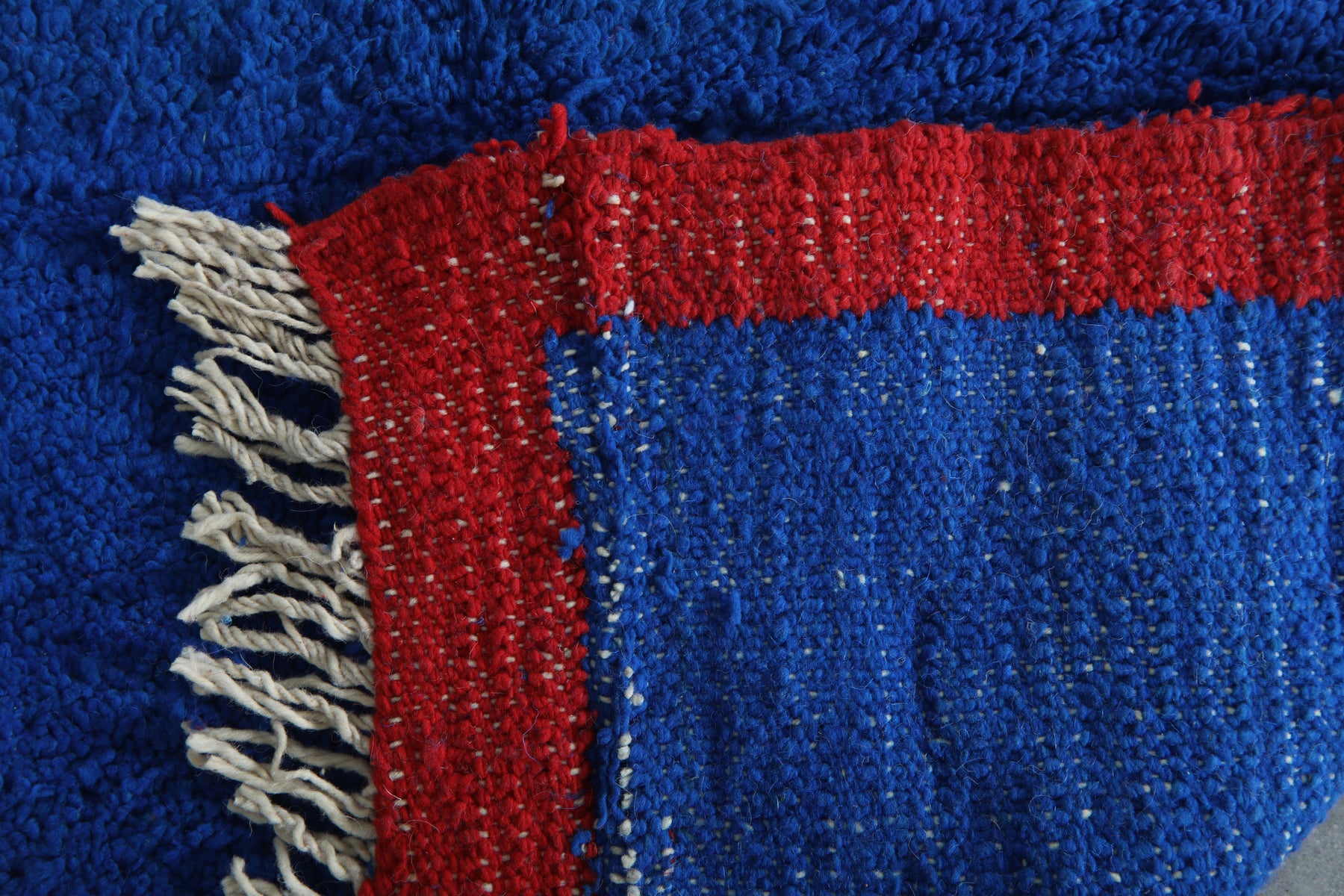 Make a bold statement with this striking handmade Moroccan Berber rug, featuring a rich deep blue field framed by a vibrant red border. The minimalist design highlights the beauty of color and texture, creating a powerful visual contrast that feels both modern and timeless. Handwoven from natural wool by skilled Amazigh (Berber) artisans, the rug offers a plush, soft surface underfoot while maintaining durability for everyday use. Its large size and dramatic palette make it ideal for living rooms, studios, or open spaces where a strong focal point is desired. The combination of vivid blue and warm red brings energy, warmth, and authentic craftsmanship into contemporary, eclectic, or bohemian interiors.