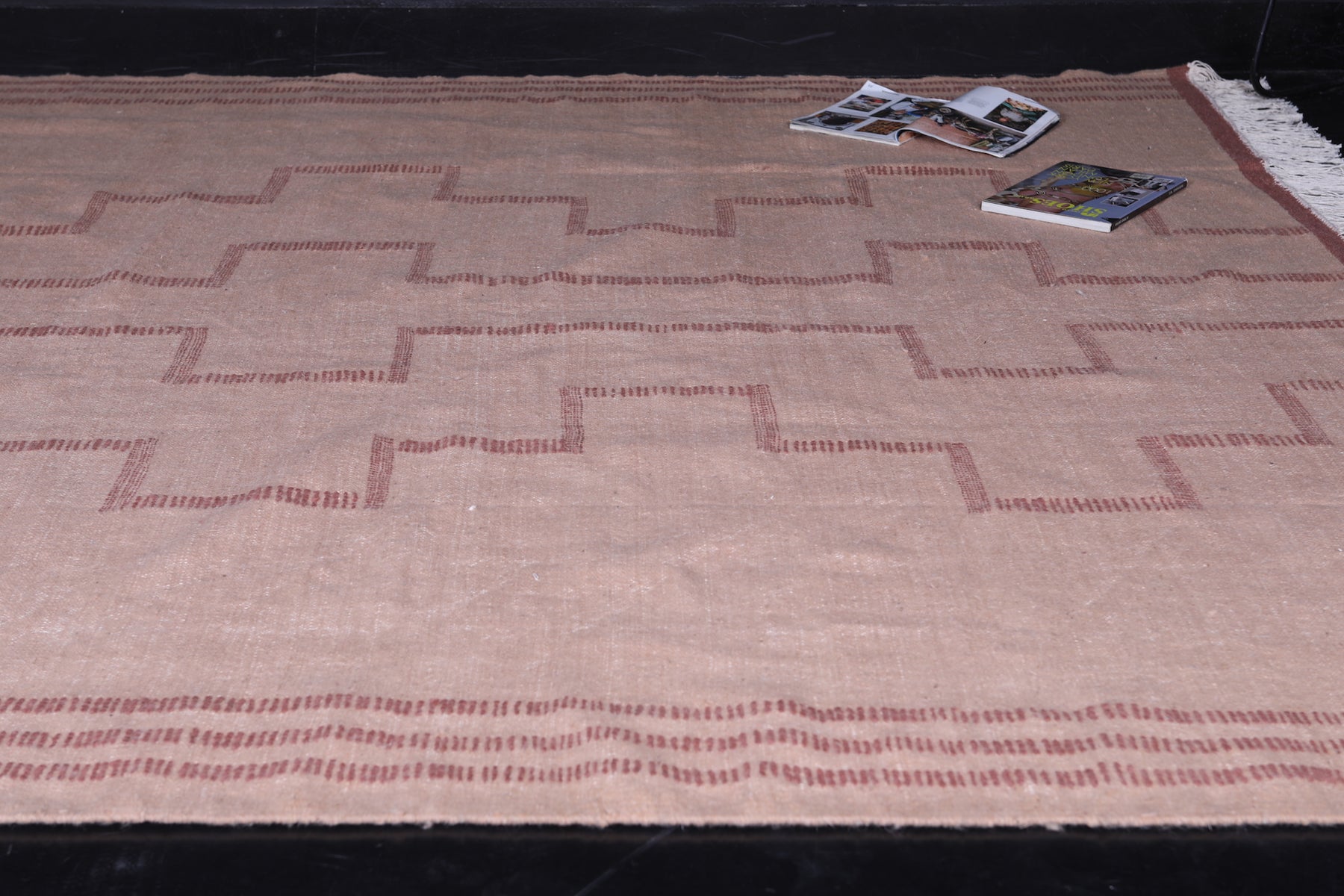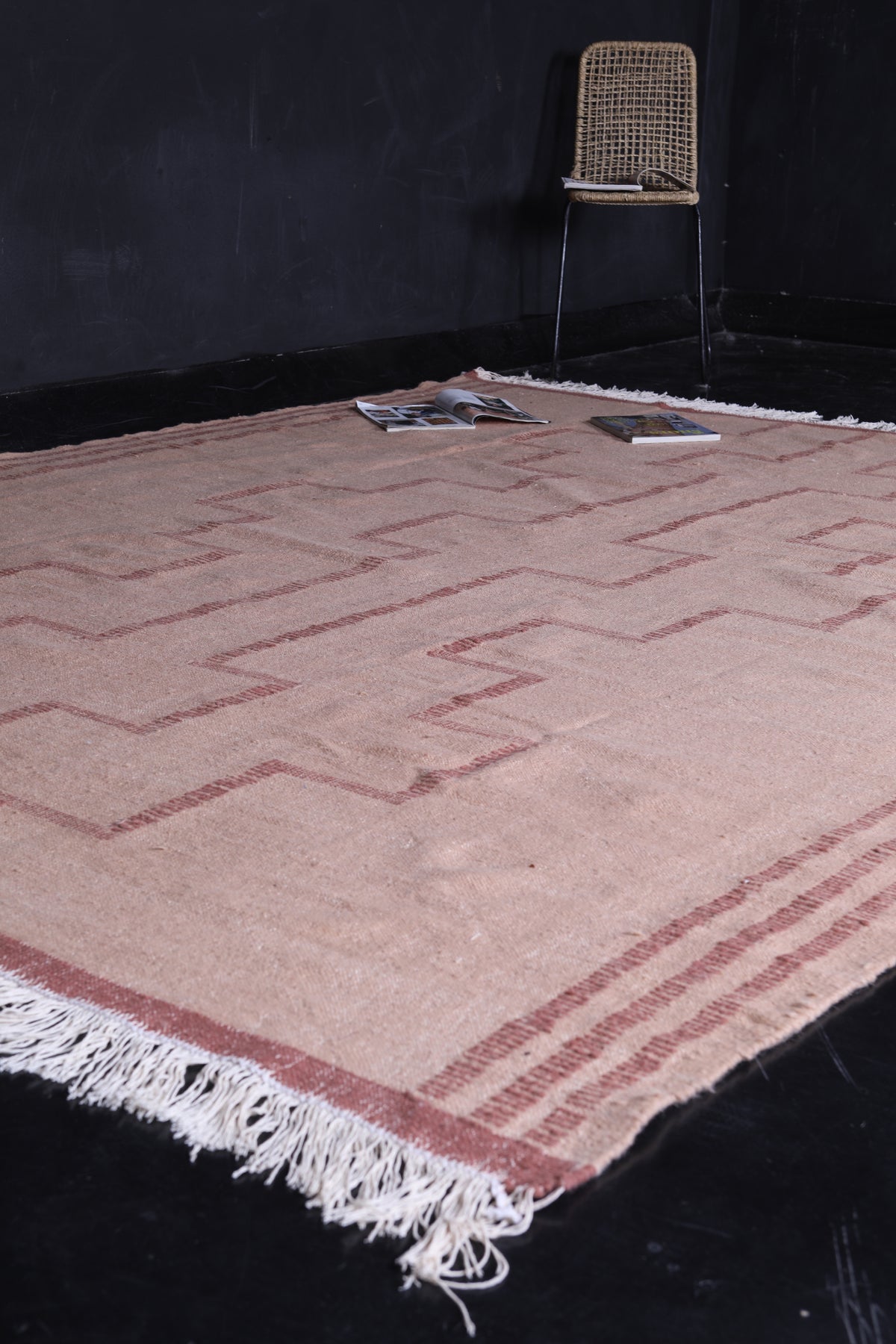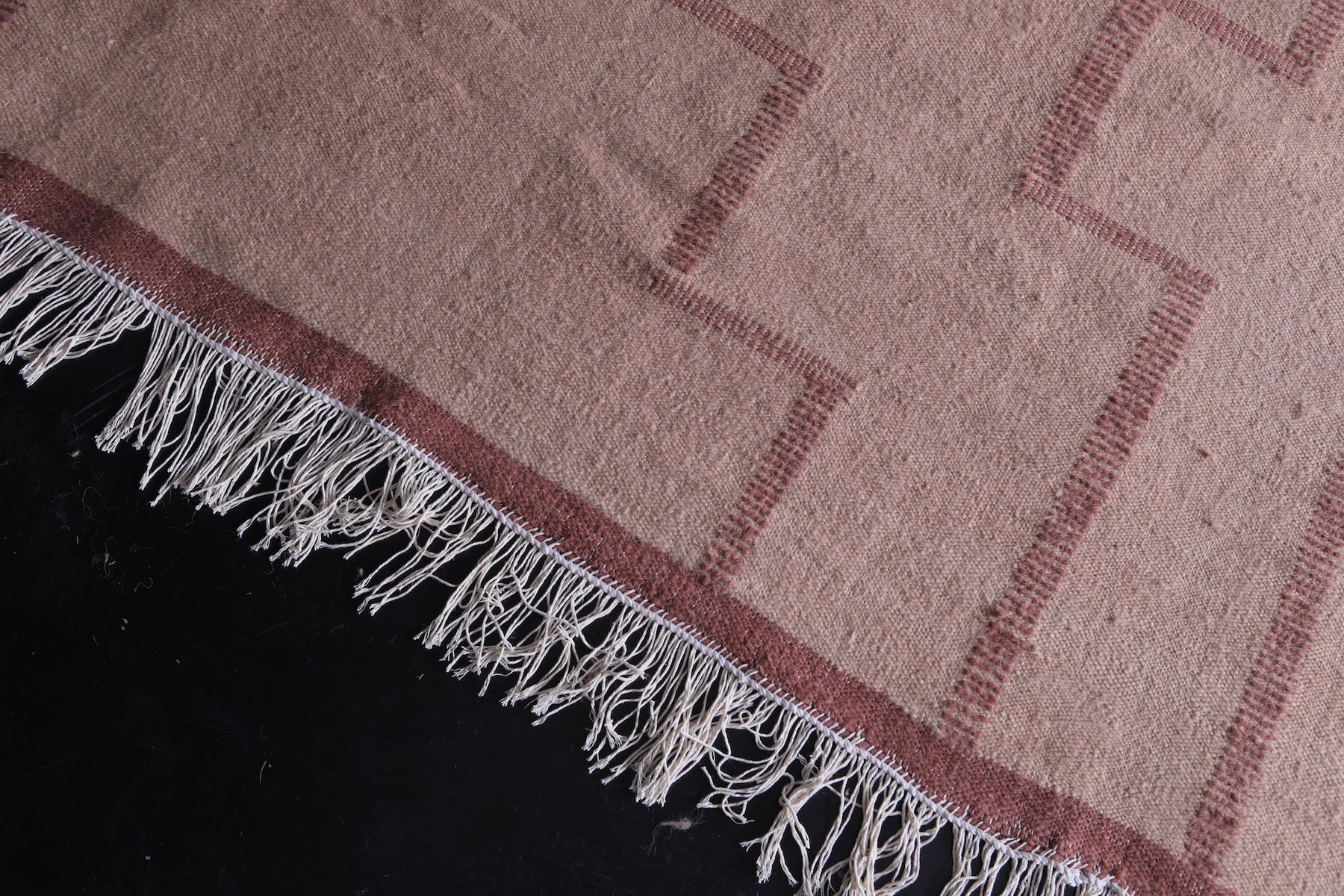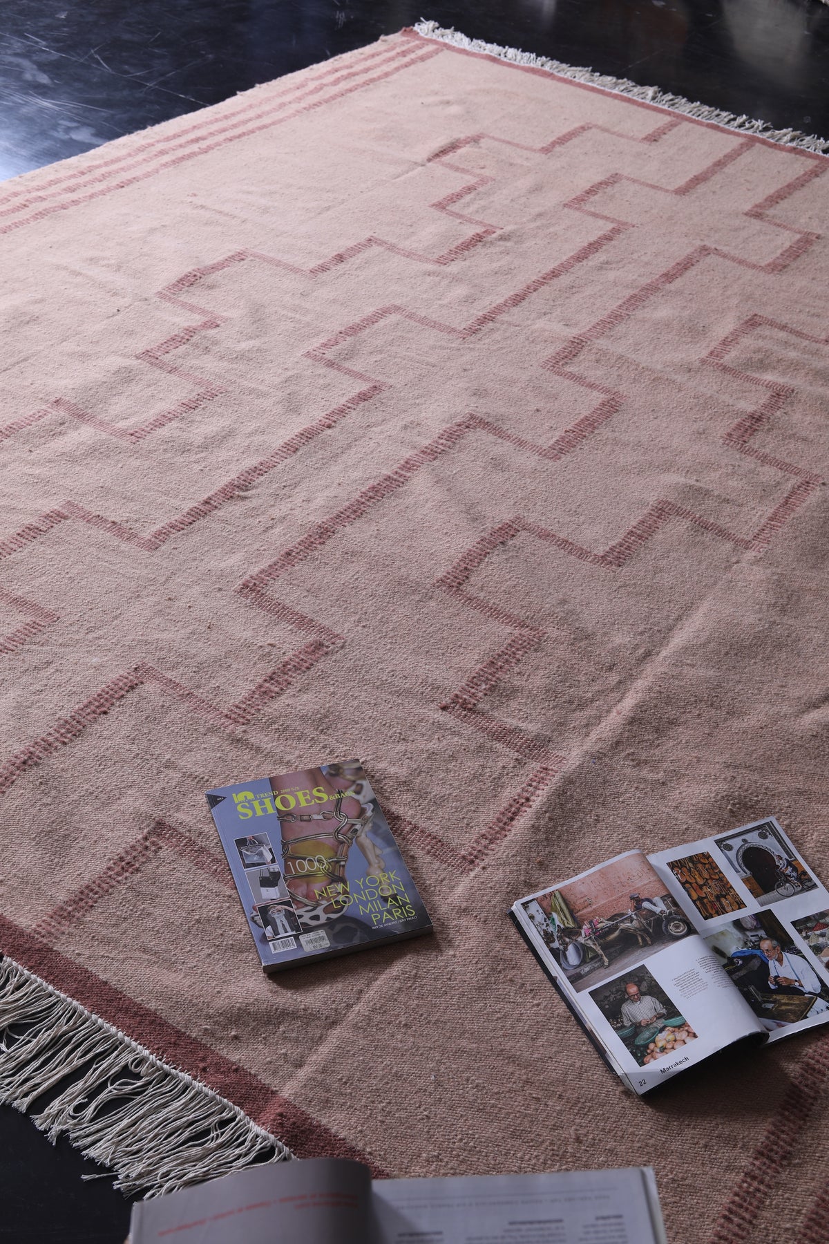Add a touch of elegance to your space with this handmade pink flat-woven Moroccan rug, featuring a subtle geometric pattern and soft blush hue. Woven with 100% natural wool, this lightweight yet resilient rug is perfect for layering or adding warmth and texture to any room. Suitable for minimalistic, boho, and modern decoration, this flatweave design exudes style along with functionality. Ethically woven by skilled Moroccan artisans, each one is unique and sustainably made.