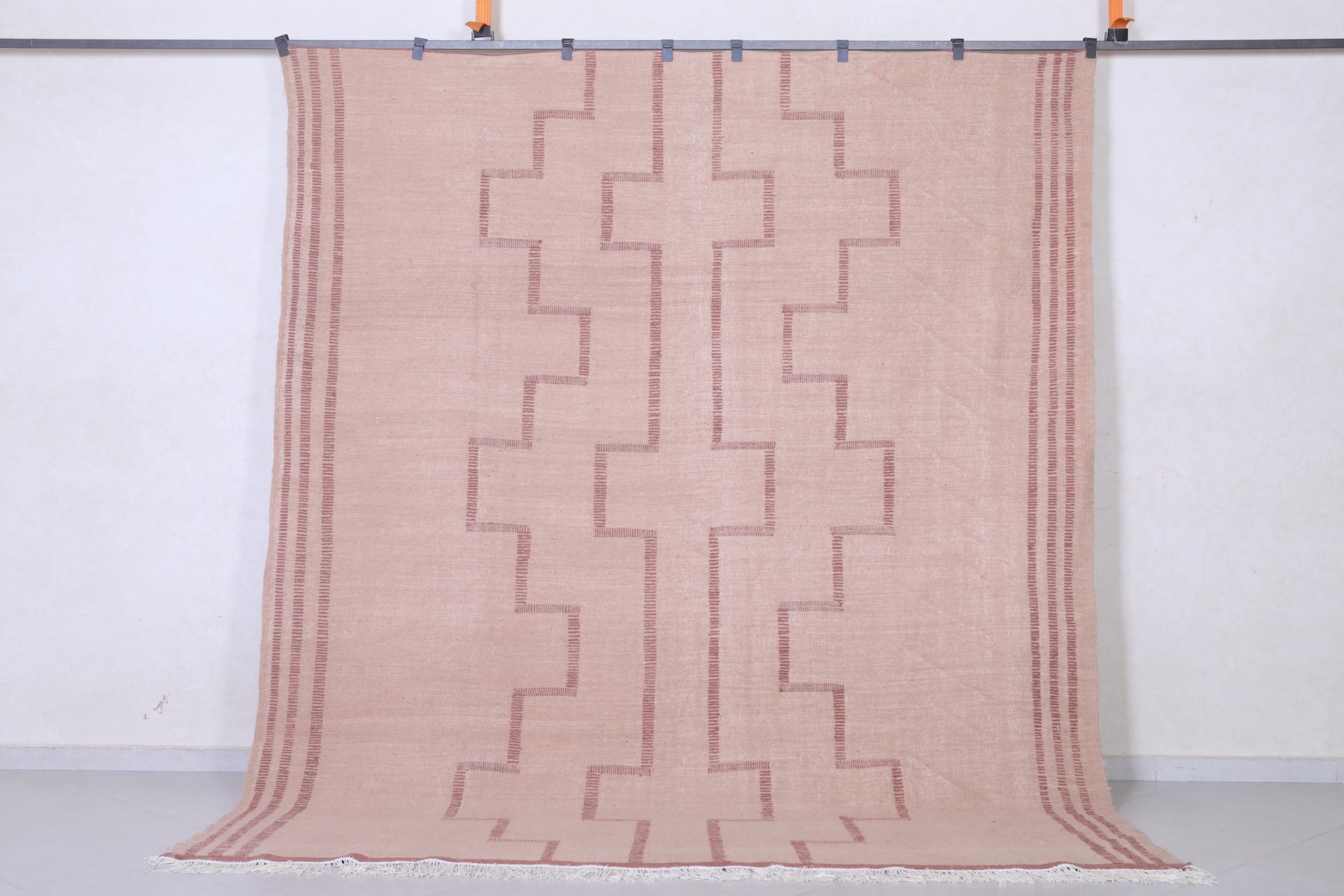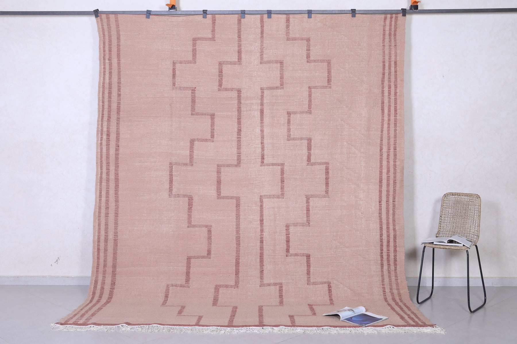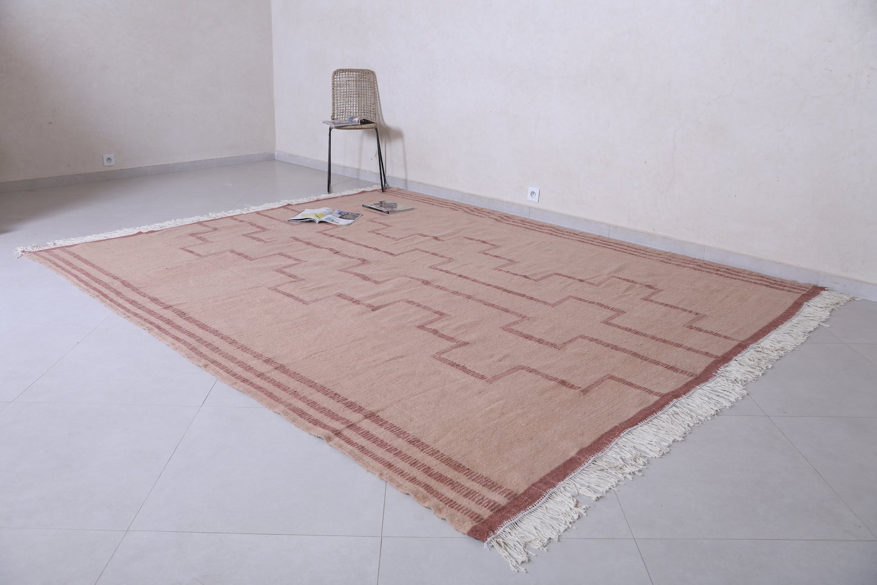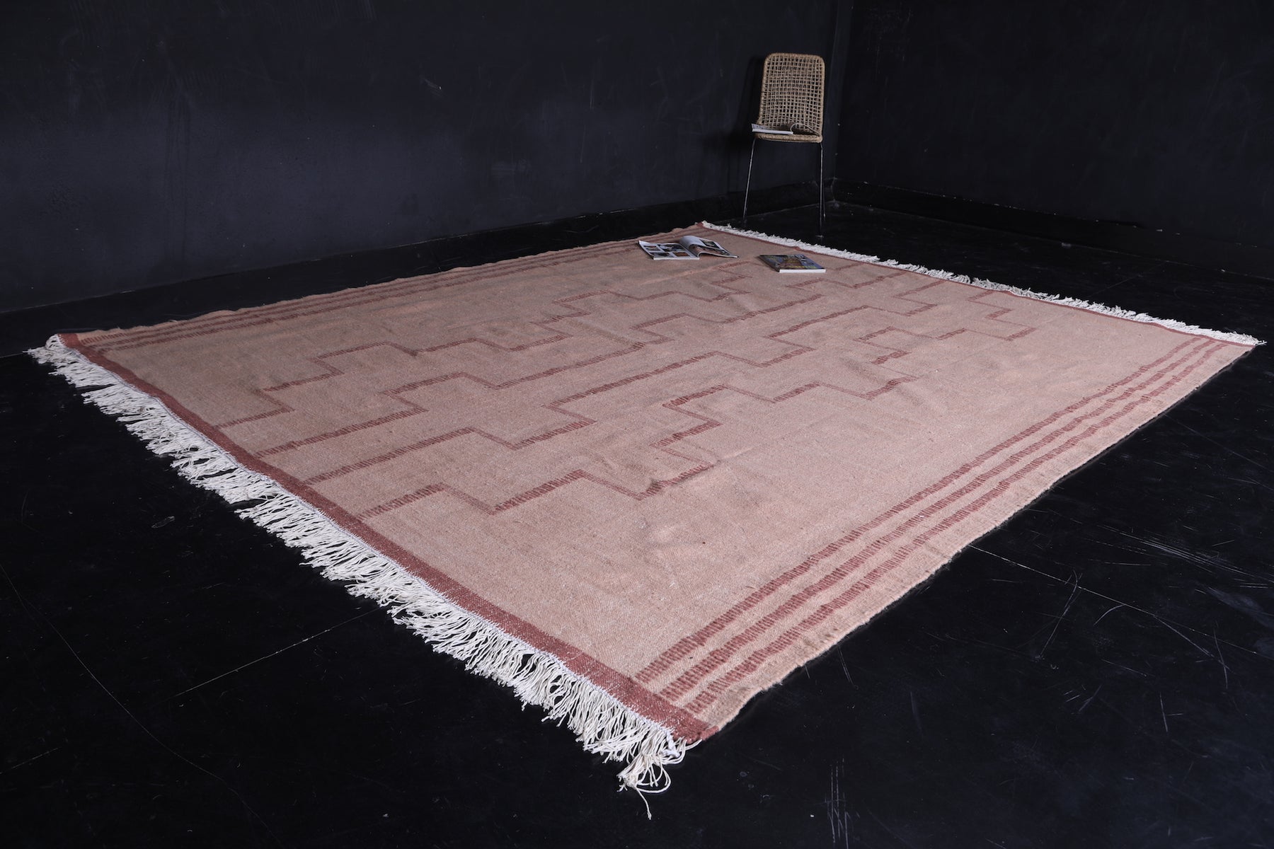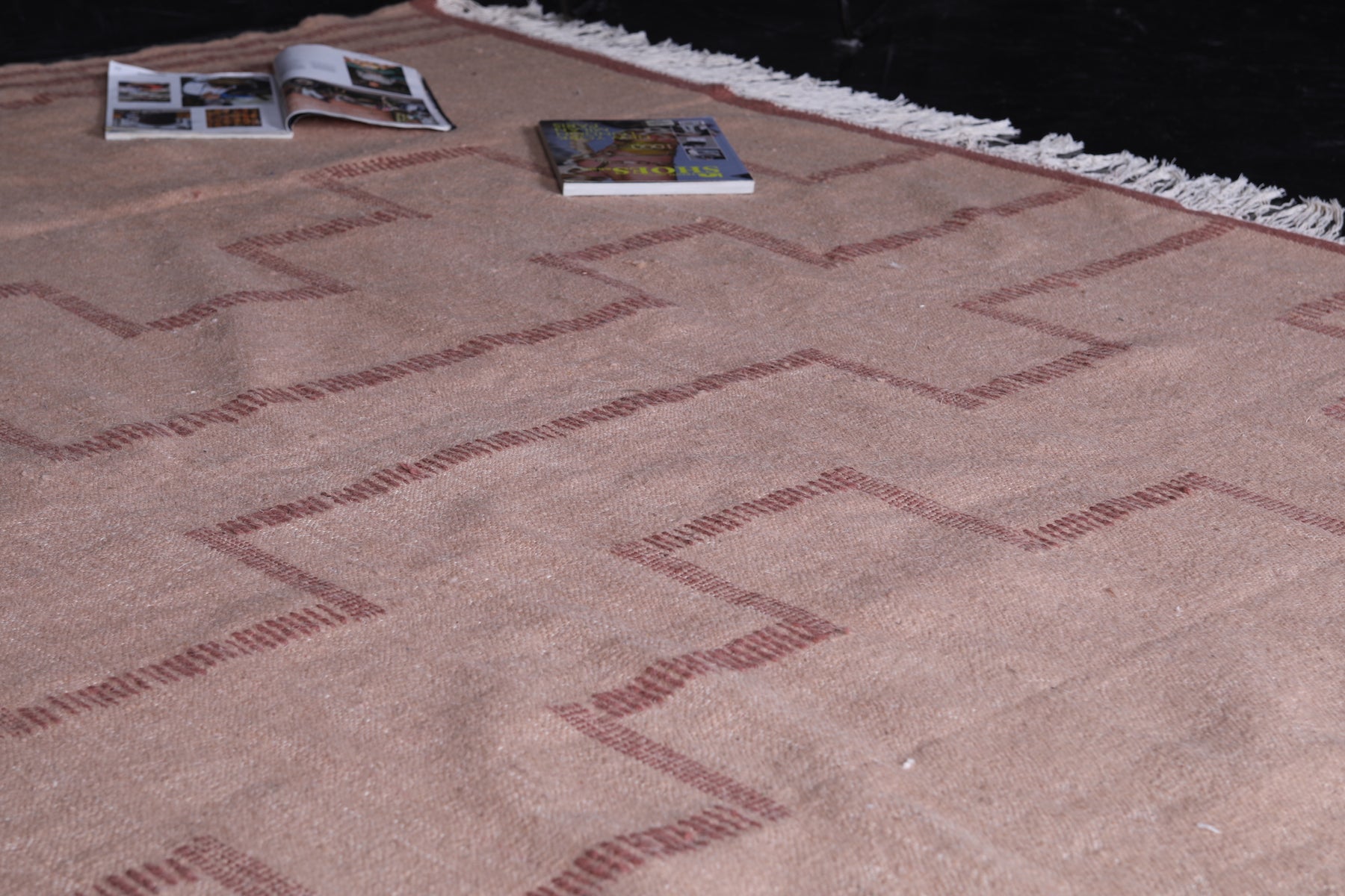 Add a touch of elegance to your space with this handmade pink flat-woven Moroccan rug, featuring a subtle geometric pattern and soft blush hue. Woven with 100% natural wool, this lightweight yet resilient rug is perfect for layering or adding warmth and texture to any room. Suitable for minimalistic, boho, and modern decoration, this flatweave design exudes style along with functionality. Ethically woven by skilled Moroccan artisans, each one is unique and sustainably made.
