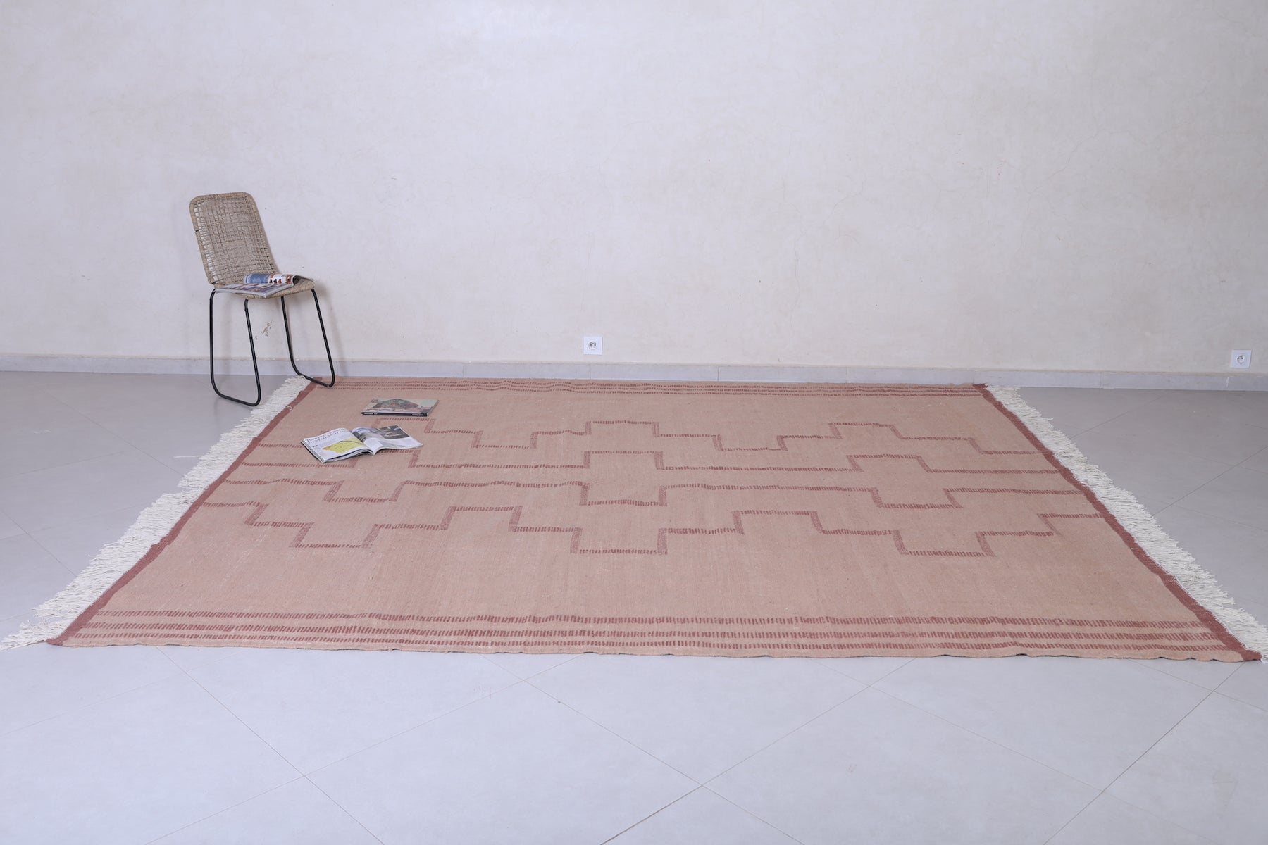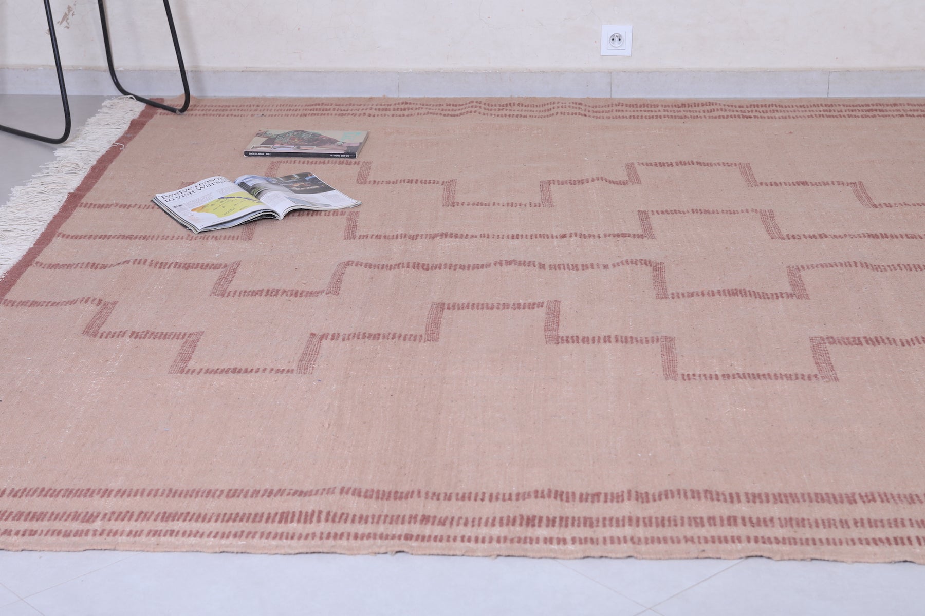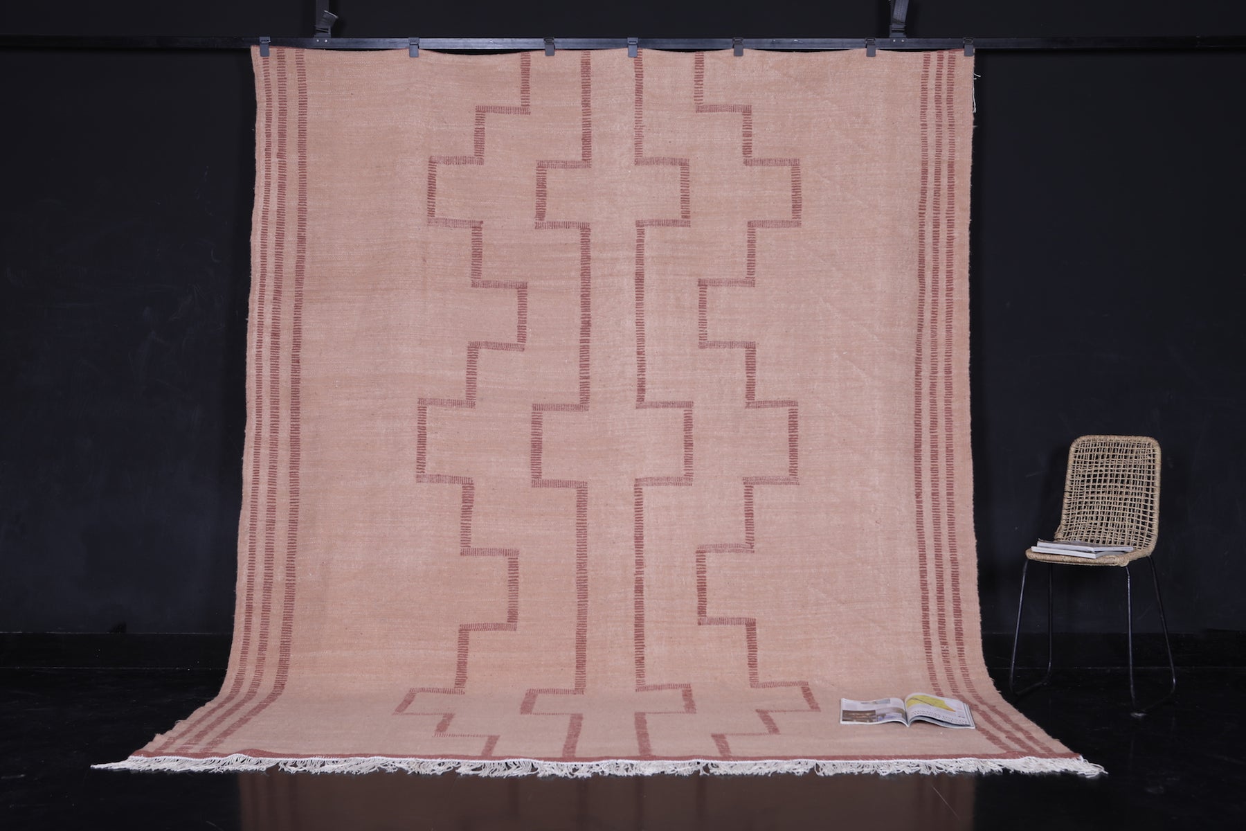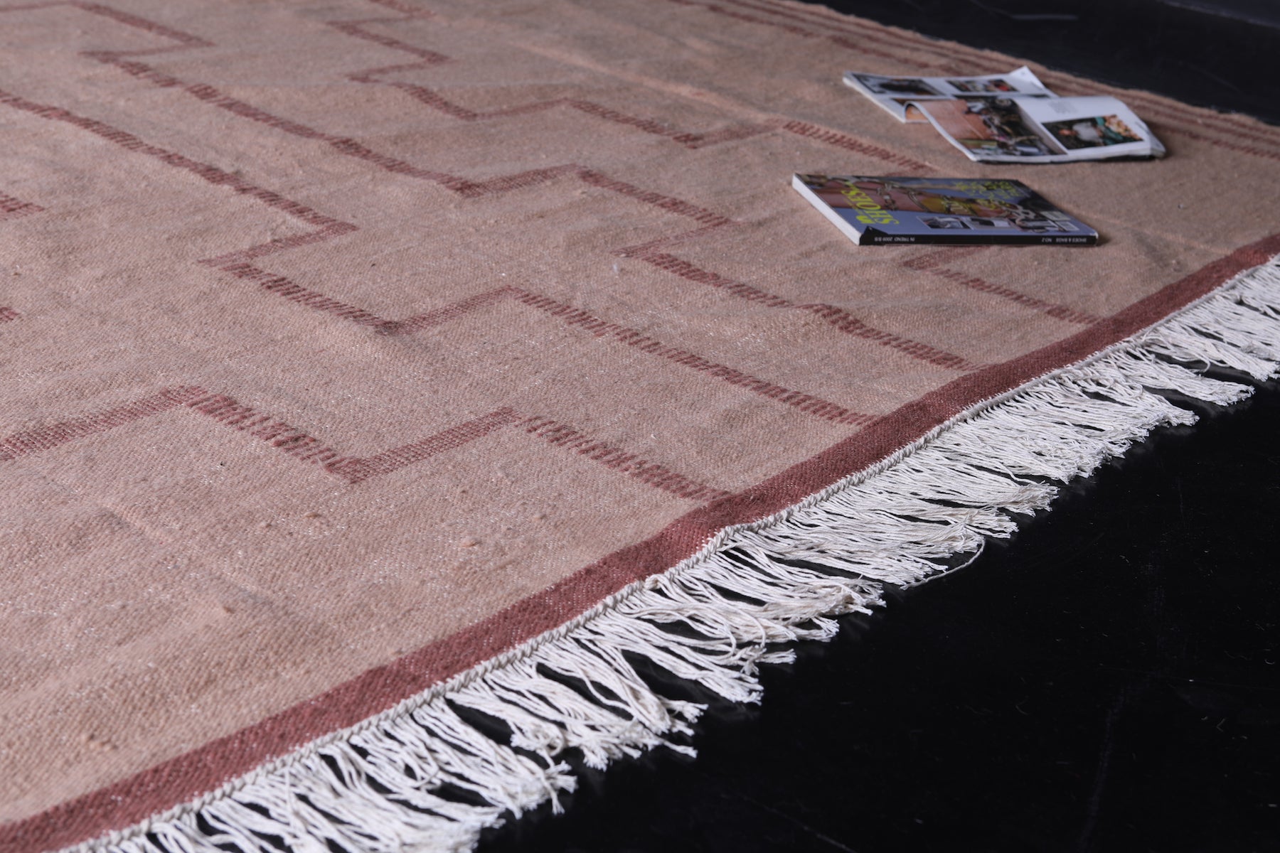 Add a touch of elegance to your space with this handmade pink flat-woven Moroccan rug, featuring a subtle geometric pattern and soft blush hue. Woven with 100% natural wool, this lightweight yet resilient rug is perfect for layering or adding warmth and texture to any room. Suitable for minimalistic, boho, and modern decoration, this flatweave design exudes style along with functionality. Ethically woven by skilled Moroccan artisans, each one is unique and sustainably made.