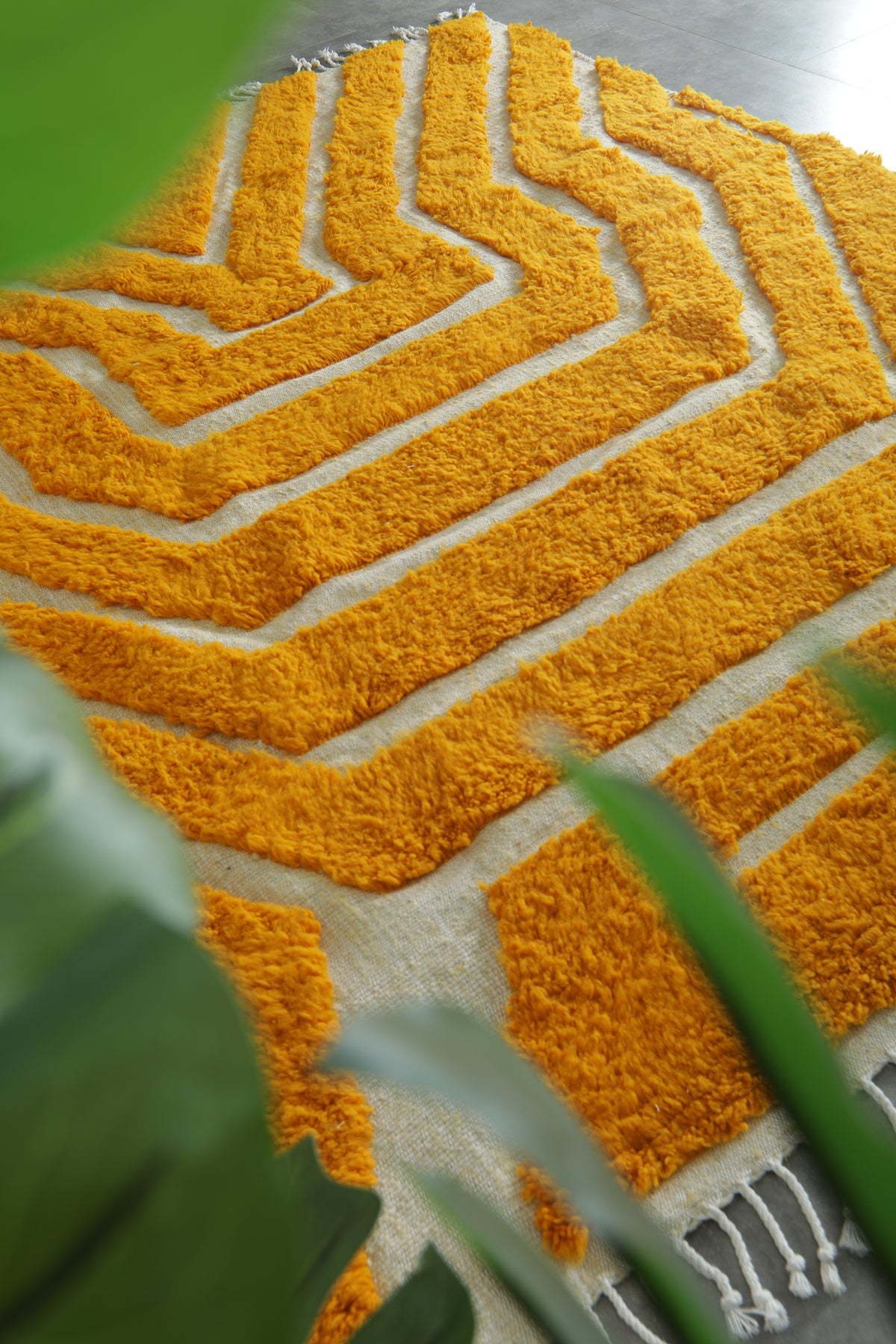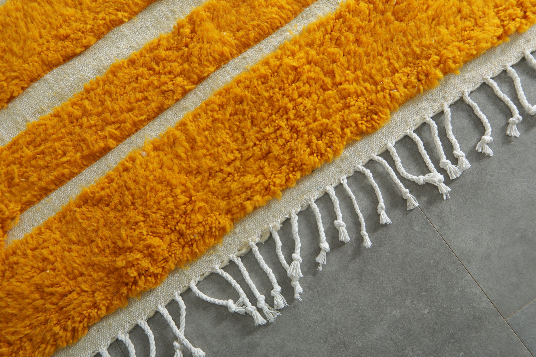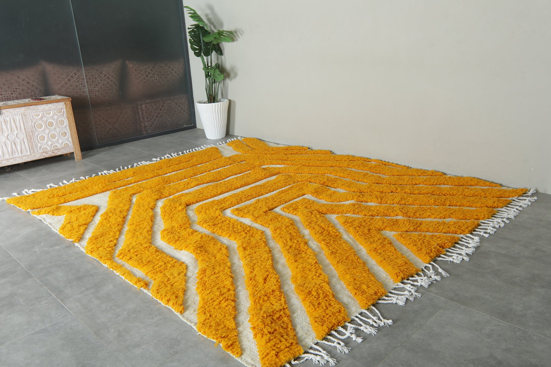 Brighten your space with this stunning Yellow and White Geometric Moroccan Rug, handcrafted by skilled Berber artisans in the Atlas Mountains. Featuring bold, angular geometric lines in a vibrant yellow on a soft white background, this contemporary design delivers both energy and style to any modern home.