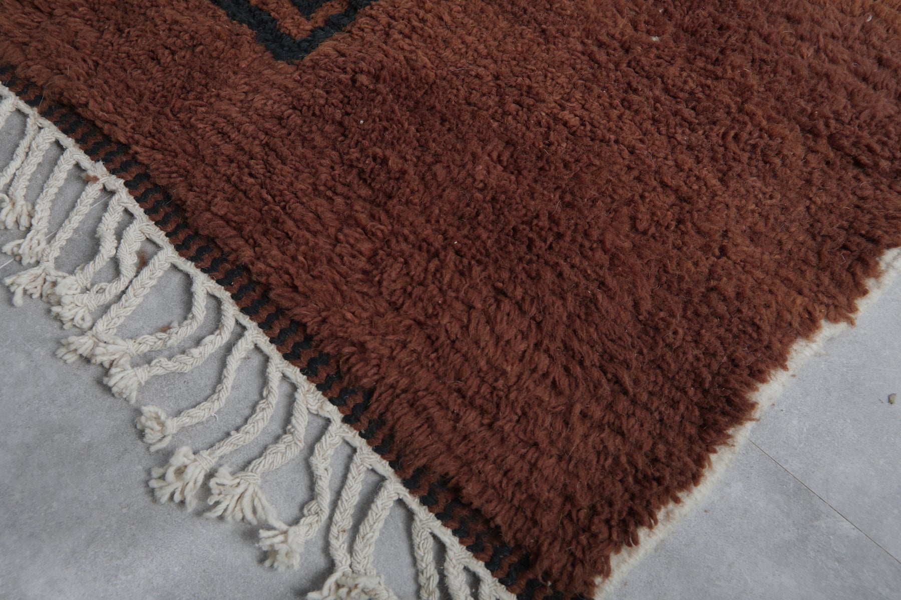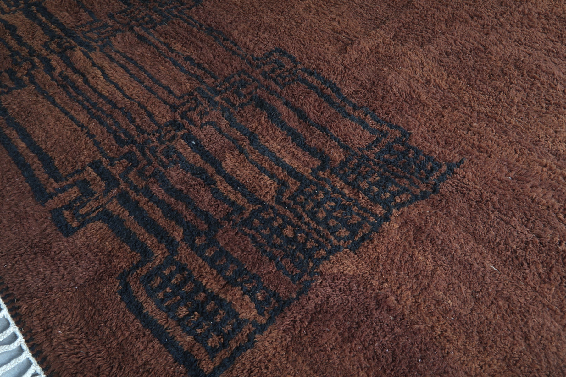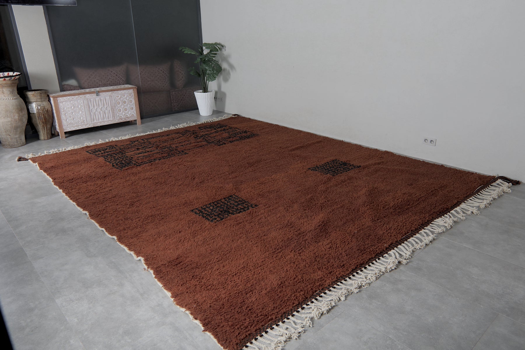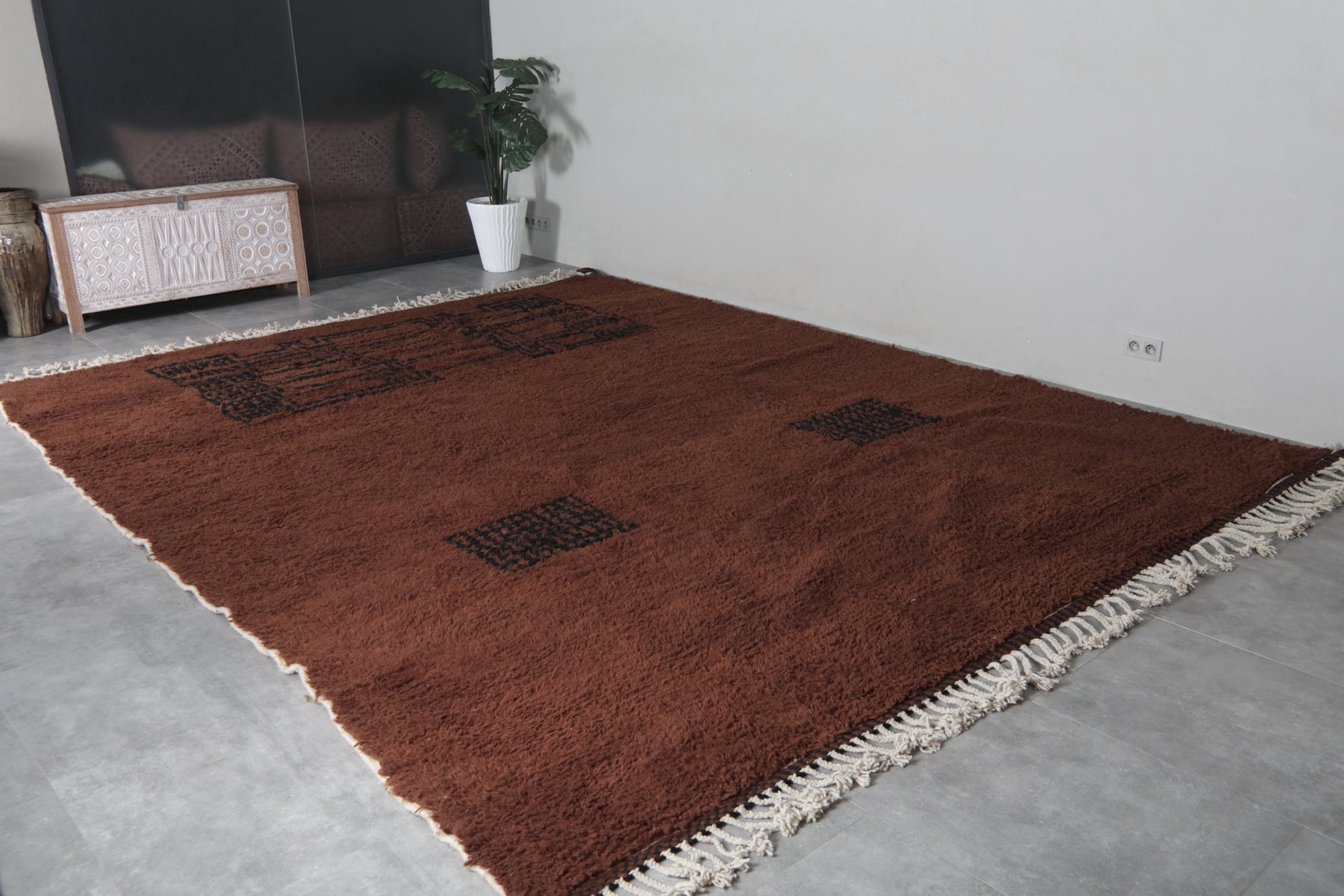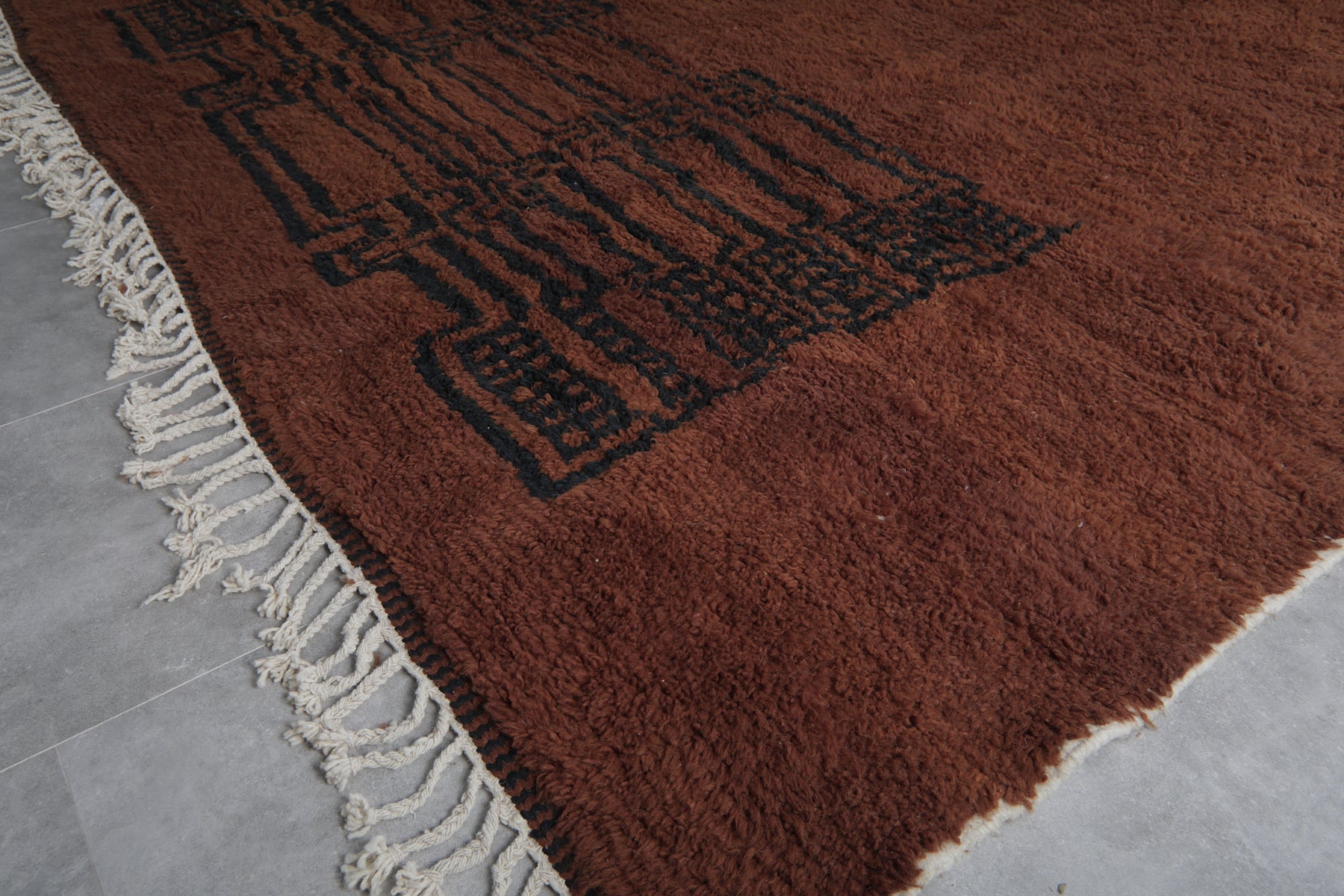 Introduce rich warmth and timeless elegance to your space with this stunning handmade Moroccan Berber rug. Featuring a deep chocolate-brown field accented by subtle black tribal motifs, including geometric panels and symbolic forms, this piece embodies authentic Amazigh (Berber) artistry in a minimalist, sophisticated way. The plush wool pile creates a luxuriously soft texture underfoot while the earthy tones provide a grounding presence that complements both modern and rustic interiors. Its generous size makes it perfect for large living rooms, open-concept spaces, or statement areas where comfort and character are essential. Handwoven by skilled artisans using natural wool, this rug is a one-of-a-kind blend of tradition, durability, and understated beauty.