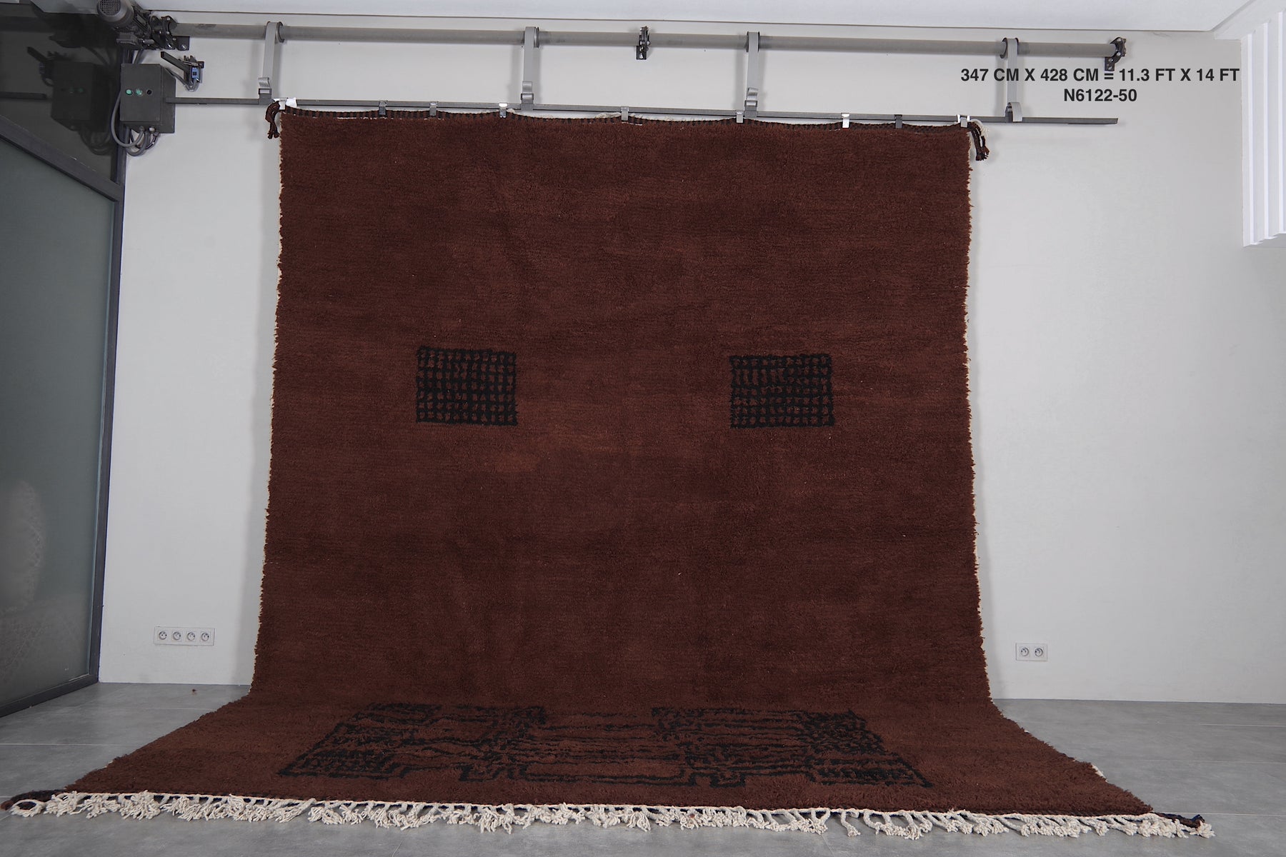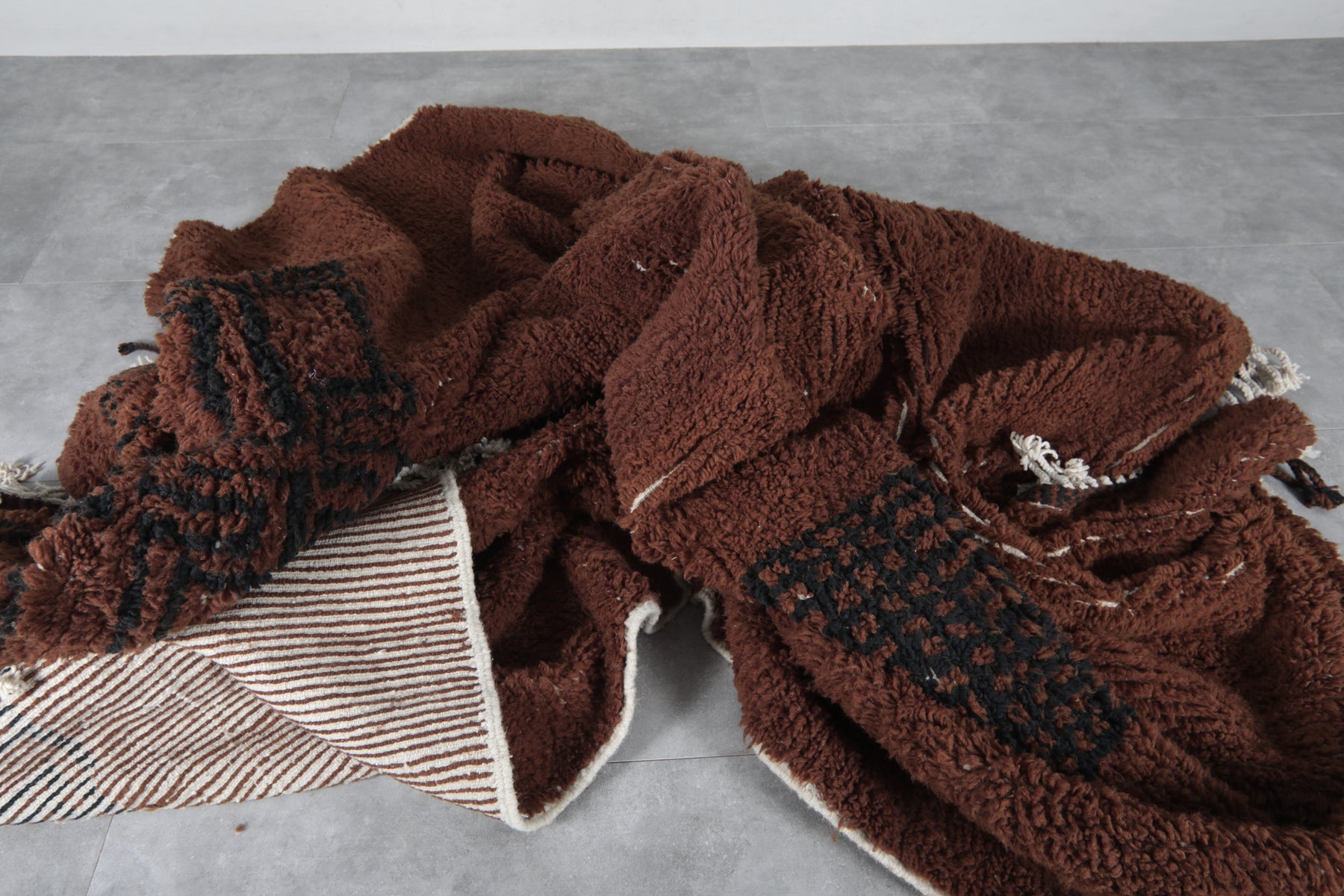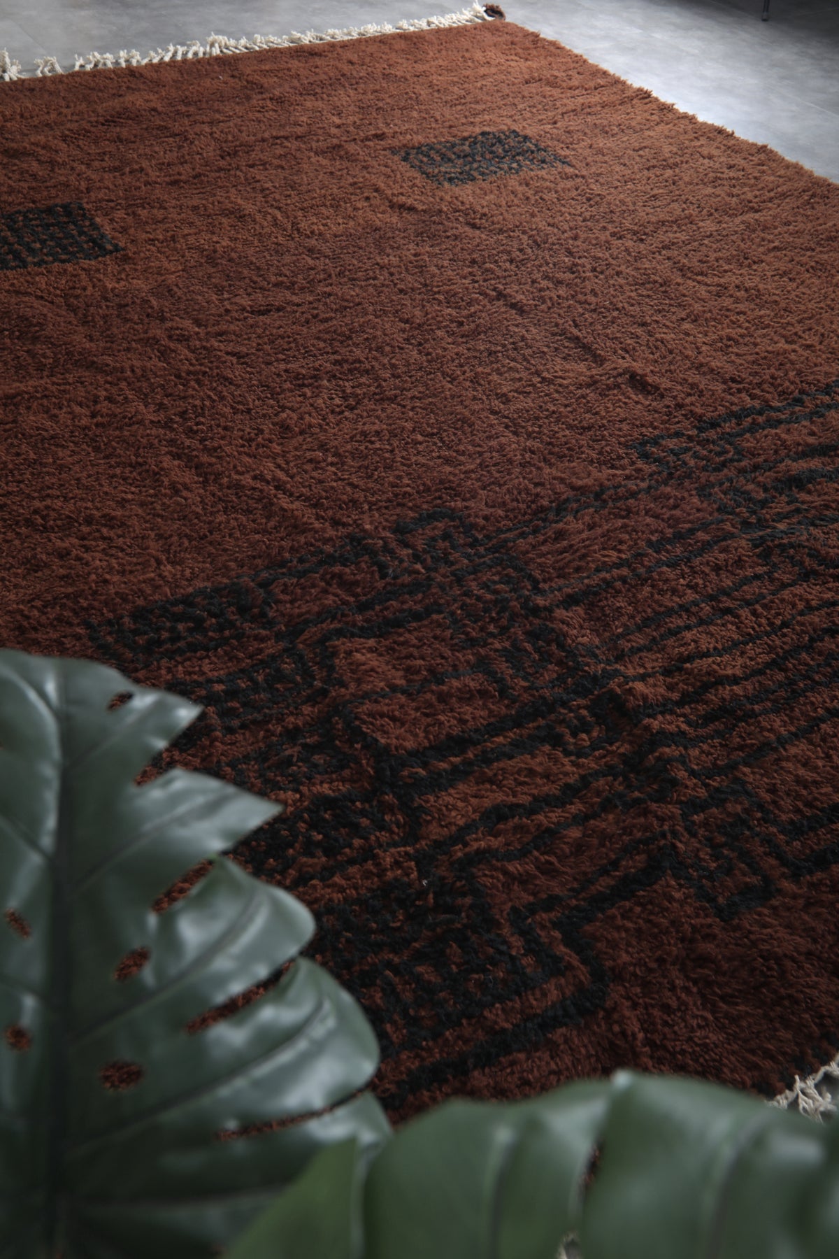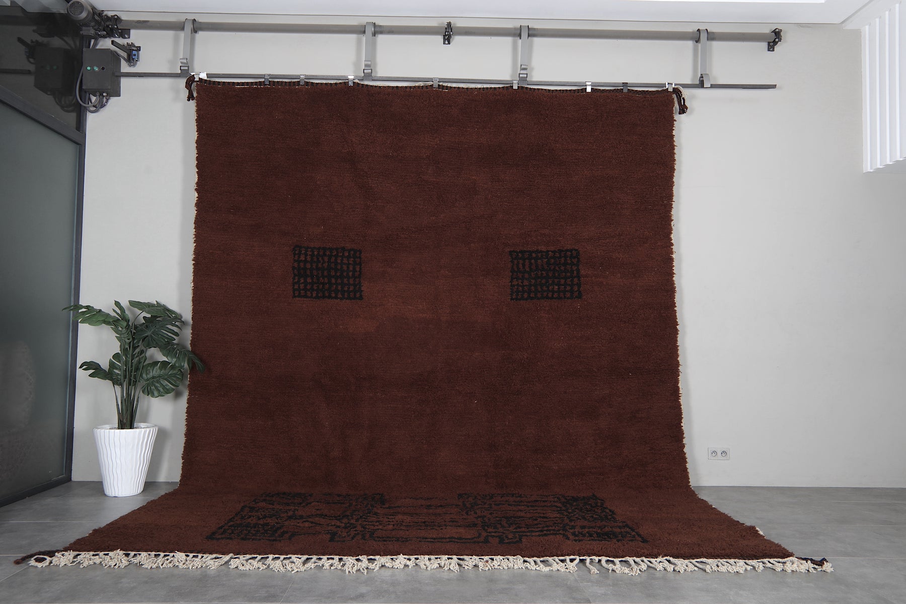 Introduce rich warmth and timeless elegance to your space with this stunning handmade Moroccan Berber rug. Featuring a deep chocolate-brown field accented by subtle black tribal motifs, including geometric panels and symbolic forms, this piece embodies authentic Amazigh (Berber) artistry in a minimalist, sophisticated way. The plush wool pile creates a luxuriously soft texture underfoot while the earthy tones provide a grounding presence that complements both modern and rustic interiors. Its generous size makes it perfect for large living rooms, open-concept spaces, or statement areas where comfort and character are essential. Handwoven by skilled artisans using natural wool, this rug is a one-of-a-kind blend of tradition, durability, and understated beauty.