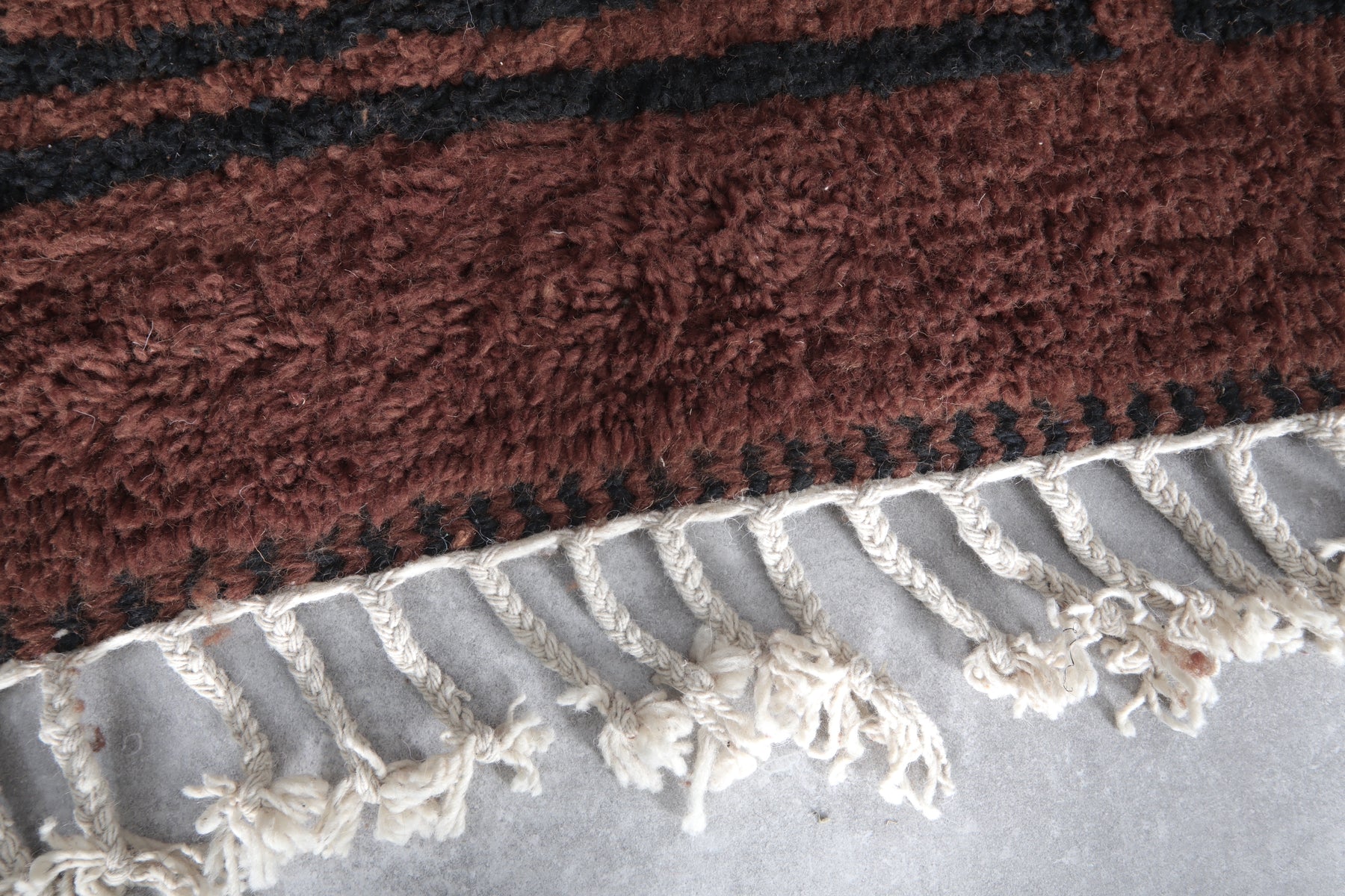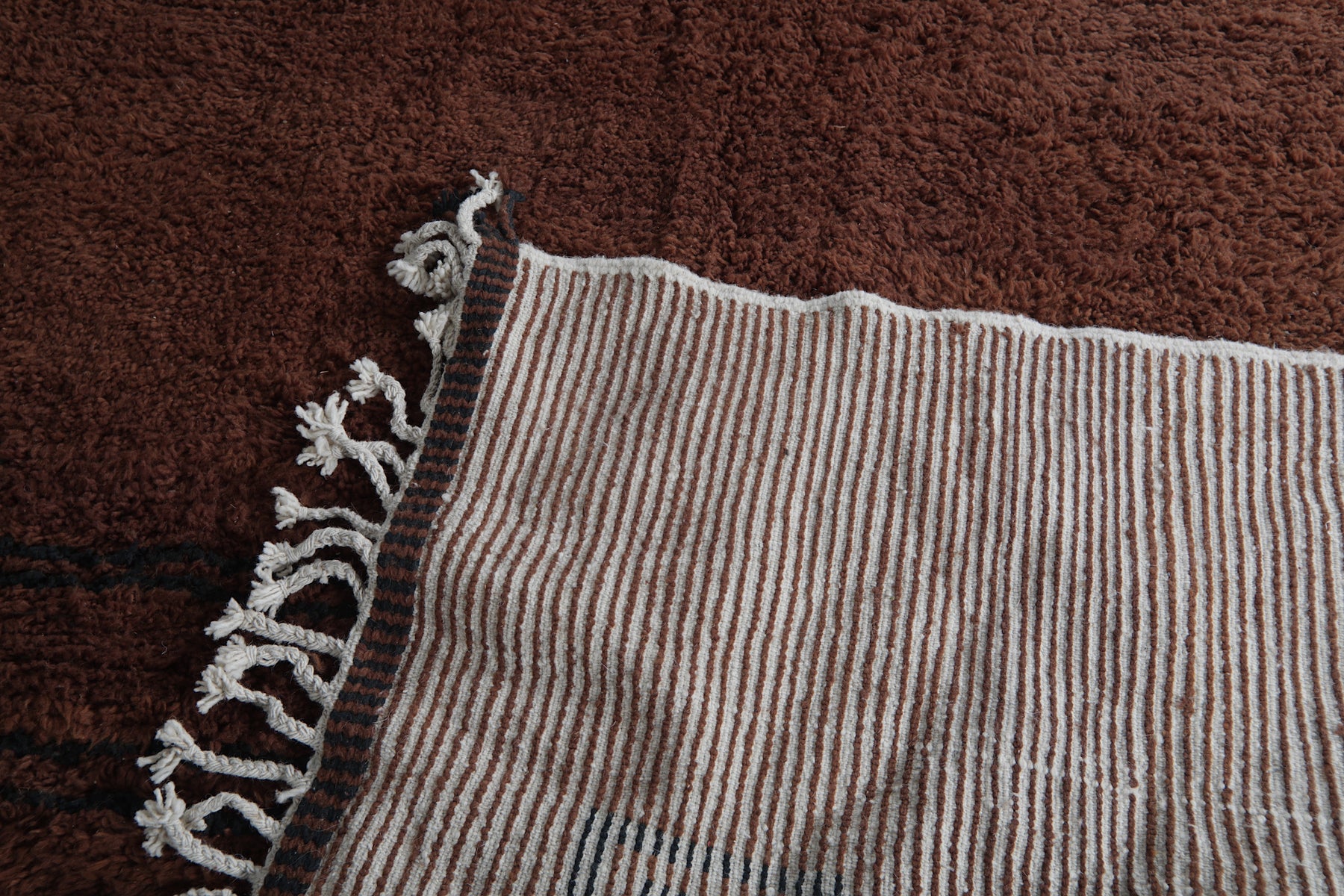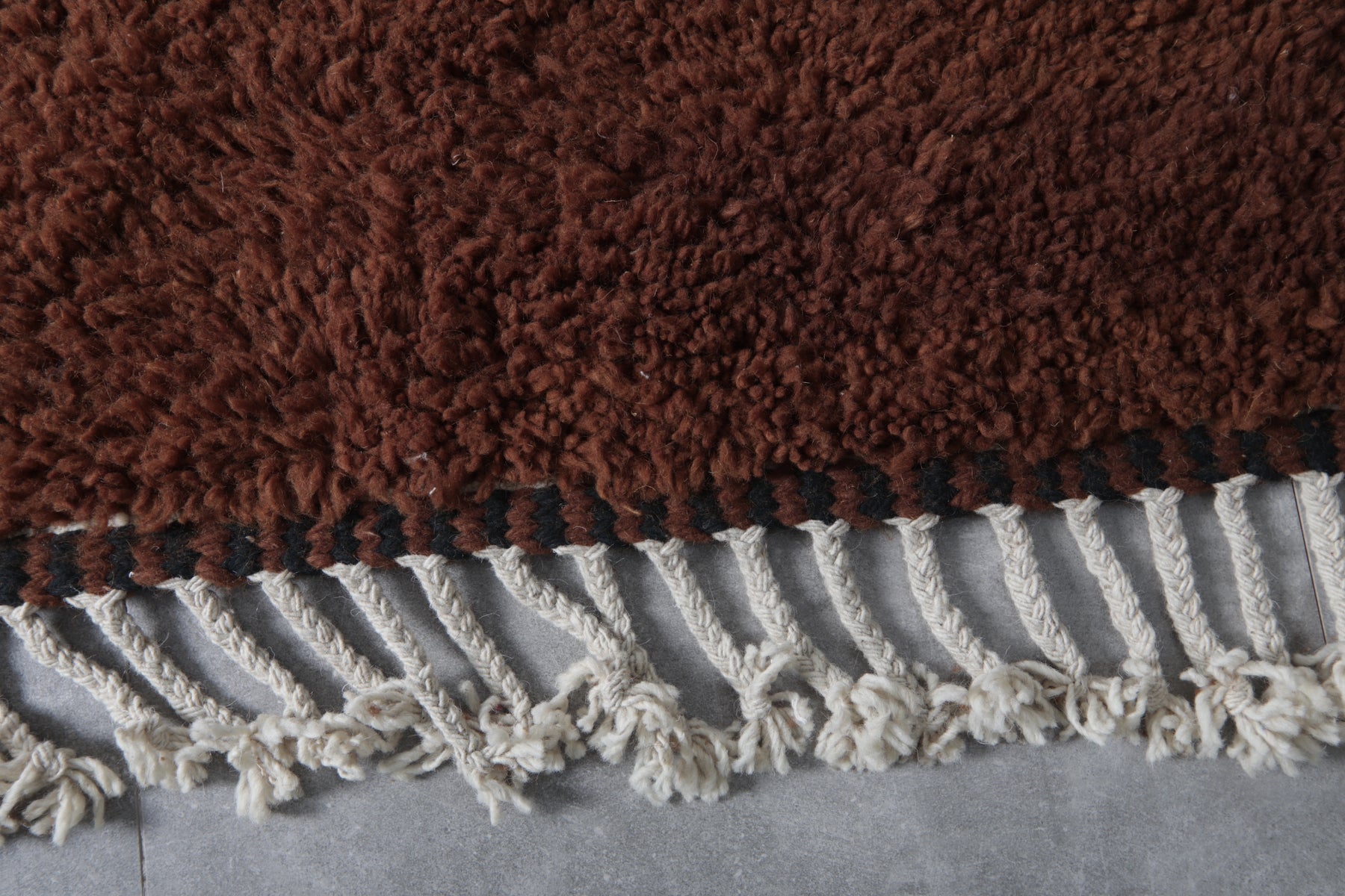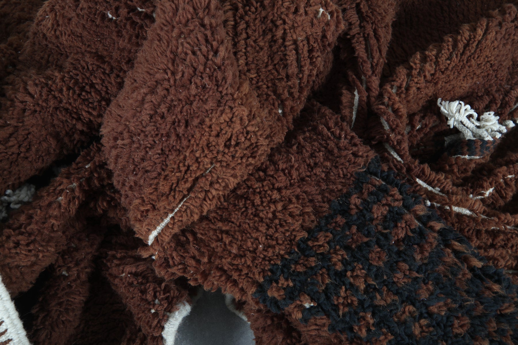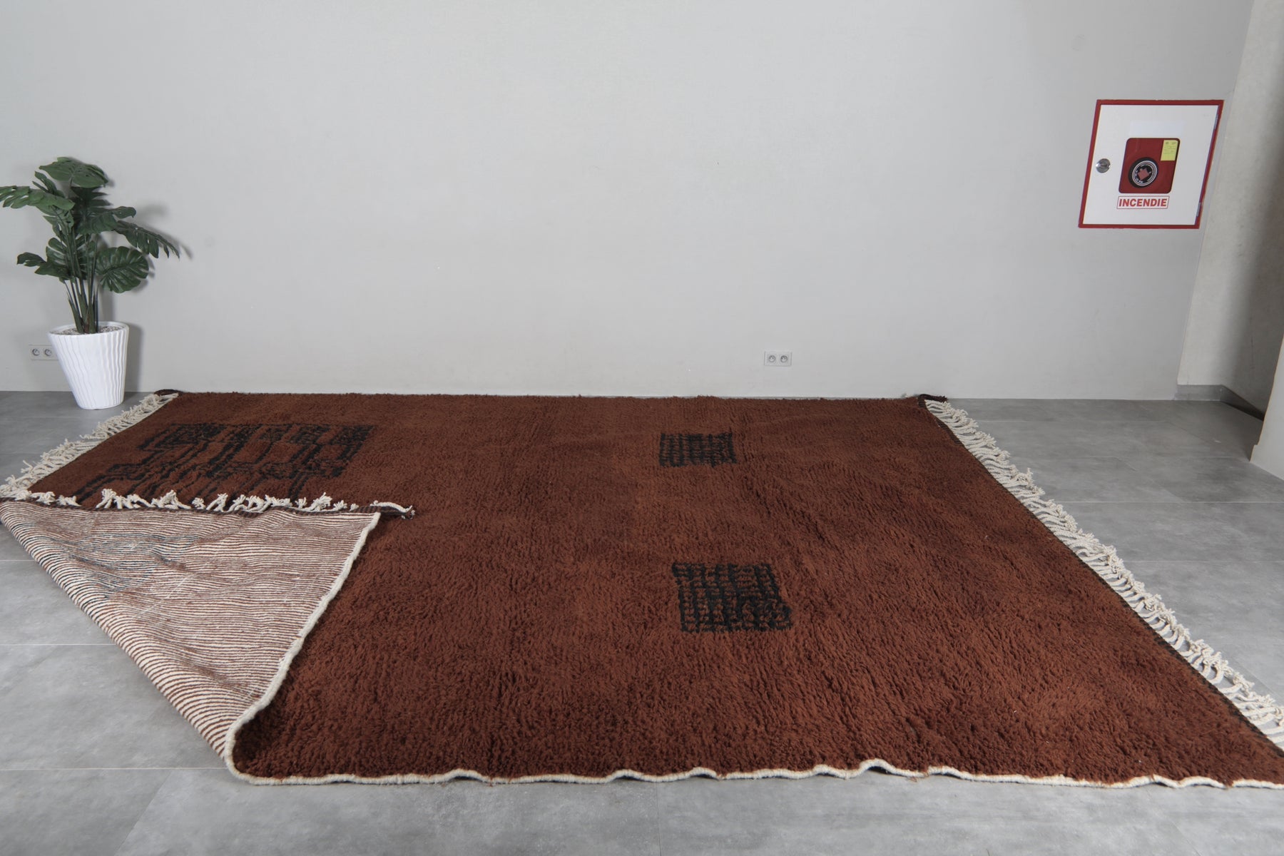 Introduce rich warmth and timeless elegance to your space with this stunning handmade Moroccan Berber rug. Featuring a deep chocolate-brown field accented by subtle black tribal motifs, including geometric panels and symbolic forms, this piece embodies authentic Amazigh (Berber) artistry in a minimalist, sophisticated way. The plush wool pile creates a luxuriously soft texture underfoot while the earthy tones provide a grounding presence that complements both modern and rustic interiors. Its generous size makes it perfect for large living rooms, open-concept spaces, or statement areas where comfort and character are essential. Handwoven by skilled artisans using natural wool, this rug is a one-of-a-kind blend of tradition, durability, and understated beauty.