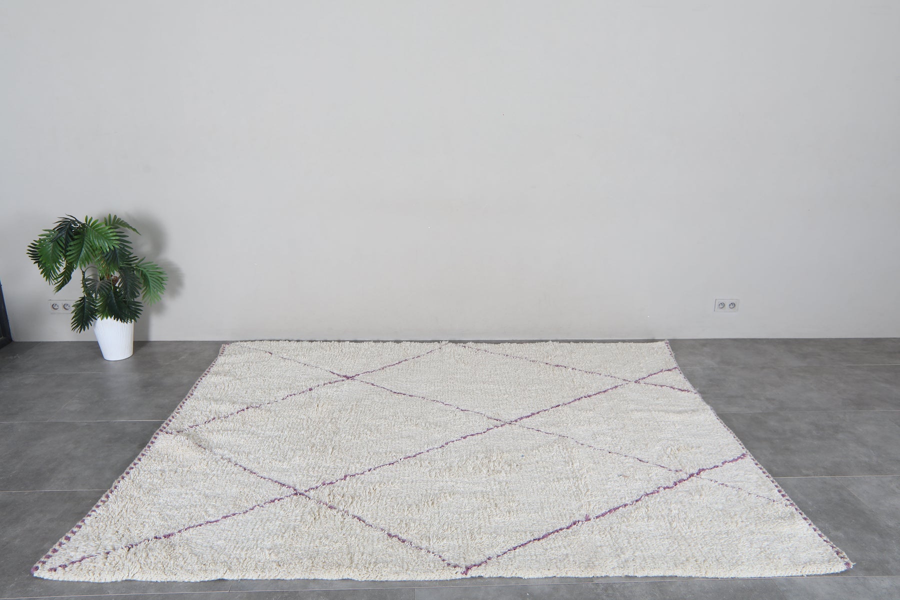 Handcrafted in Morocco, this stunning Beni Ourain rug blends traditional Berber weaving with contemporary style. Featuring an ivory base adorned with distinctive purple geometric lines, this wool carpet brings warmth and character to any space. Each piece is uniquely made by skilled artisans using natural materials, ensuring durability and timeless appeal. Perfect for bohemian, neutral, and eclectic interiors, this rug works beautifully in living rooms, bedrooms, or entryways. Available in custom sizes to fit your exact needs. A genuine investment in authentic Moroccan craftsmanship.