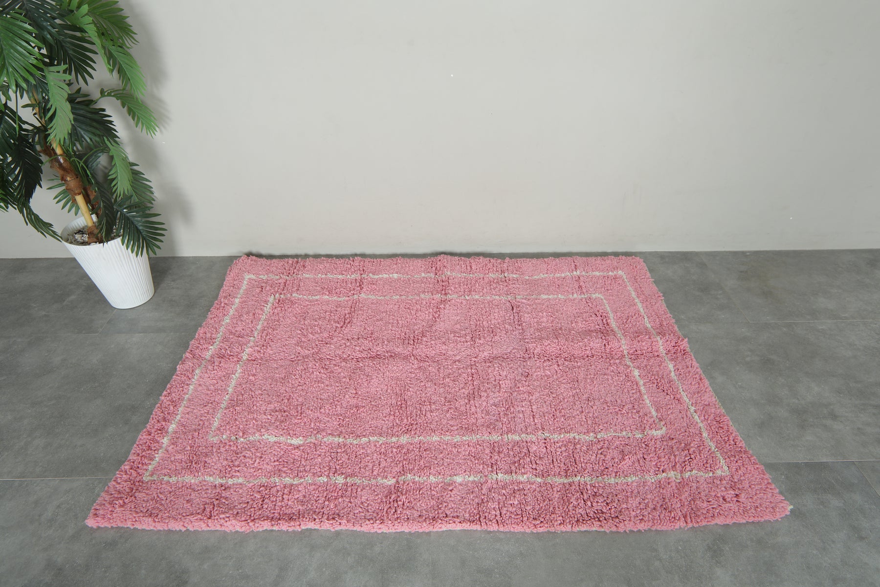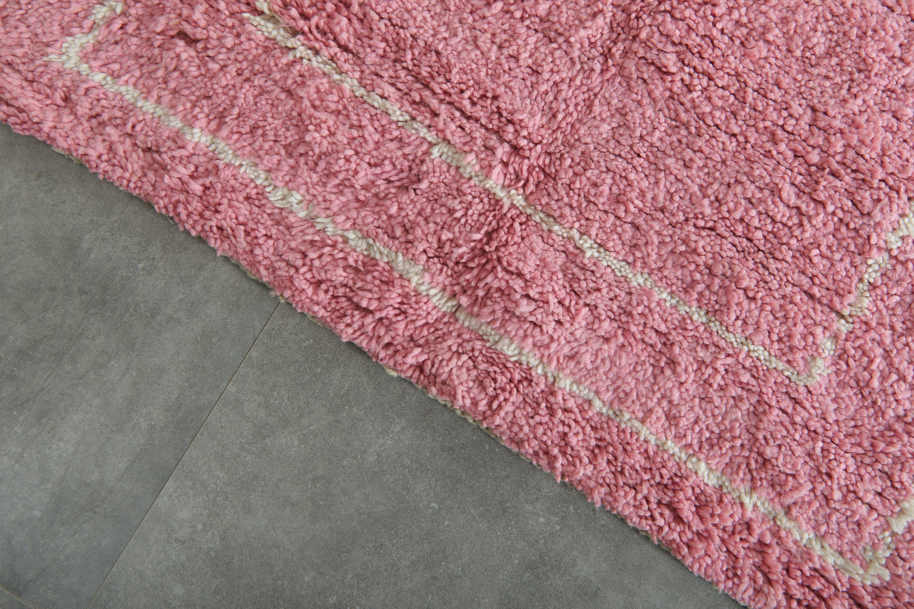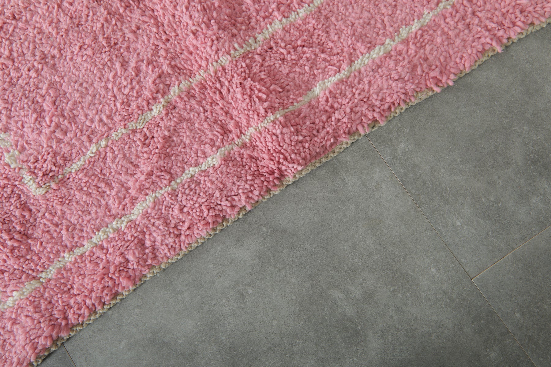 Add a playful touch of elegance to your space with this handmade pink and white Moroccan rug. Featuring a minimalist double-border design on a soft blush pink background, this cozy wool rug blends traditional Berber craftsmanship with modern charm. Perfect for bedrooms, nurseries, or boho-inspired living areas, its plush texture and eye-catching color make it a standout accent piece. Ethically woven from natural wool, this Moroccan rug offers both comfort and style with a story rooted in authentic artisan tradition.