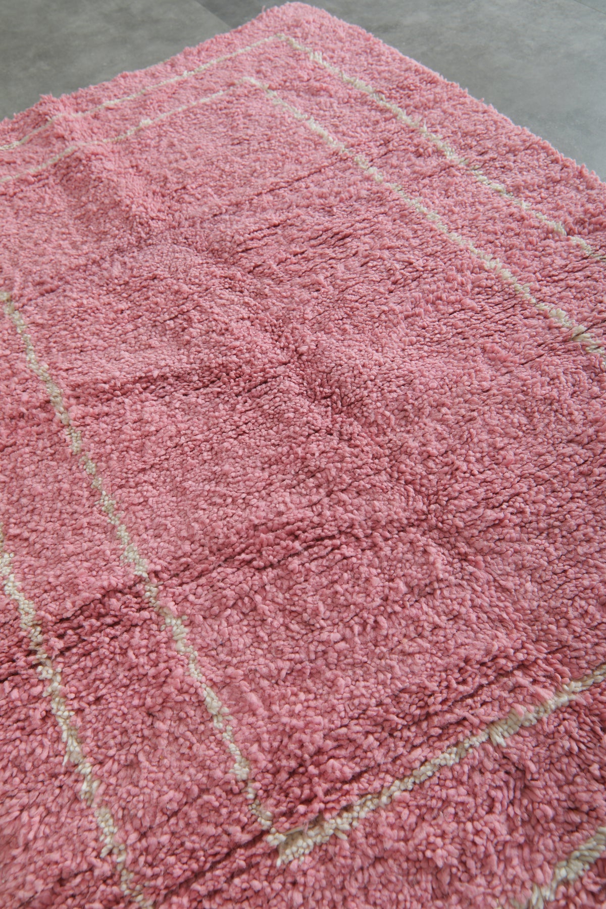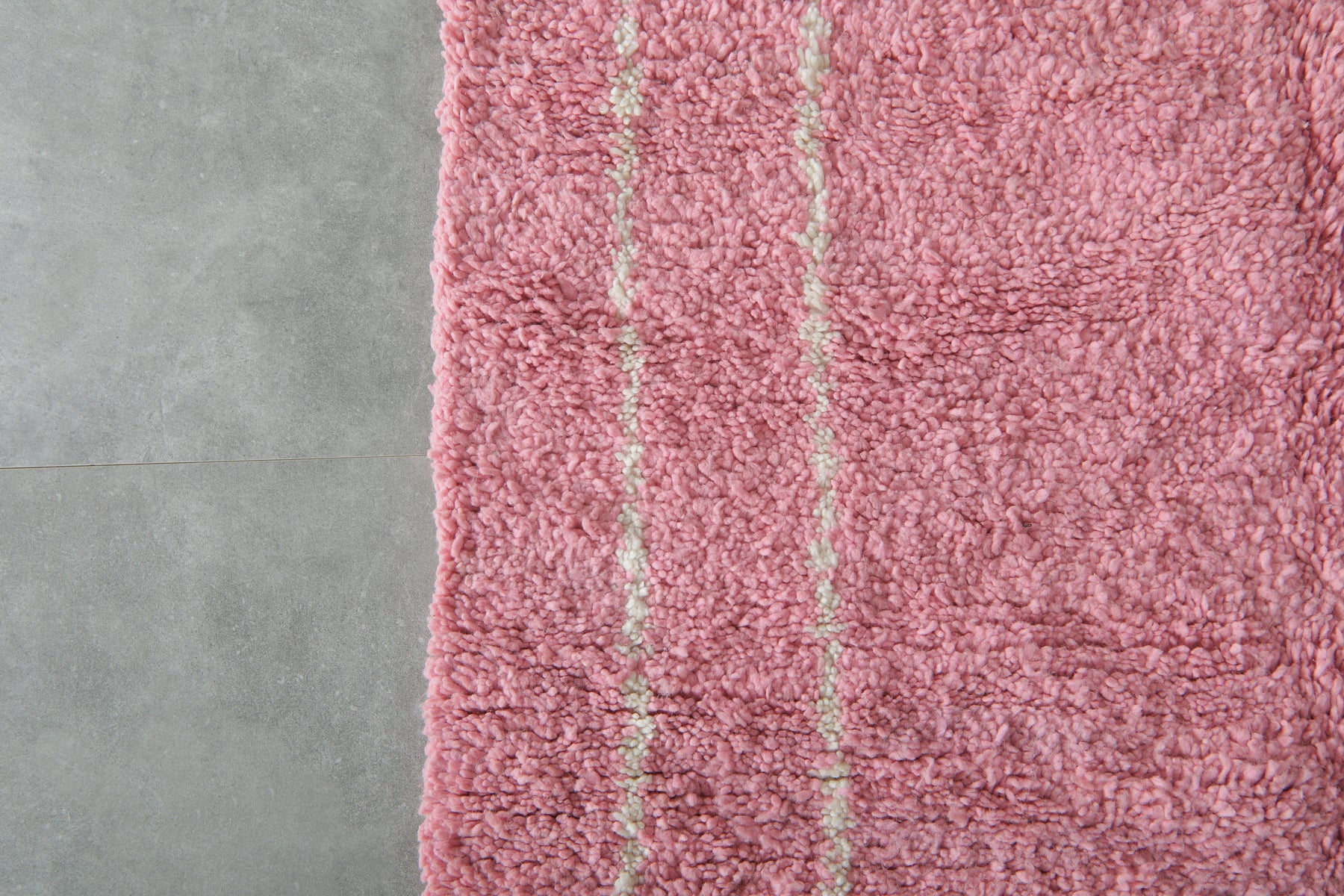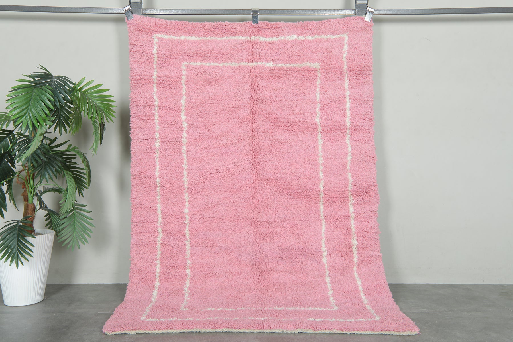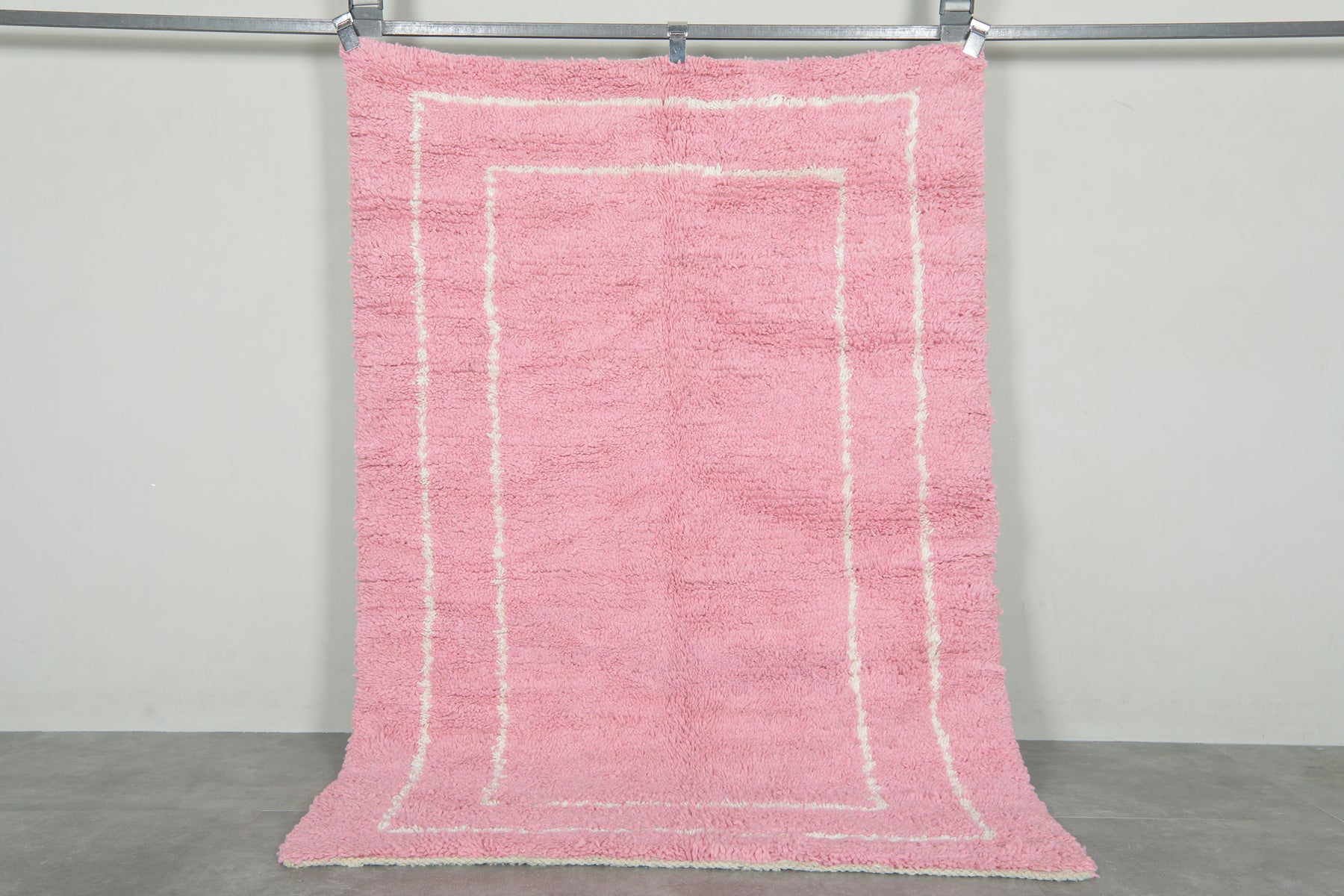 Add a playful touch of elegance to your space with this handmade pink and white Moroccan rug. Featuring a minimalist double-border design on a soft blush pink background, this cozy wool rug blends traditional Berber craftsmanship with modern charm. Perfect for bedrooms, nurseries, or boho-inspired living areas, its plush texture and eye-catching color make it a standout accent piece. Ethically woven from natural wool, this Moroccan rug offers both comfort and style with a story rooted in authentic artisan tradition.