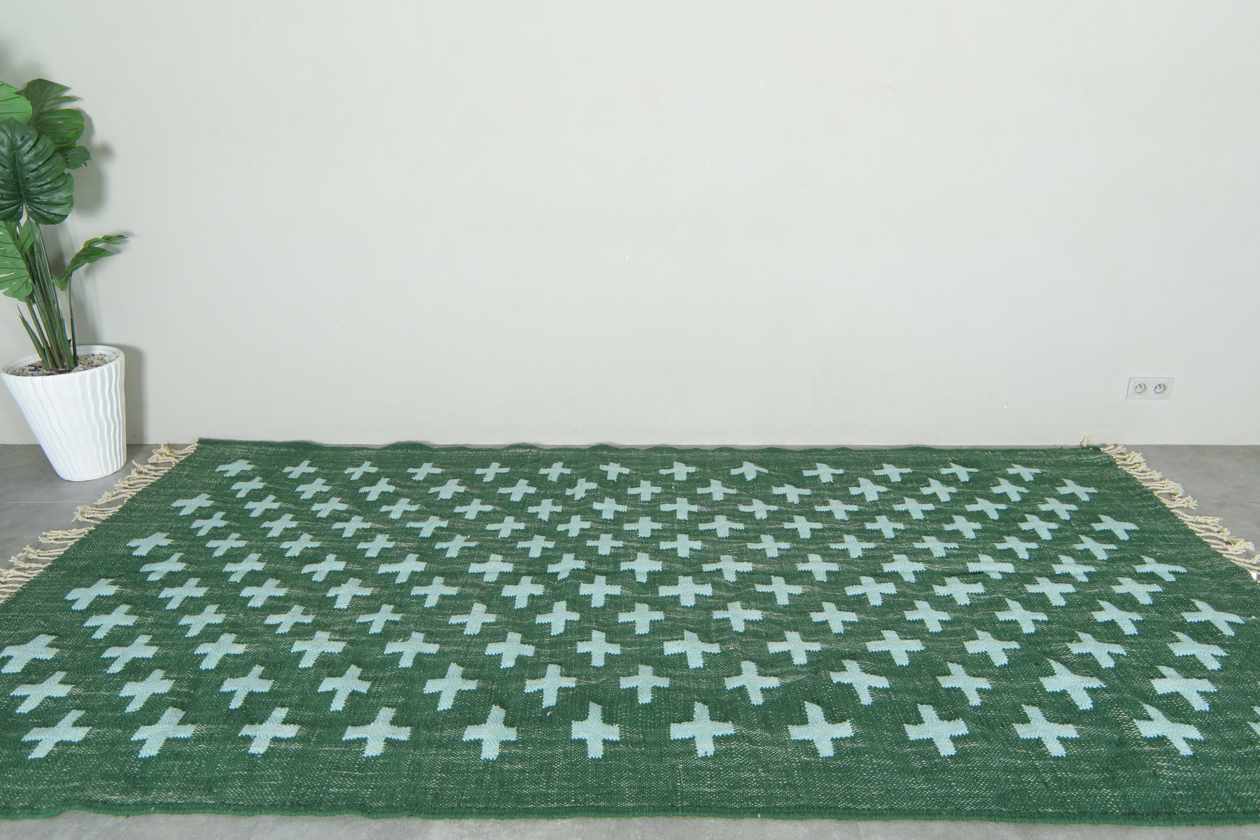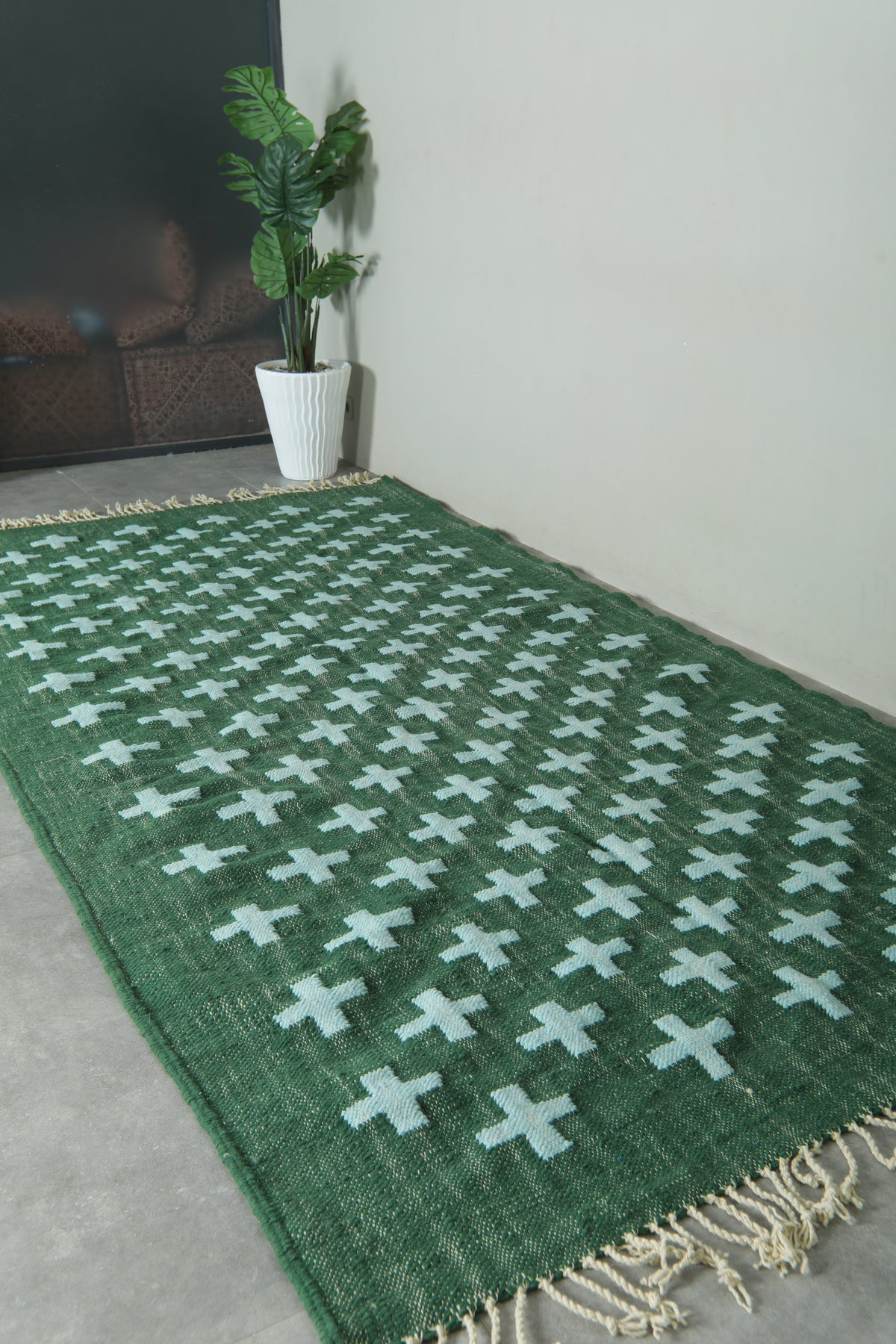 Handwoven Moroccan Flatweave Rug - Deep Green with Soft Mint Cross Pattern - Custom rug