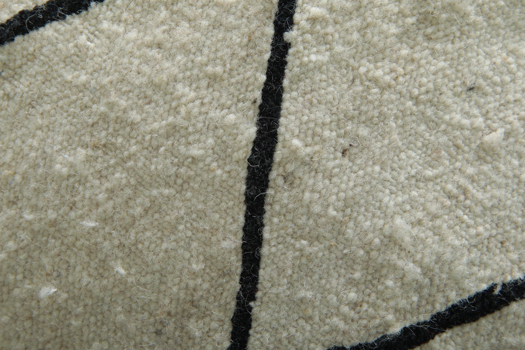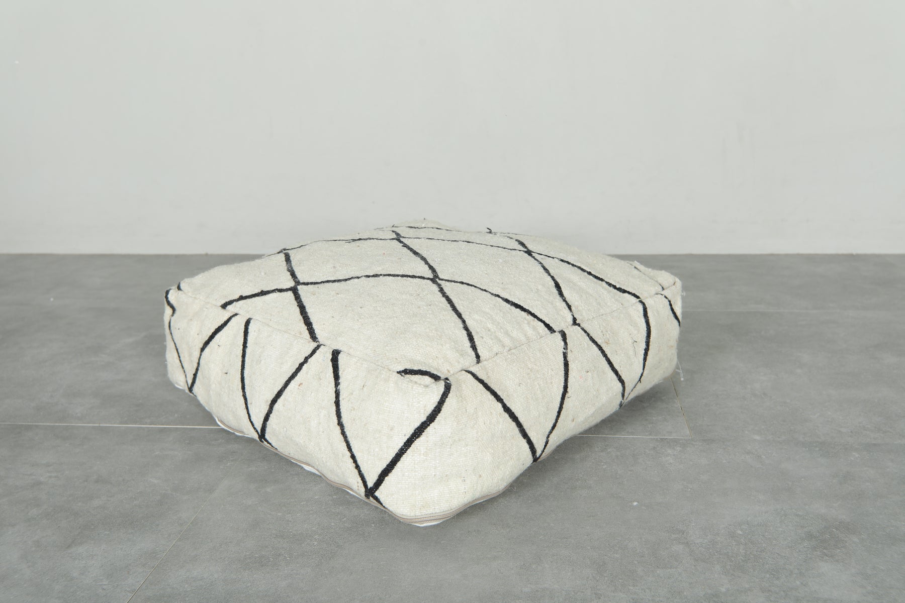 Elevate your space with minimalist elegance using this white and black Moroccan Kilim pouf. Inspired by the classic Beni Ourain style, this pouf features a handwoven wool surface with simple yet bold black diamond lattice lines over a soft ivory background. The clean, neutral color palette and timeless geometric pattern make it a perfect fit for modern, Scandinavian, bohemian, or Japandi interiors.