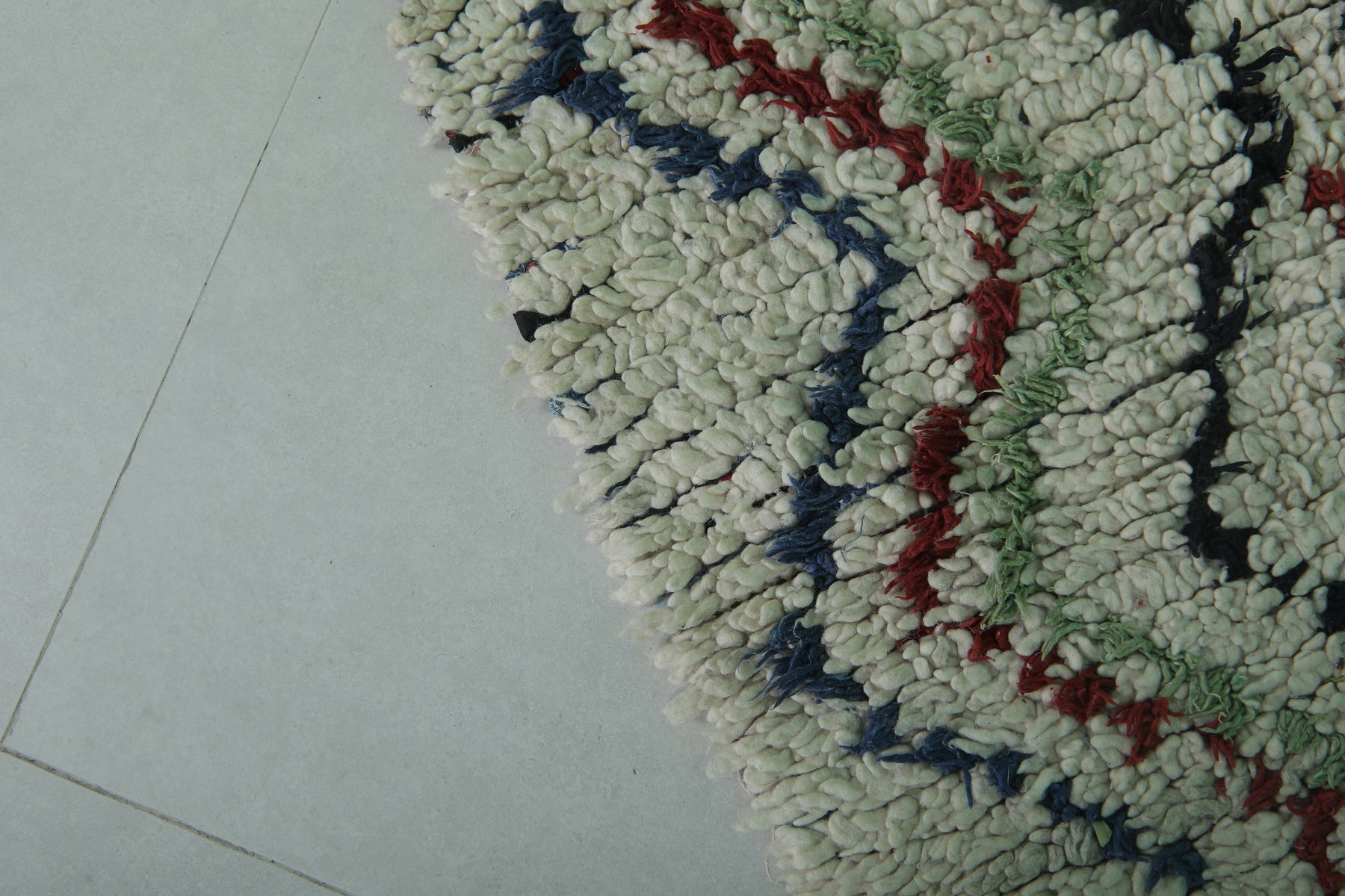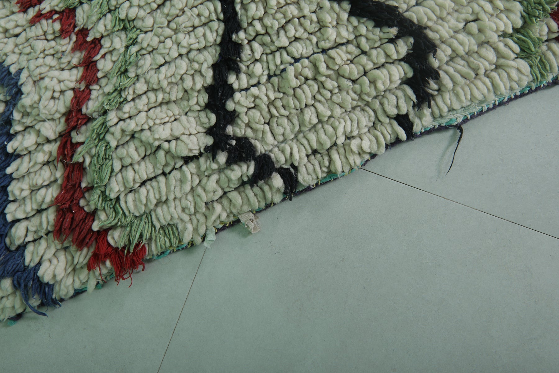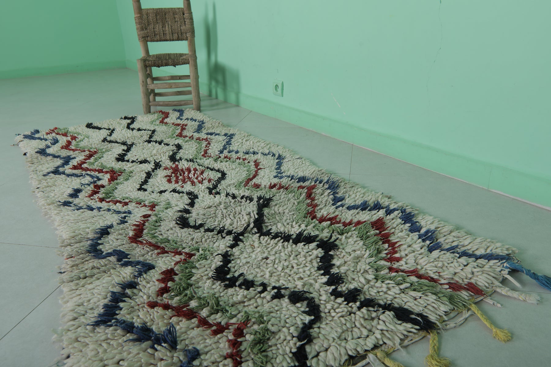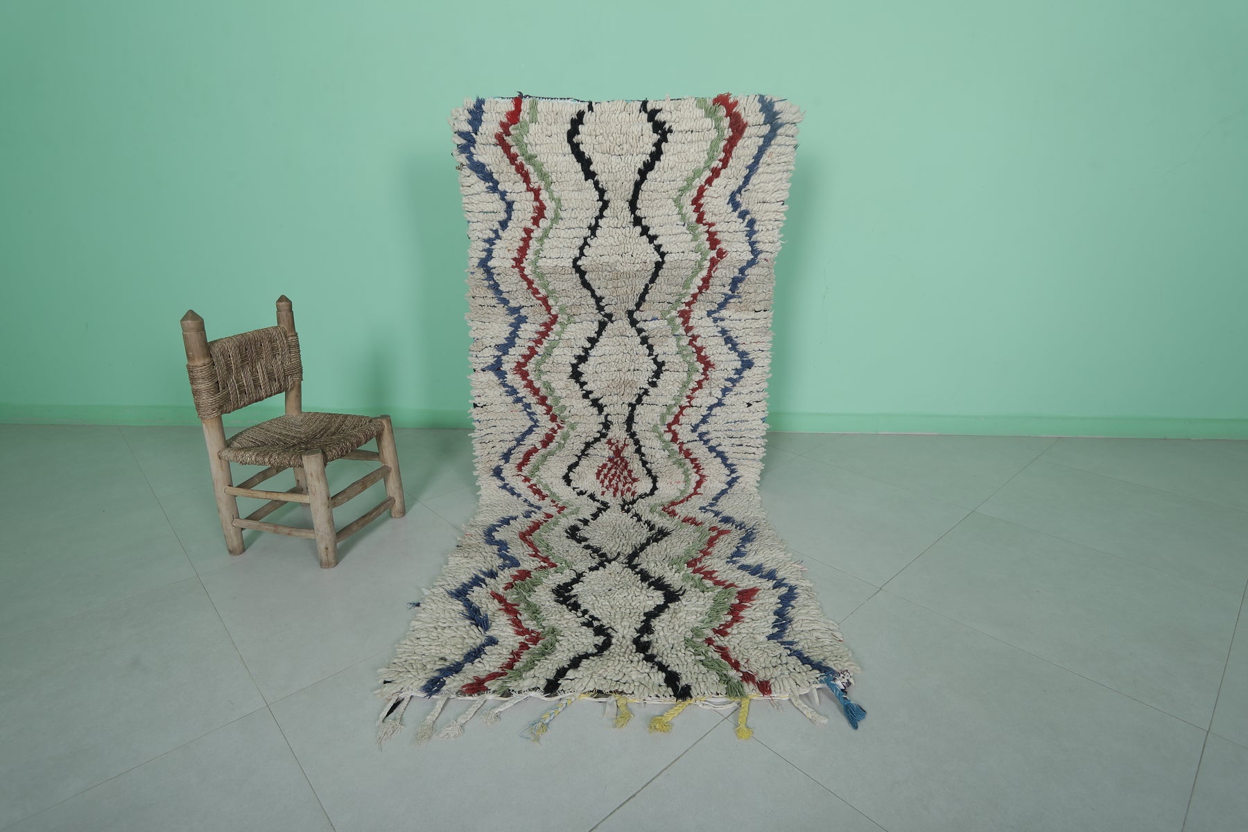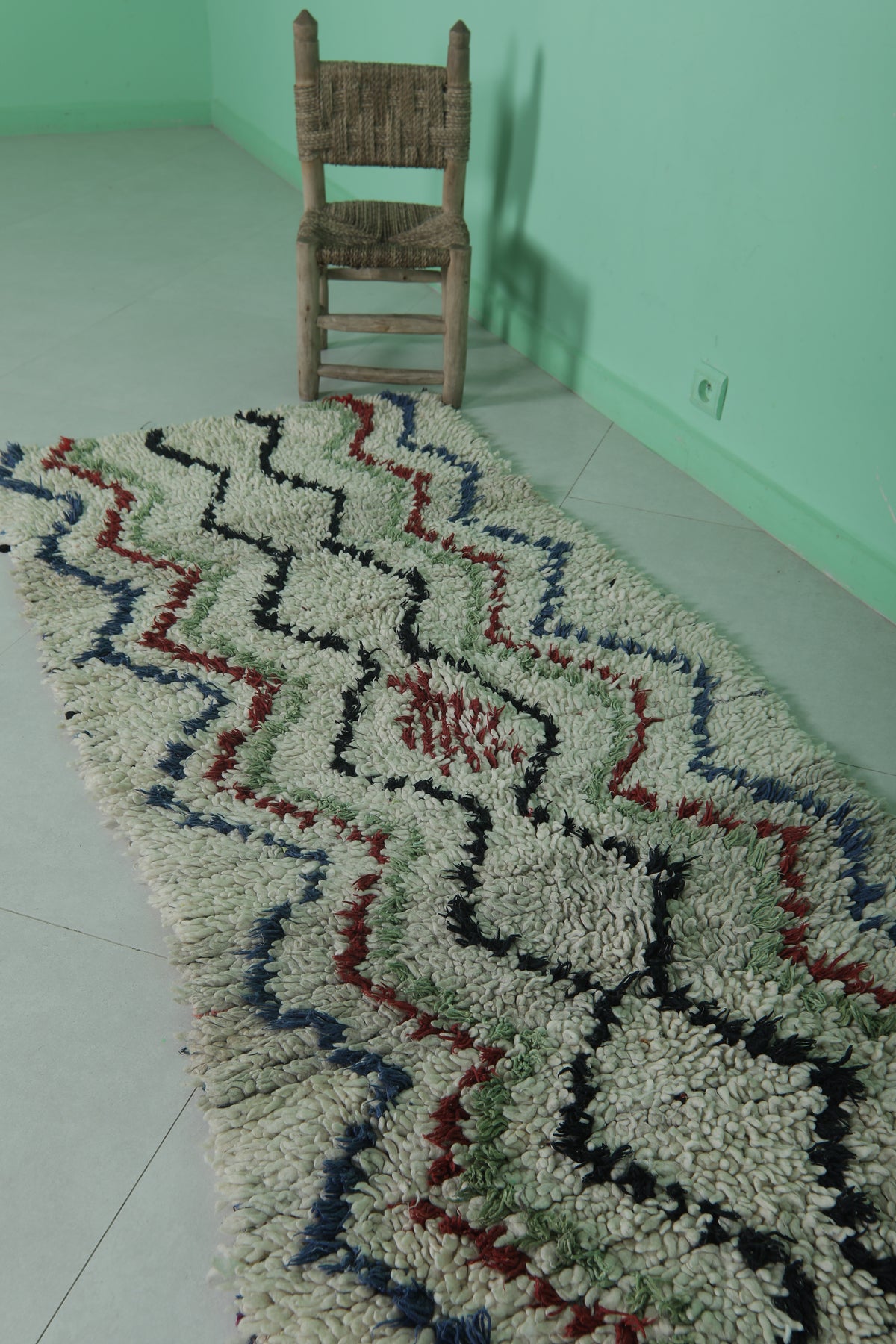 Add a touch of Moroccan artistry with this Handmade Azilal Rug, measuring 2.9 x 6.5 feet (90 CM x 199 CM). Featuring a vibrant zigzag pattern in red, green, blue, and black hues, this unique wool rug blends tradition with modern charm.