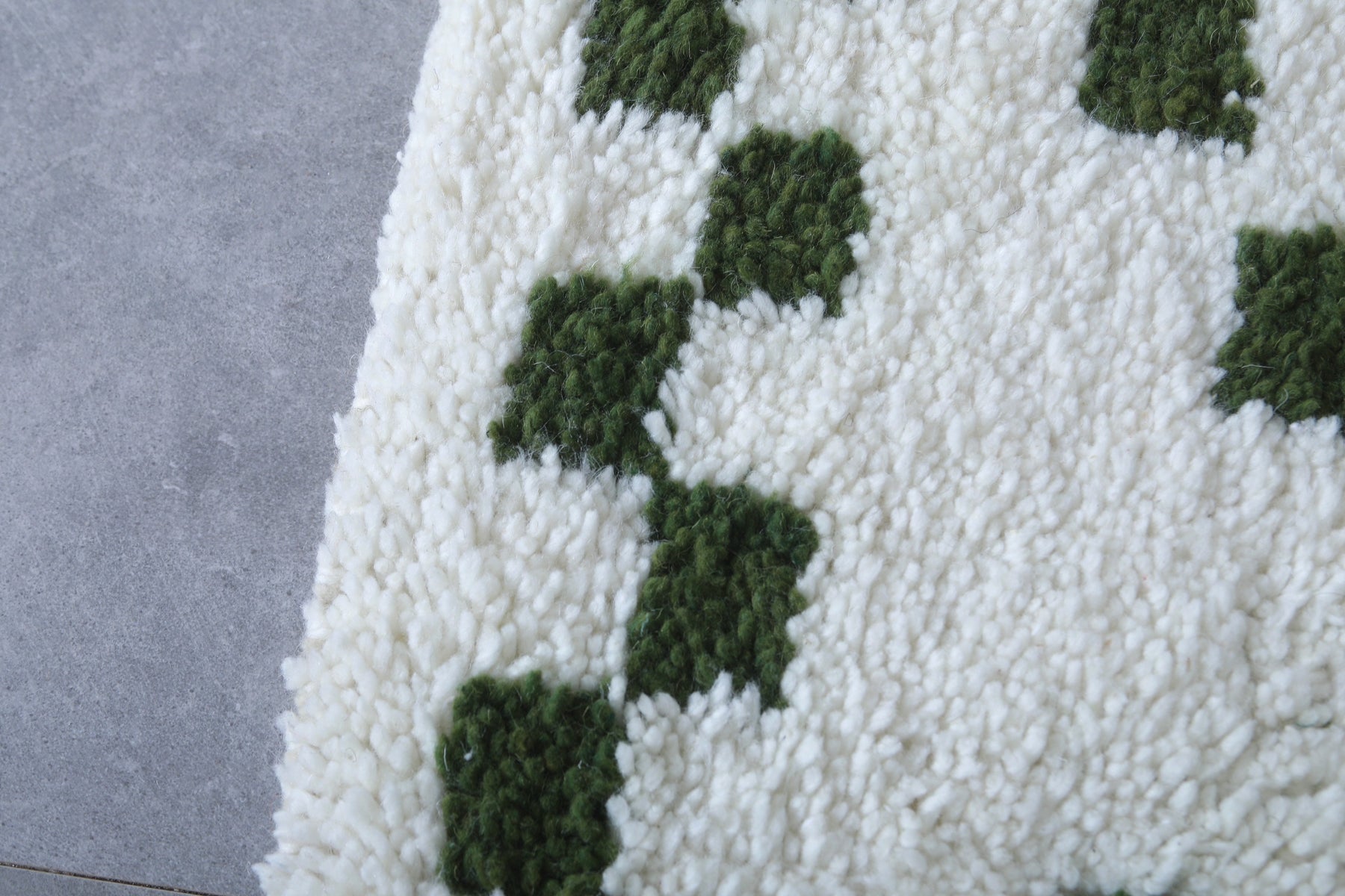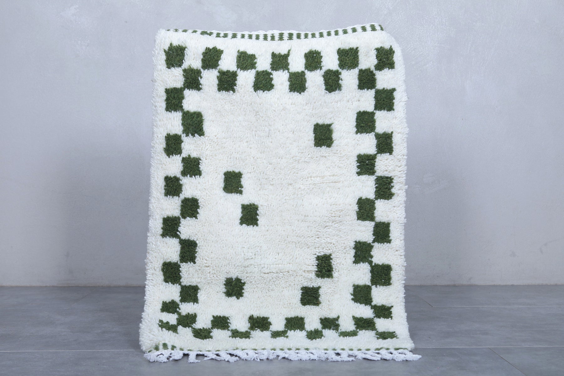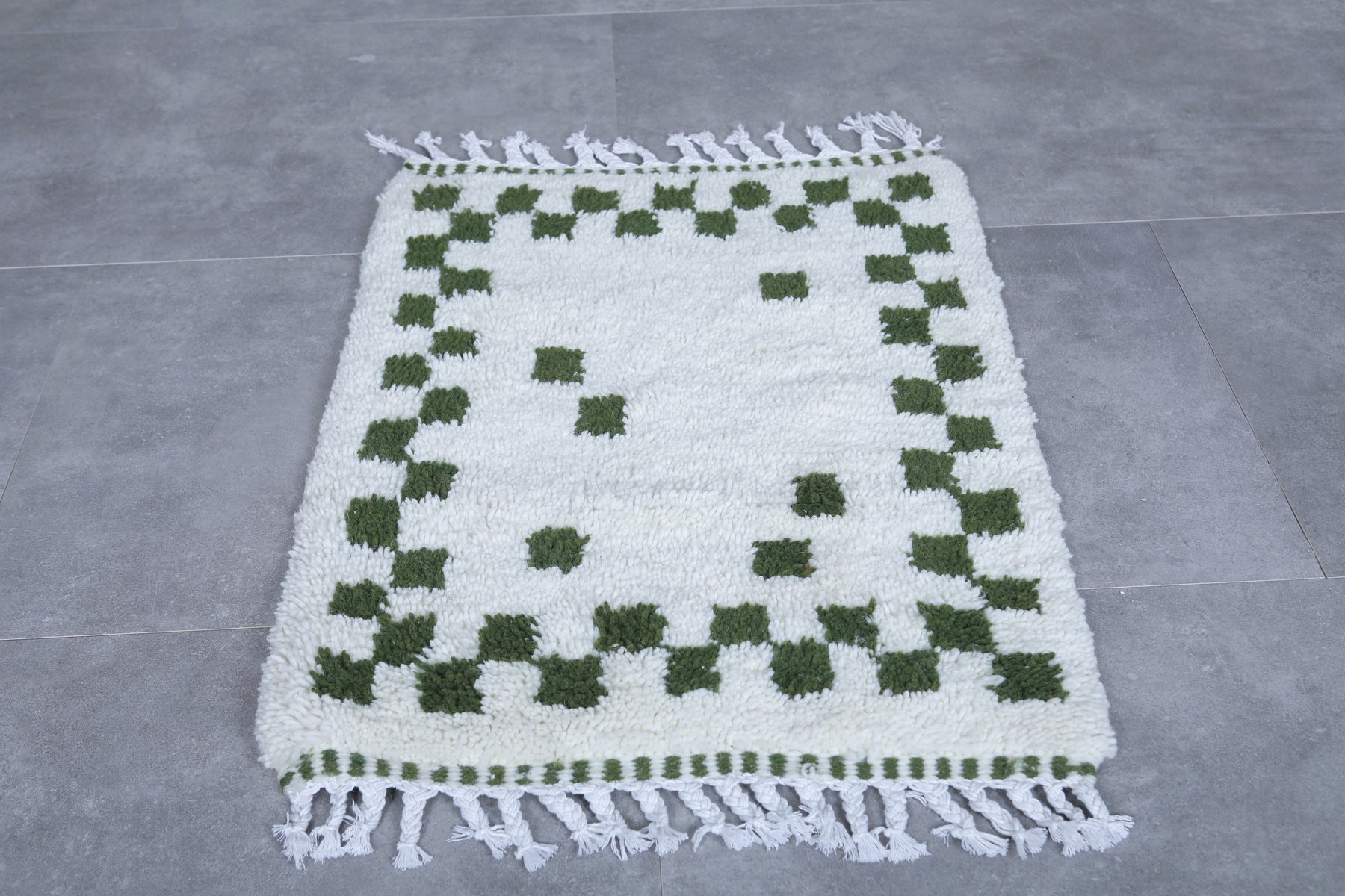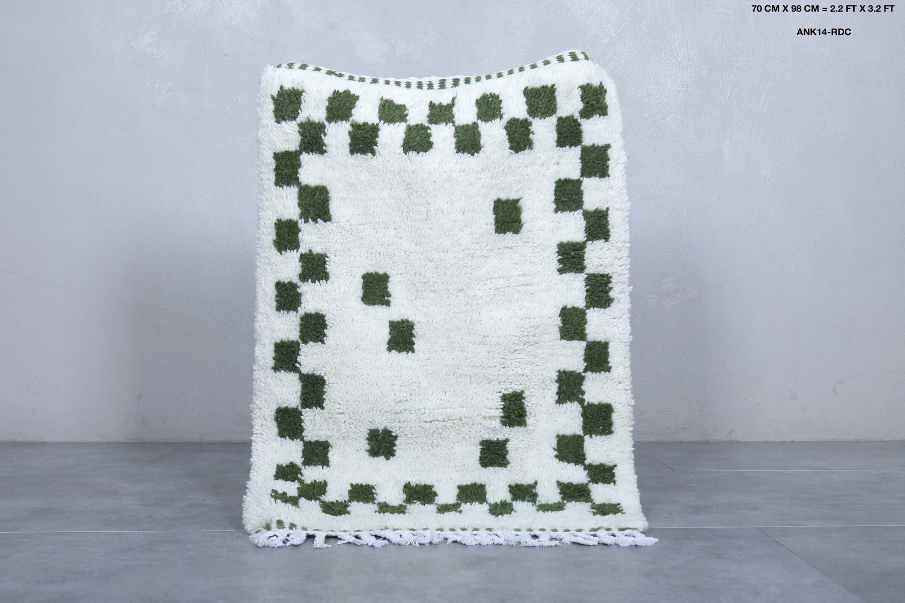 Adorn your home with the elegance of this handmade Moroccan Beni Ourain Rug, sized at 2.2 x 3.2 feet (70 CM x 98 CM). Featuring a sophisticated design of green geometric accents on a creamy white wool backdrop, this compact rug brings warmth and character to smaller spaces like entryways, bathrooms, or bedside areas. Handcrafted with premium wool, it ensures durability, softness, and timeless Moroccan artistry. Add a cozy and stylish touch to your space with this exquisite rug today!