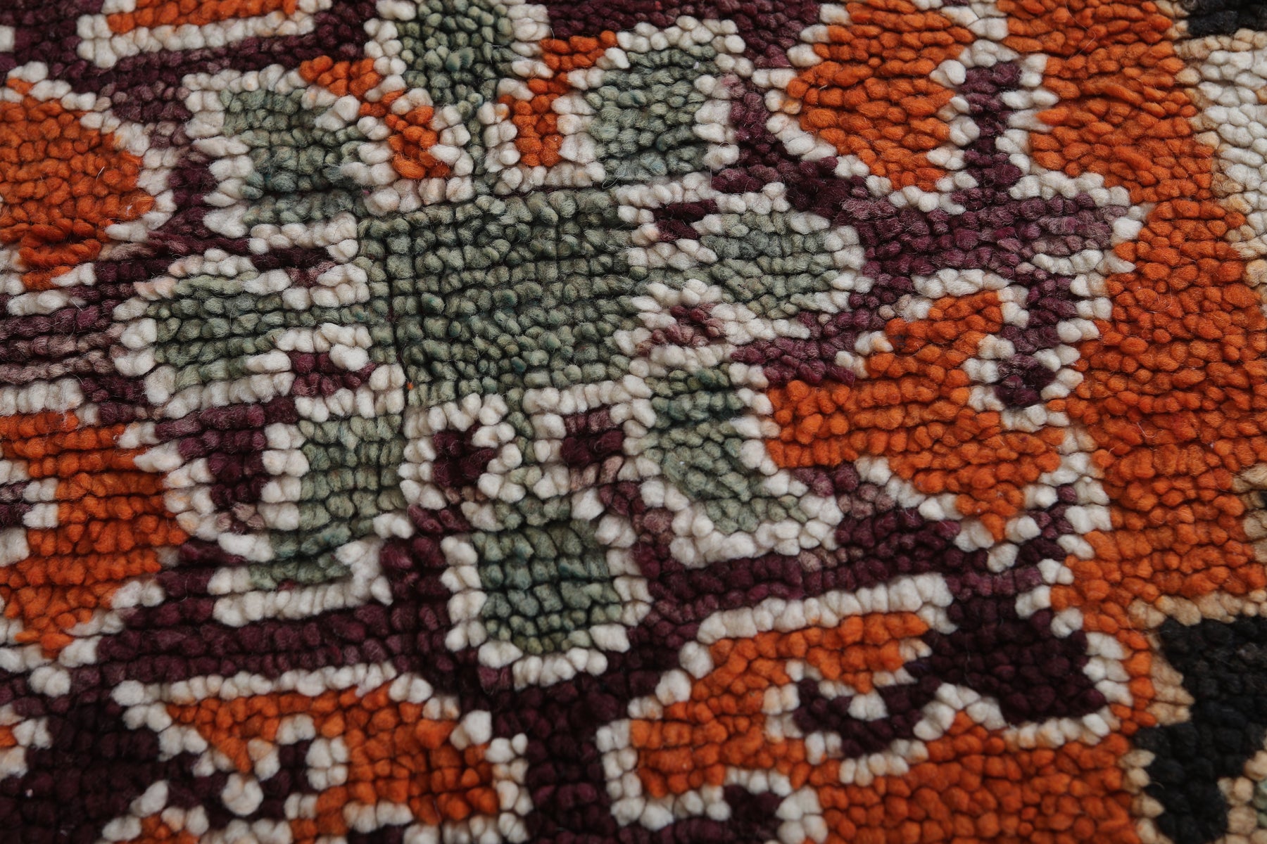 Add elegance to your space with this 6.8 x 11.6 feet Moroccan handmade rug. Featuring bold medallion designs in vibrant hues of orange, black, and green, the intricate floral and vine borders enhance its timeless charm.