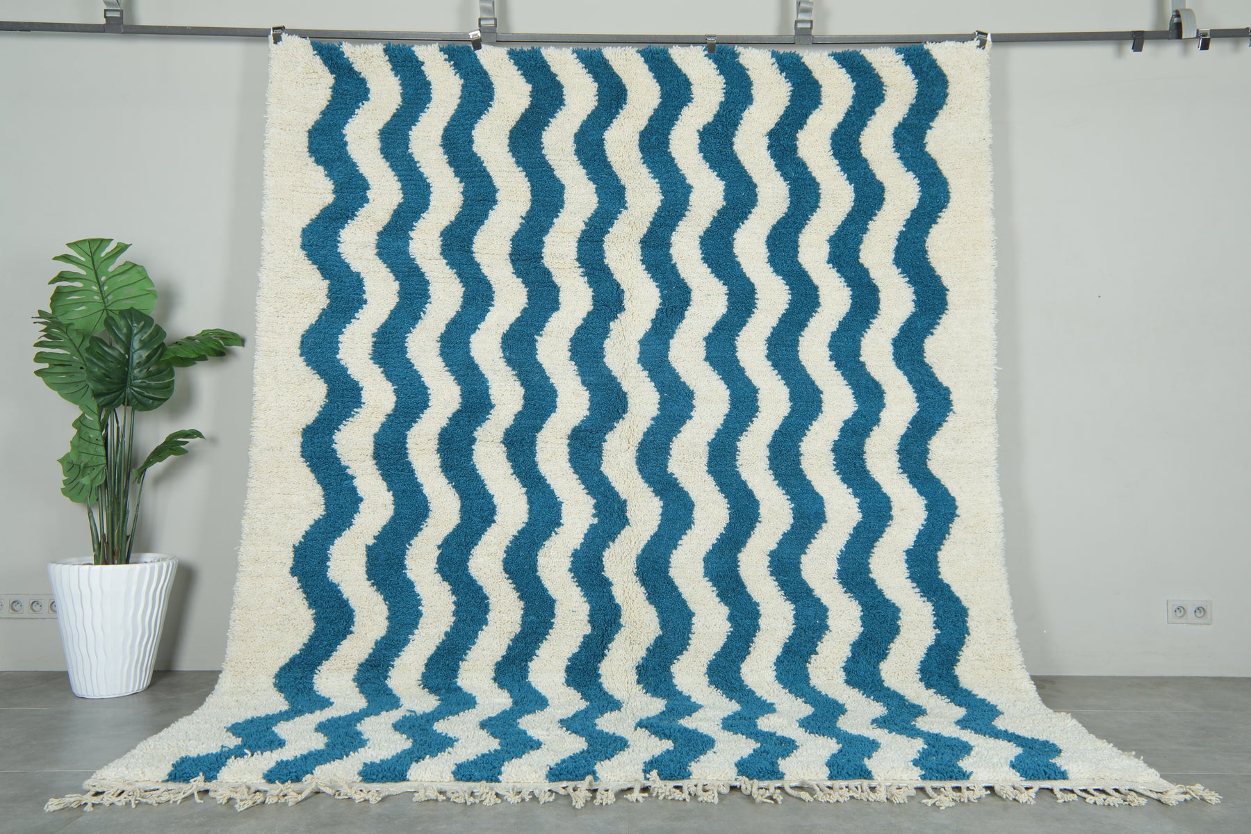 Add a splash of bold, modern flair to your space with this Wavy blue & white Moroccan Rug. Handwoven from premium wool, this eye-catching rug features dynamic teal blue waves flowing across a soft ivory base—creating a lively pattern that balances tradition and modern design. Perfect for contemporary interiors, boho-inspired rooms, or coastal decor themes, this Moroccan rug brings both comfort and character to any setting.