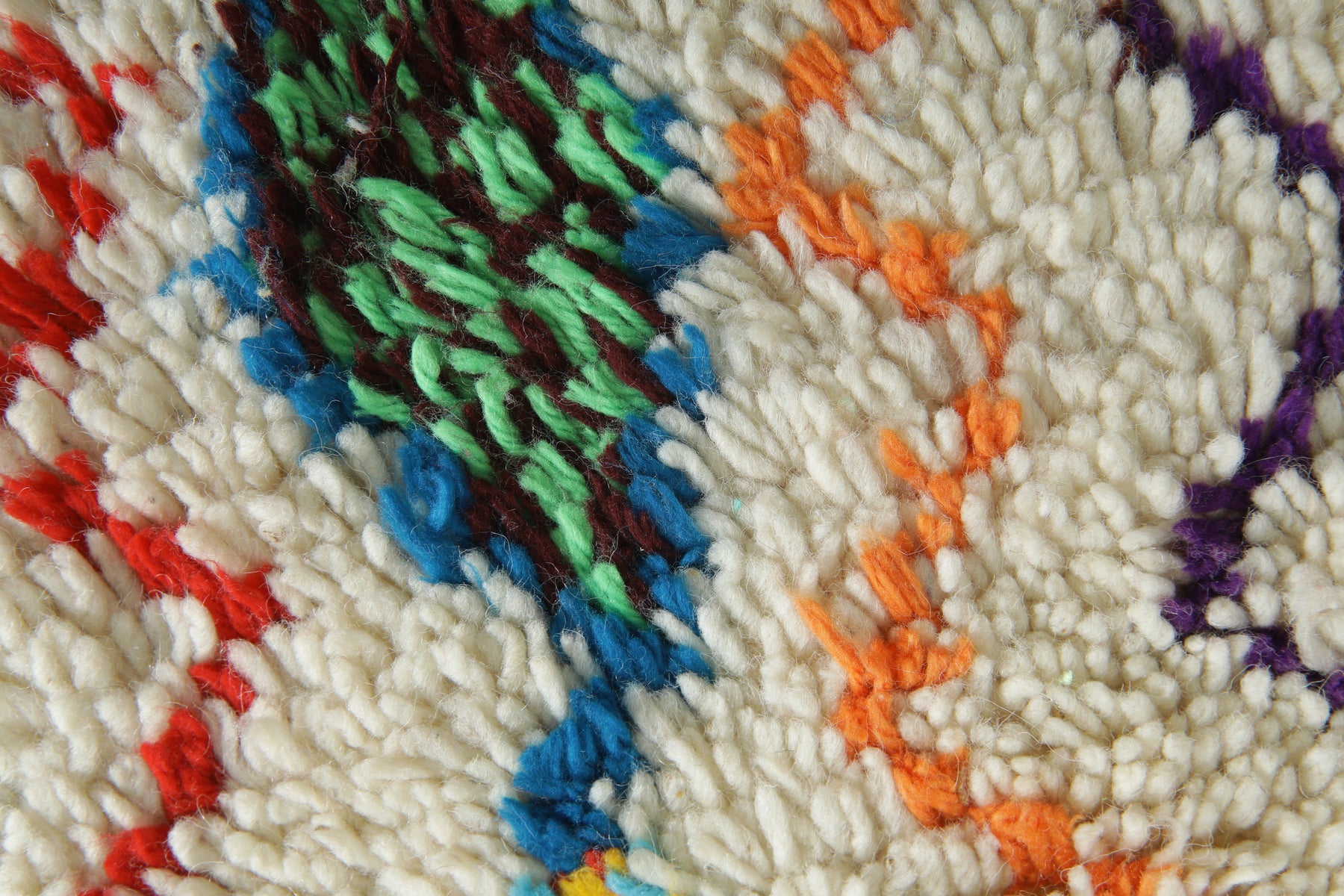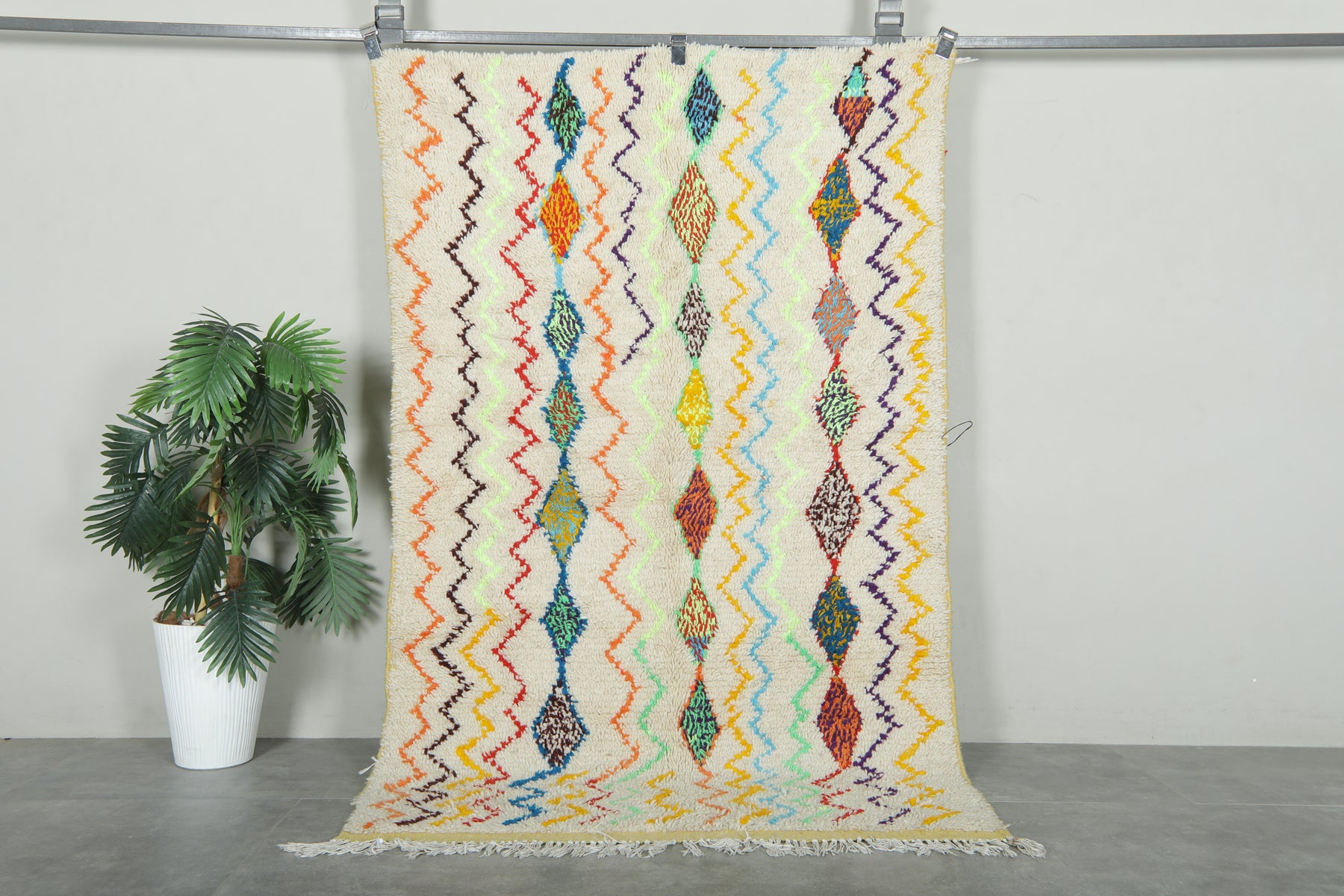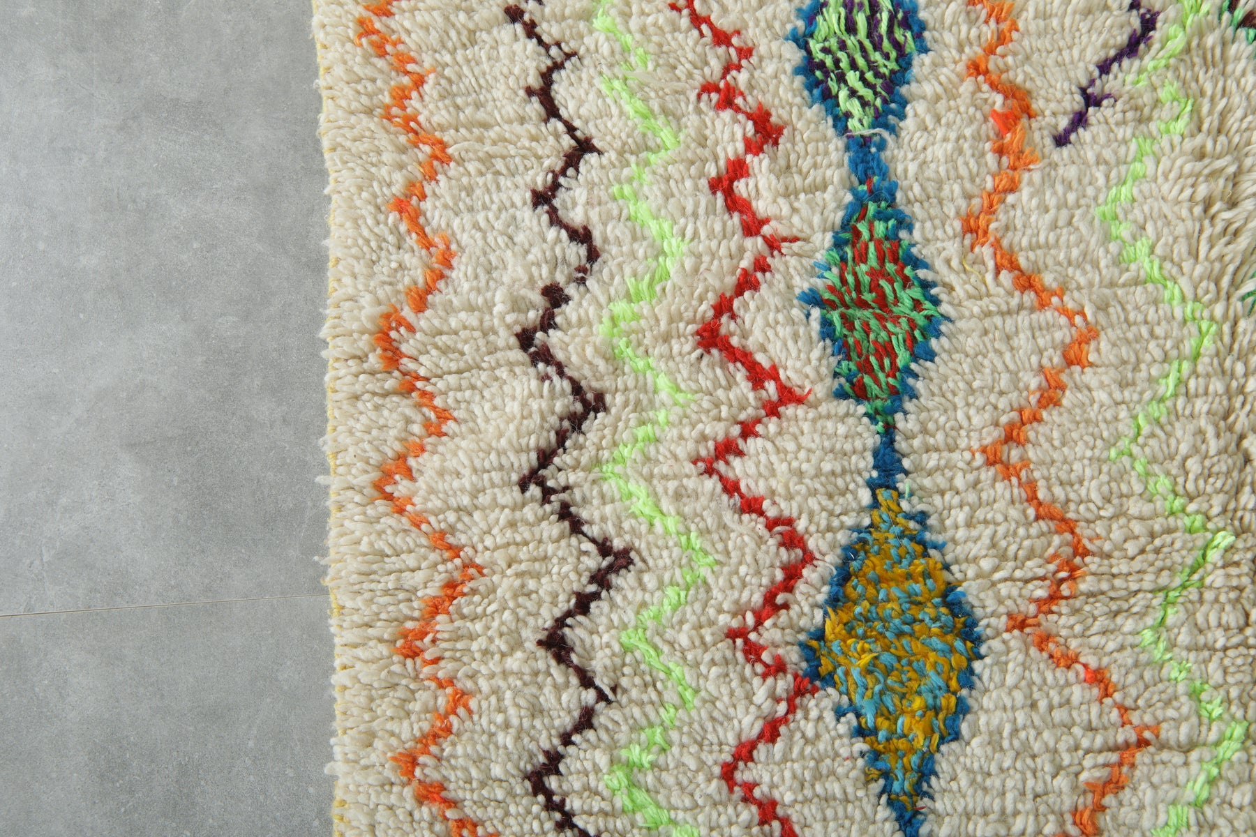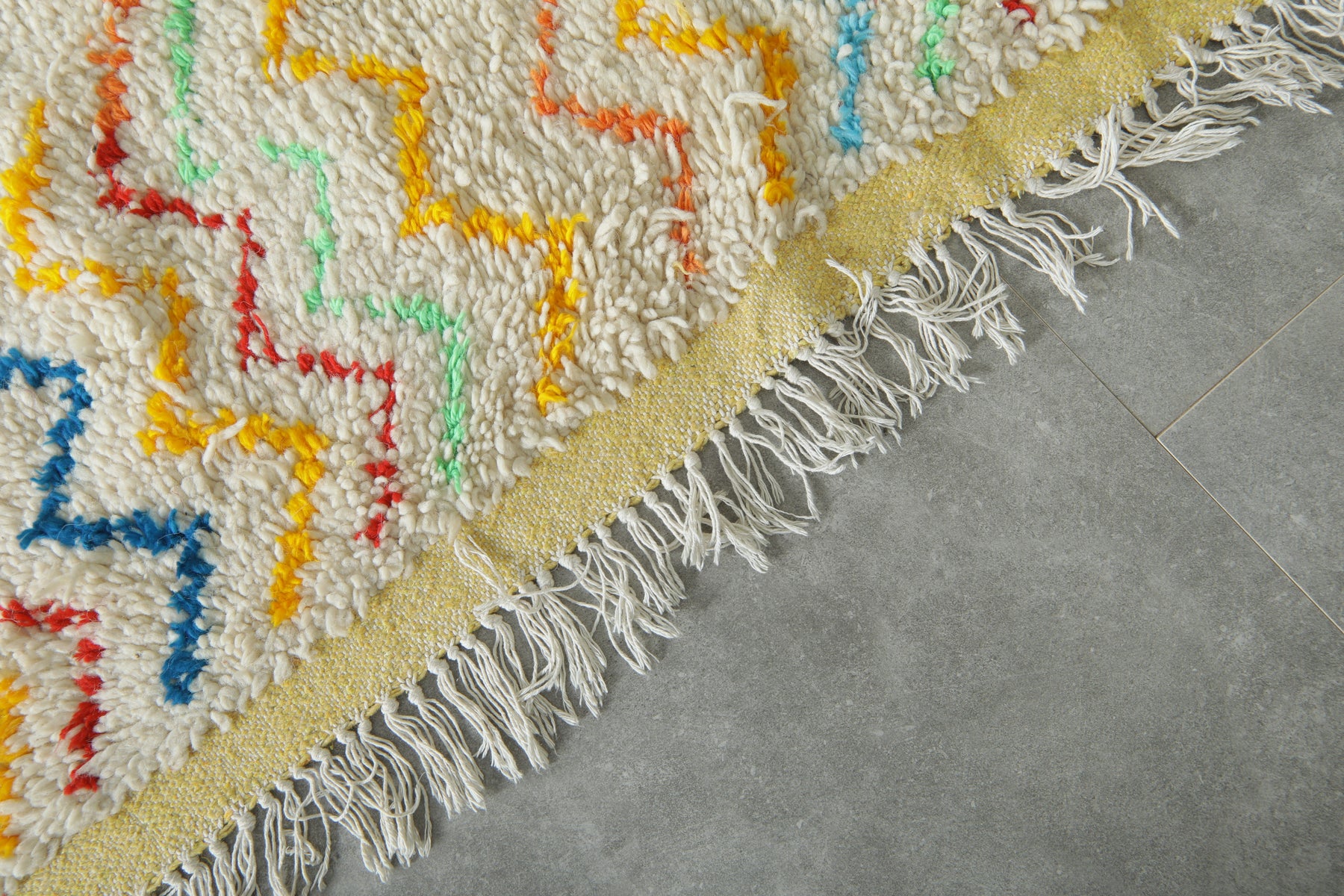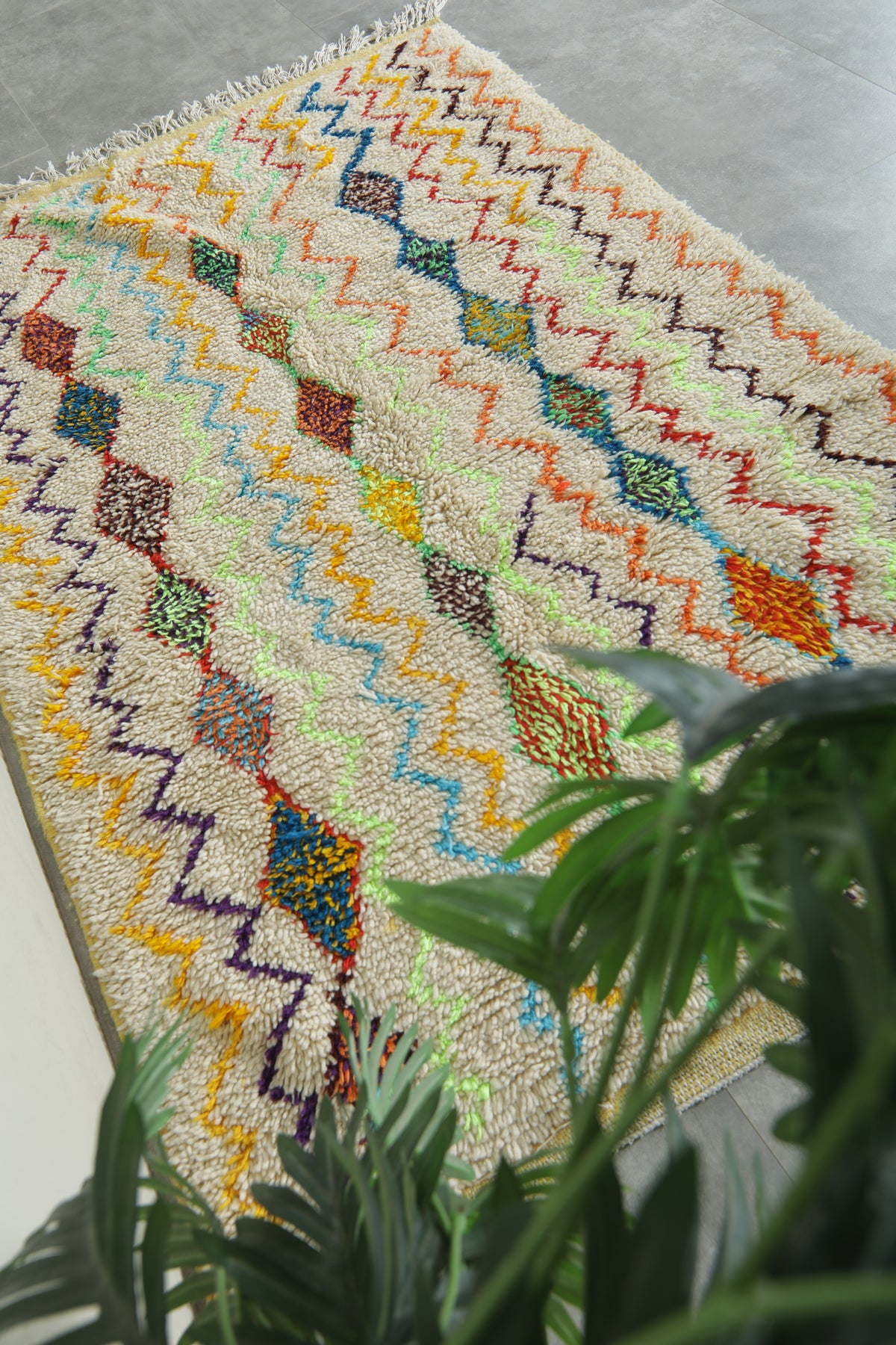 Bring bold character and artisanal charm to your room with this handwoven Azilal Wool Rug, featuring a soft cream wool base and multicolor zigzag and diamond patterns in a vibrant array of hues. From Morocco's Azilal region, the rug combines classic Berber weaving with playful modern color for a piece that's a perfect statement fit in boho, eclectic, or modern spaces.