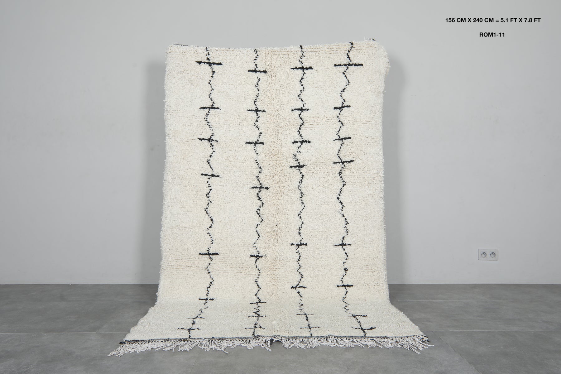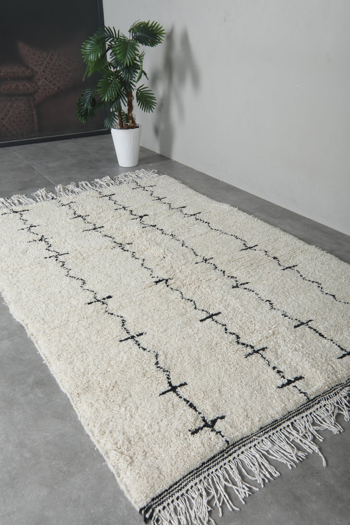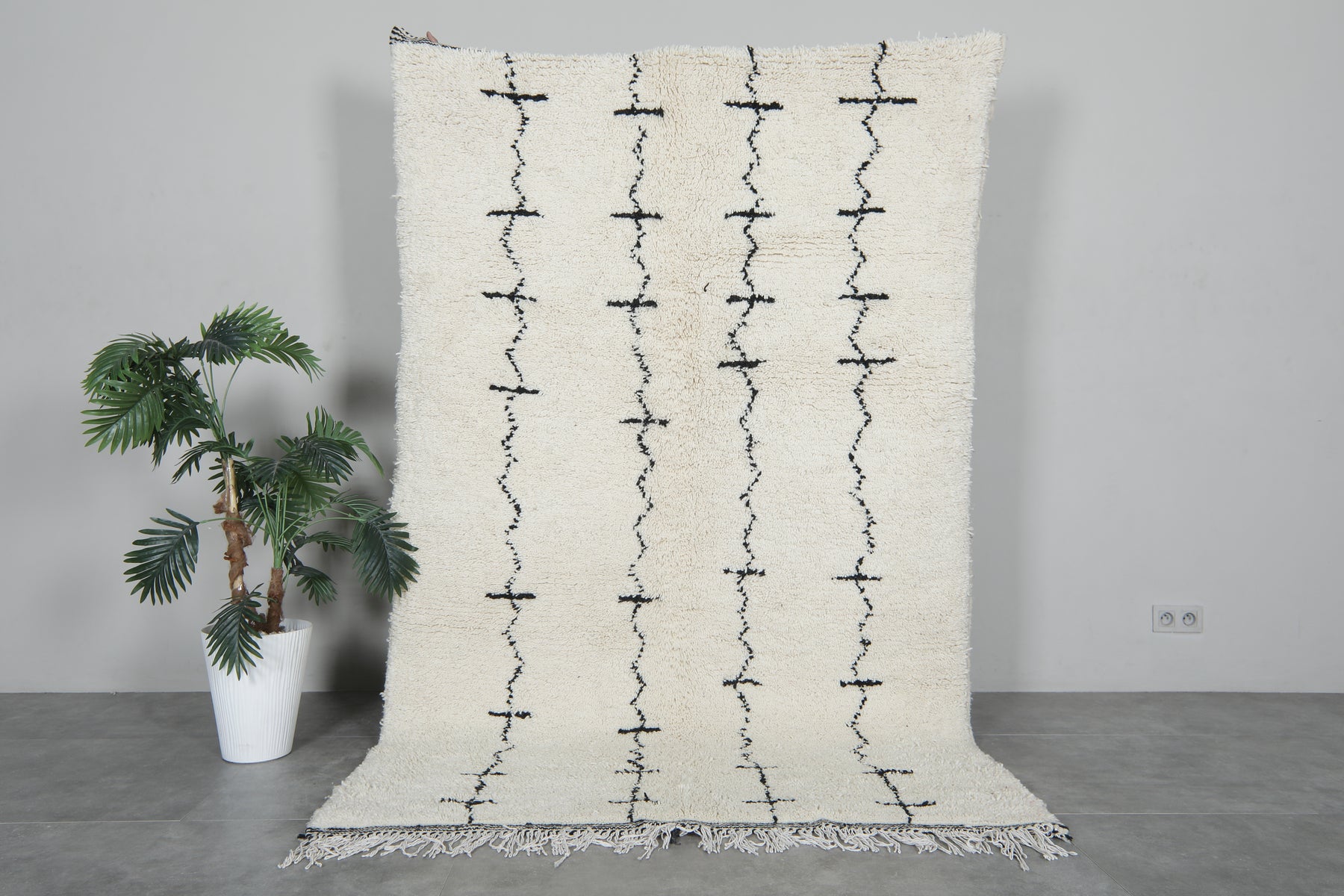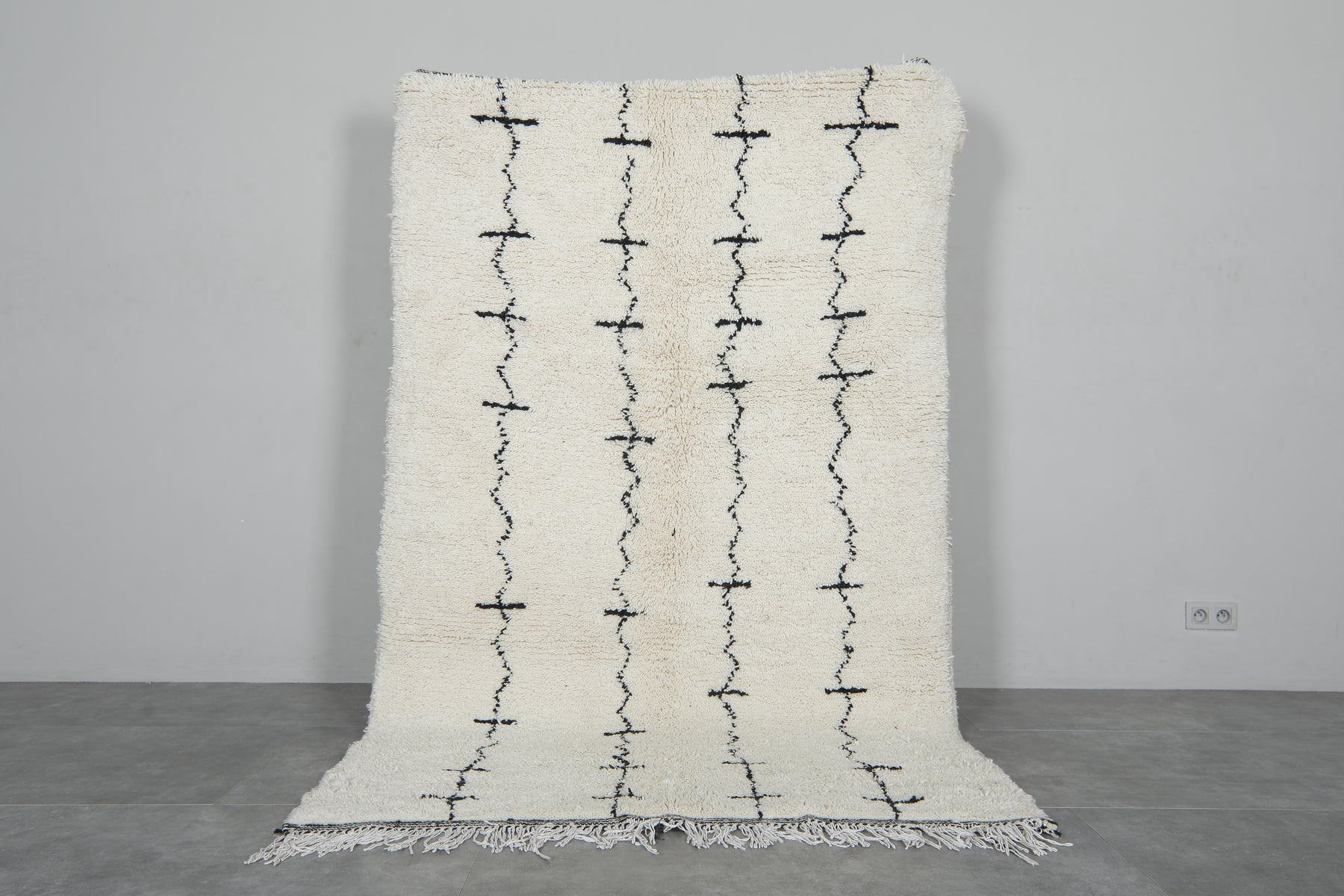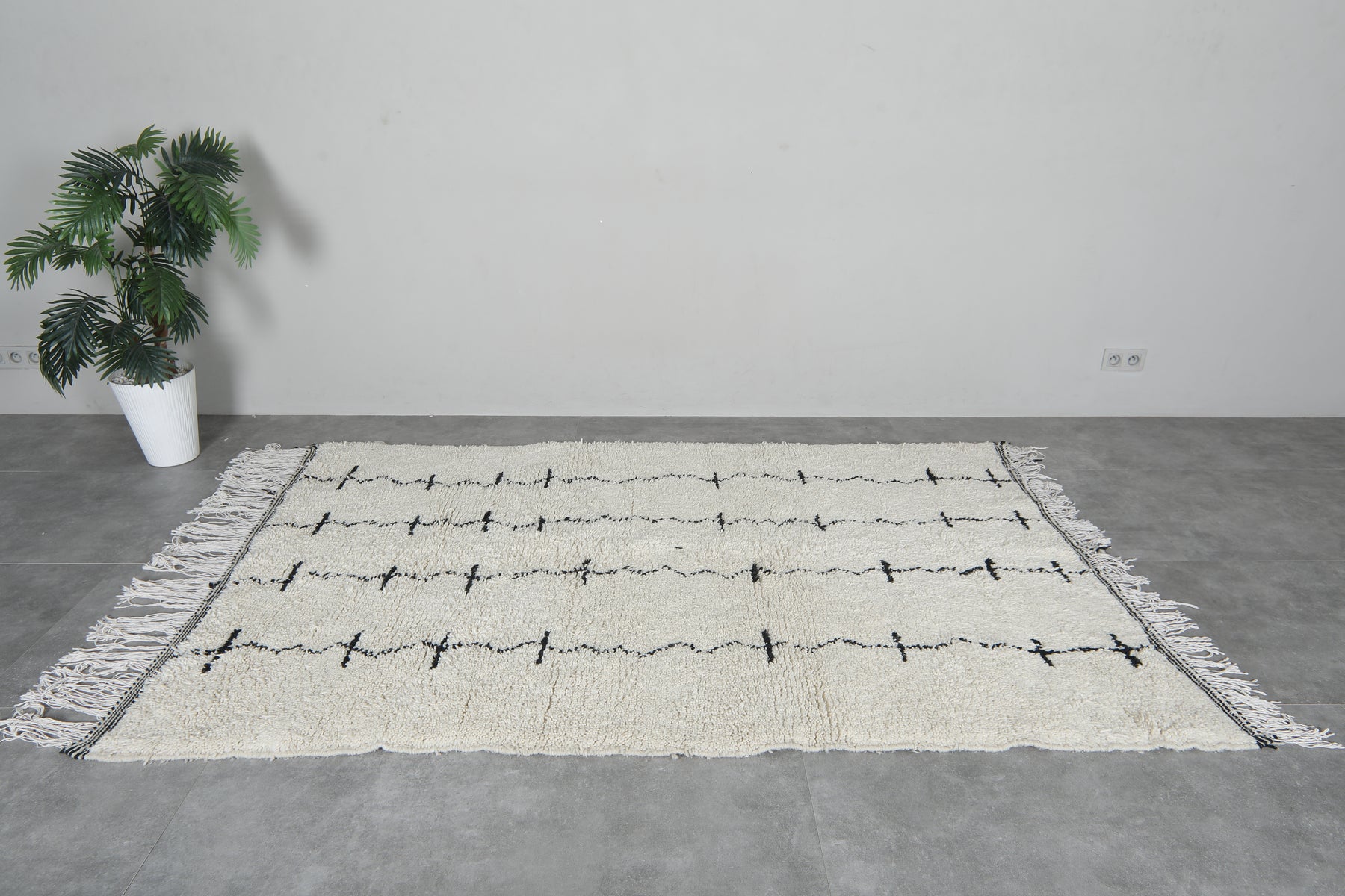 Handwoven Beni Ourain rug measuring 5.1 x 7.8 ft, crafted from 100% premium wool. Featuring a soft ivory base with elegant black tribal lines, this Moroccan Berber carpet brings warmth, texture, and sophistication to minimalist, modern, and bohemian interiors. A timeless statement piece for any home.
