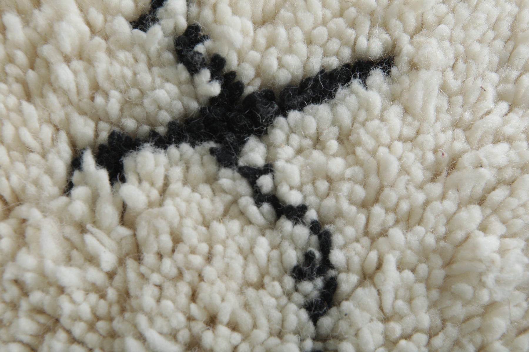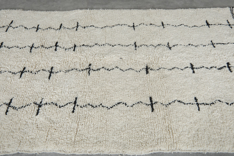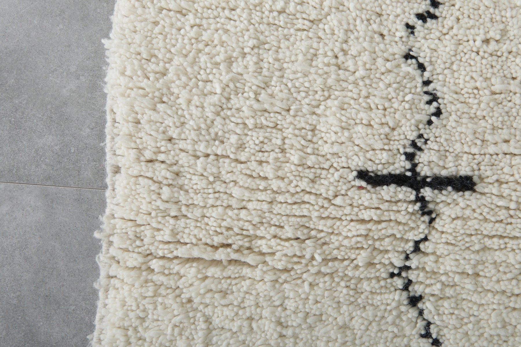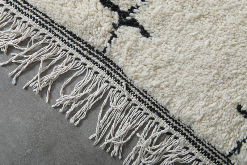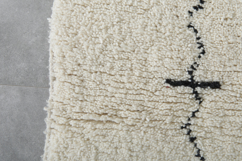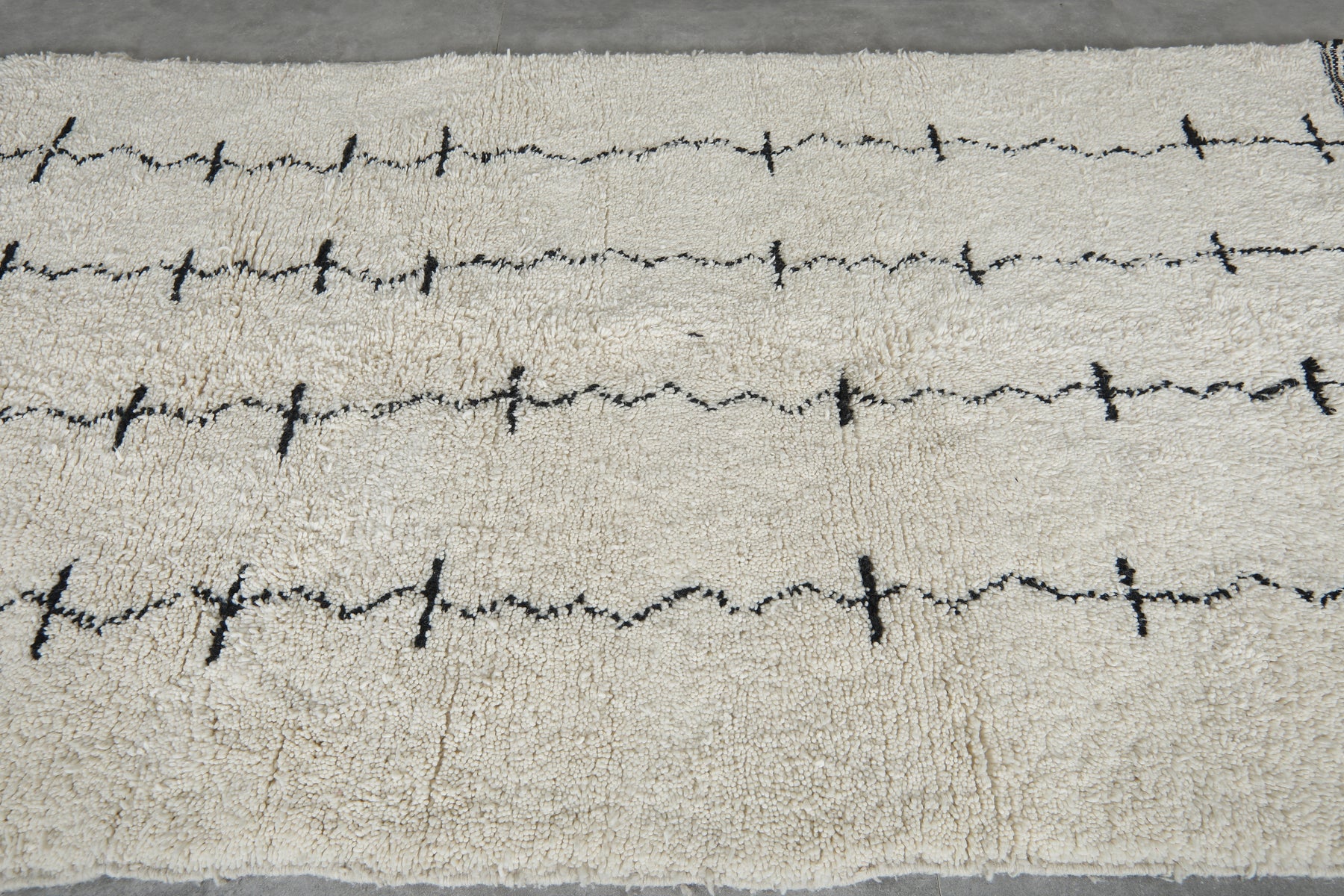 Handwoven Beni Ourain rug measuring 5.1 x 7.8 ft, crafted from 100% premium wool. Featuring a soft ivory base with elegant black tribal lines, this Moroccan Berber carpet brings warmth, texture, and sophistication to minimalist, modern, and bohemian interiors. A timeless statement piece for any home.