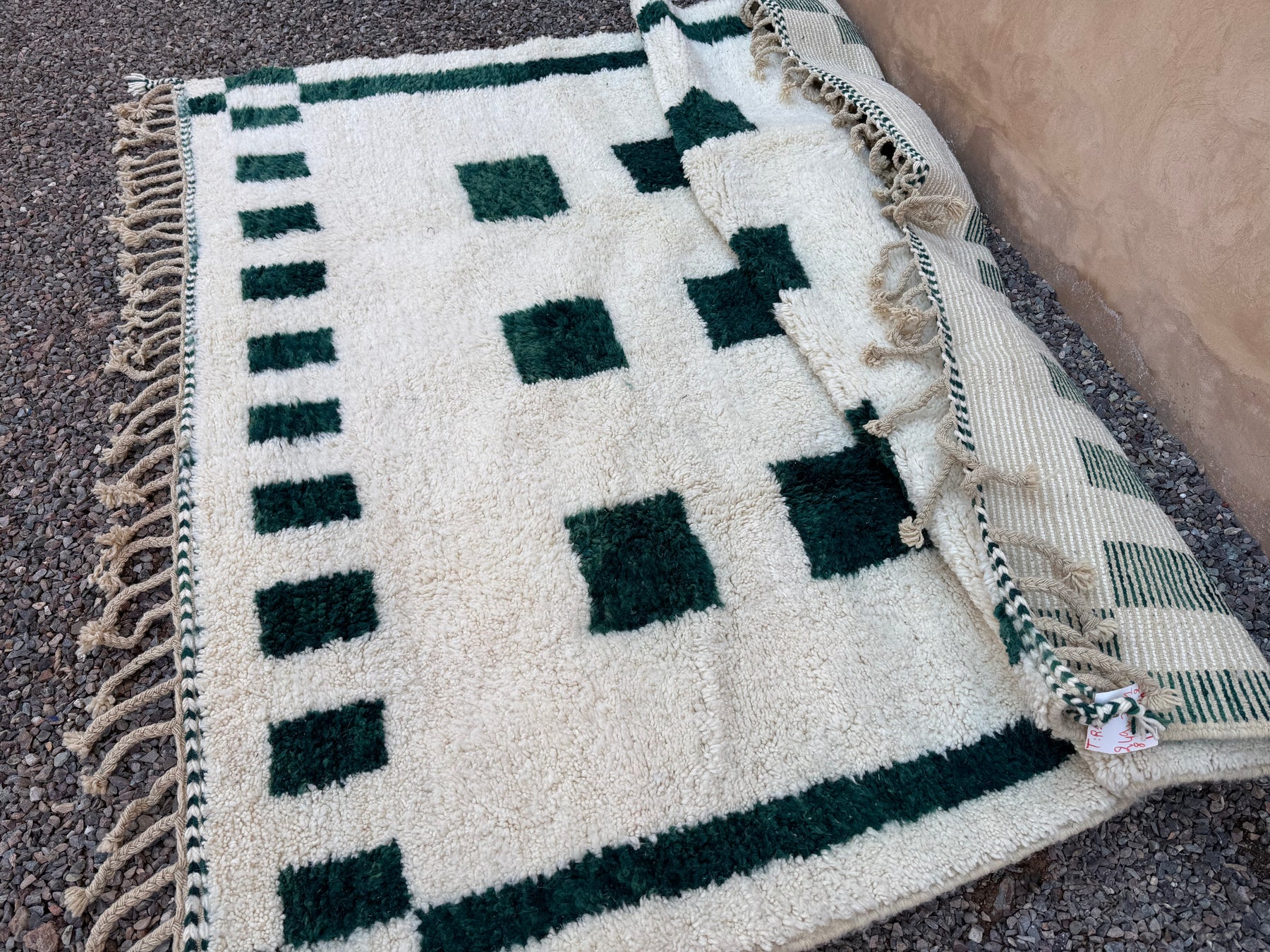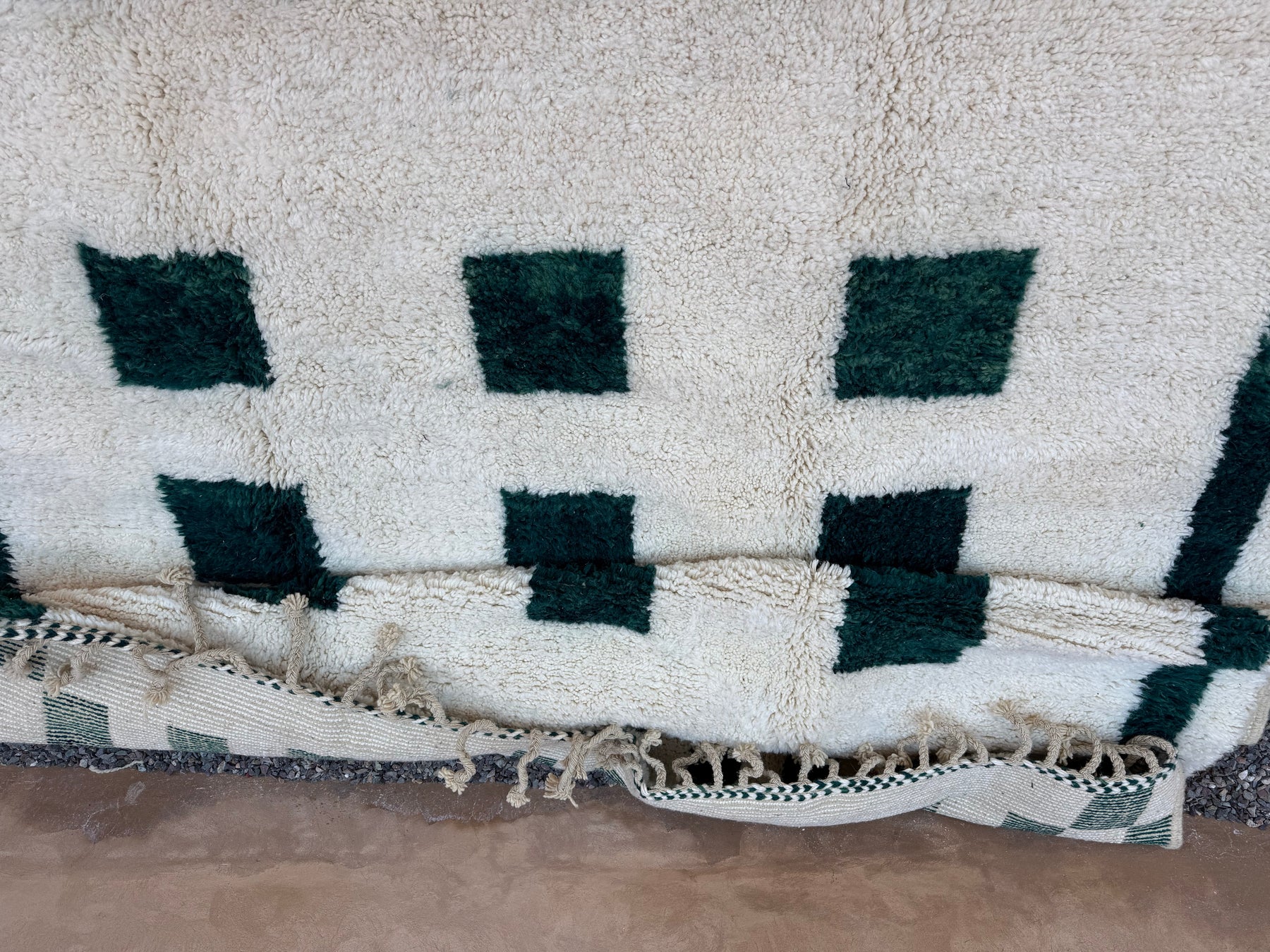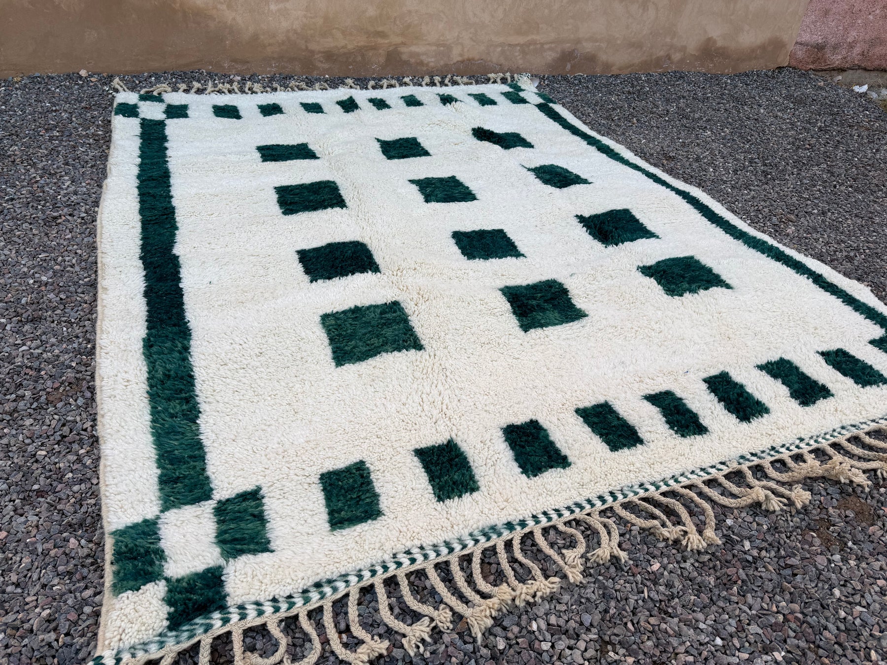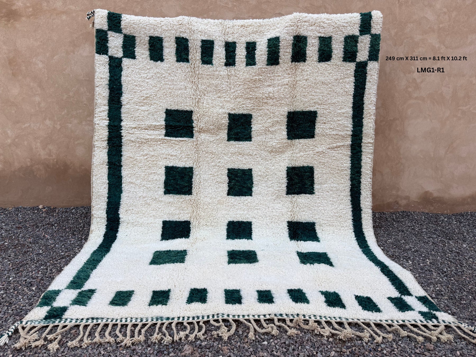 Discover timeless Moroccan craftsmanship with this Berber rug, handwoven by artisans using 100% natural wool. Set against a creamy ivory backdrop, its bold forest green checkered pattern brings a modern twist to traditional design—making it a standout piece for any room.