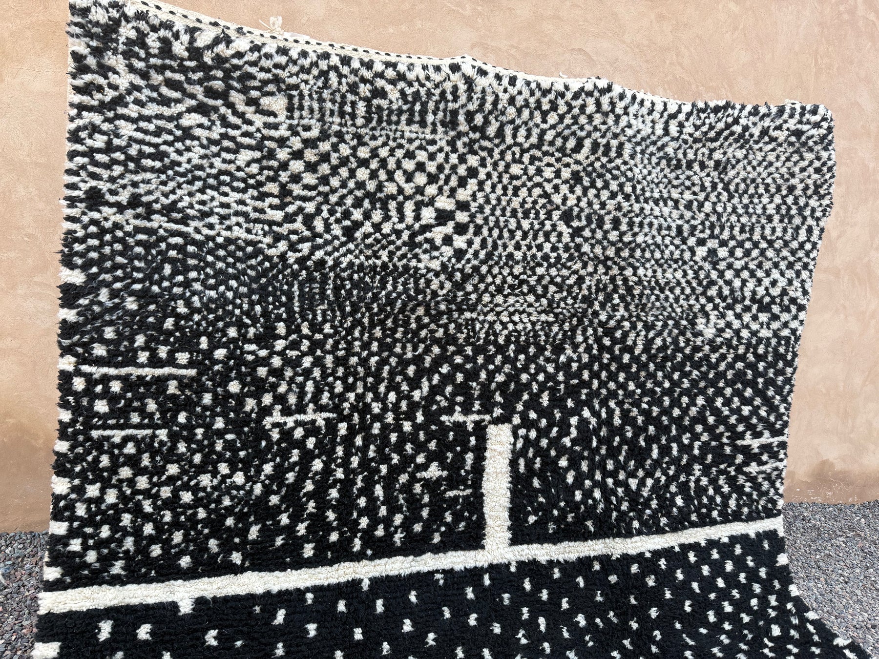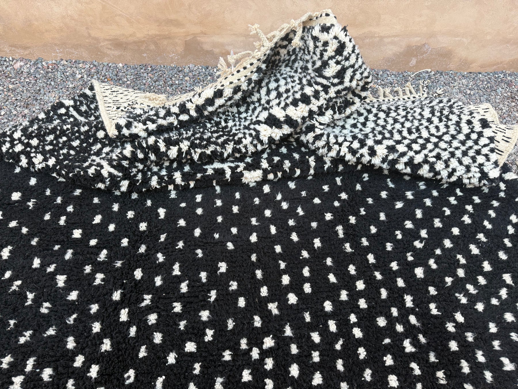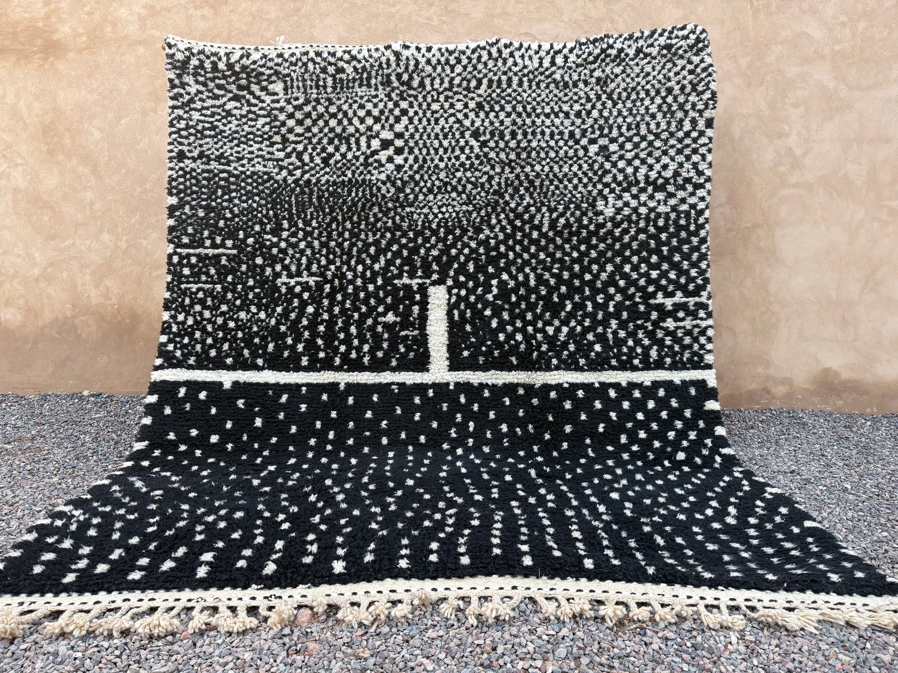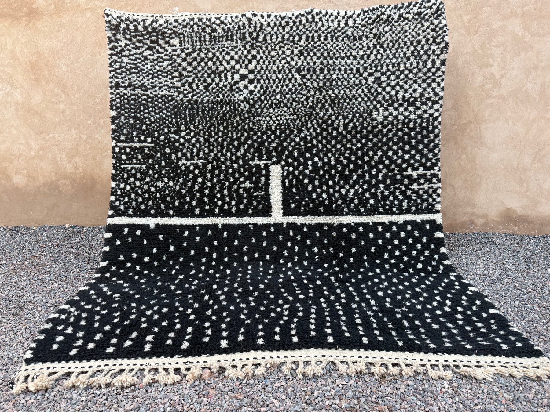 Make a bold yet timeless statement with this handcrafted Moroccan rug, featuring a black wool base with intricate ivory dotted patterns. Inspired by traditional Berber symbolism and woven by skilled artisans in the Atlas Mountains, this piece merges heritage with modern aesthetic appeal.
