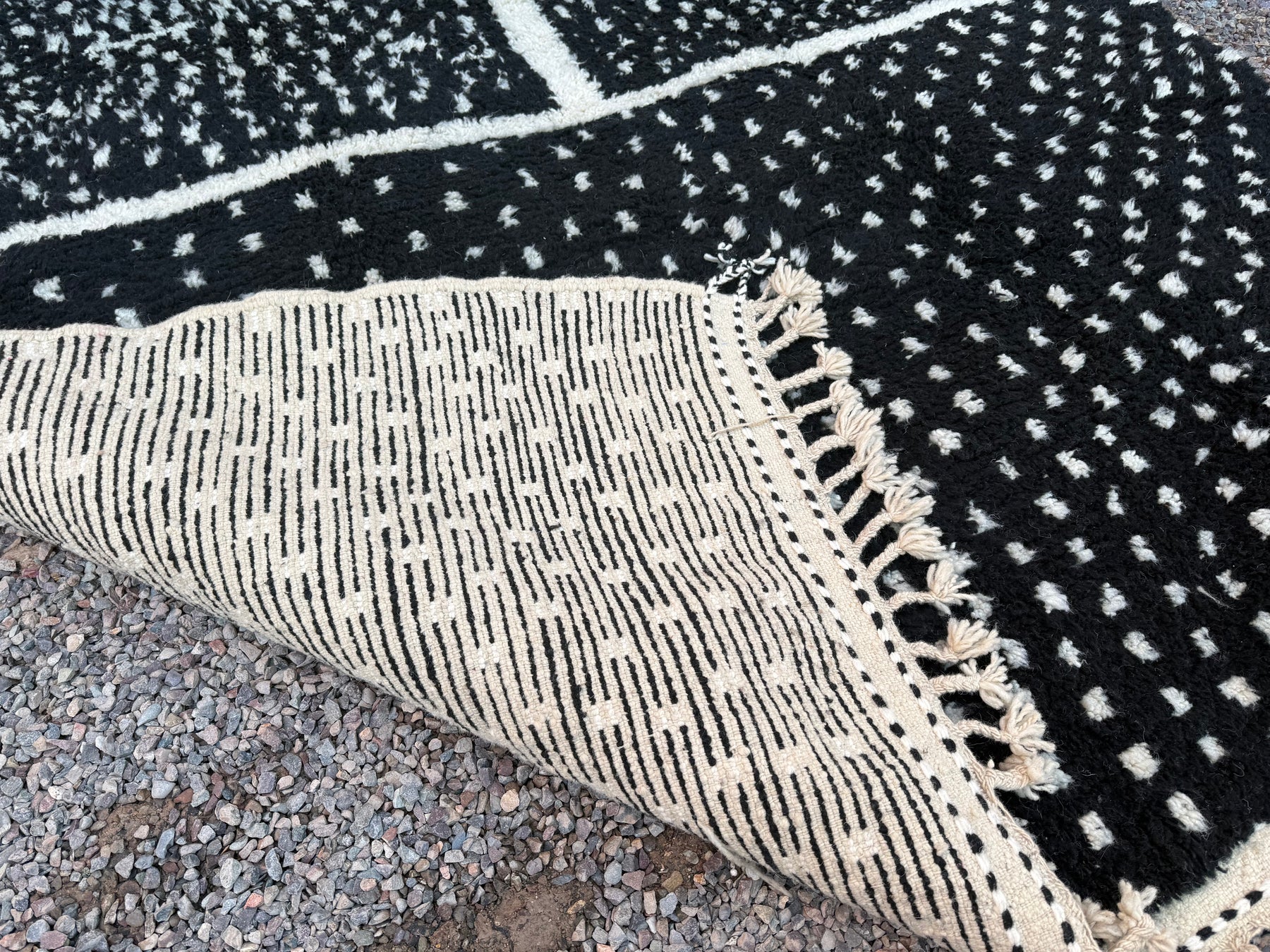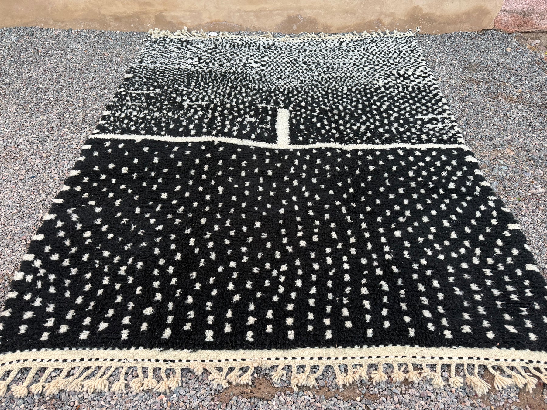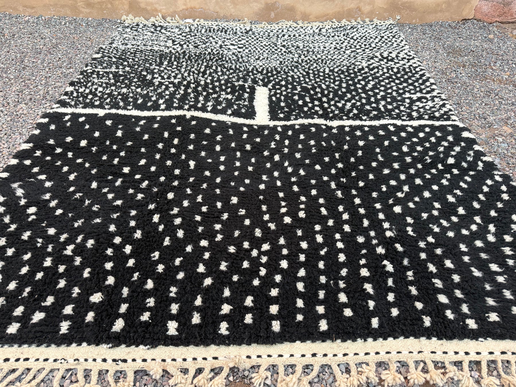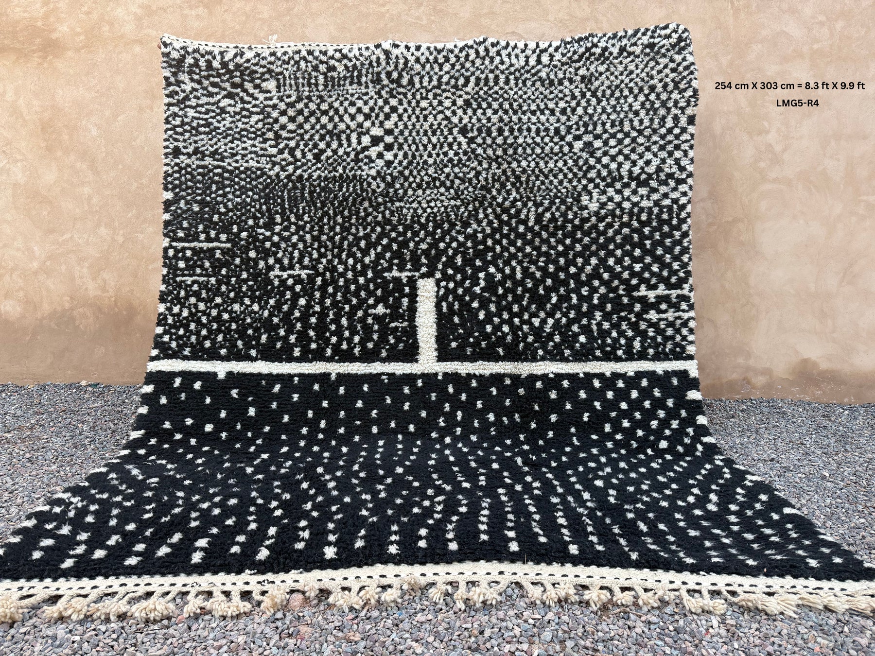 Make a bold yet timeless statement with this handcrafted Moroccan rug, featuring a black wool base with intricate ivory dotted patterns. Inspired by traditional Berber symbolism and woven by skilled artisans in the Atlas Mountains, this piece merges heritage with modern aesthetic appeal.