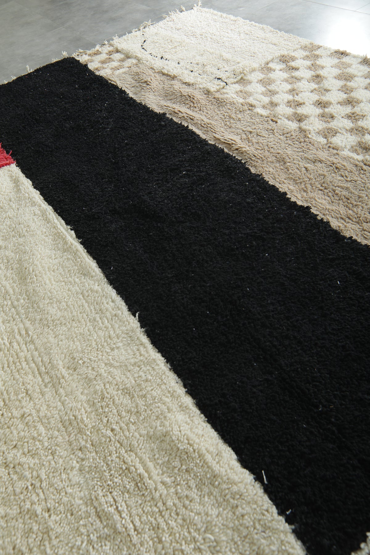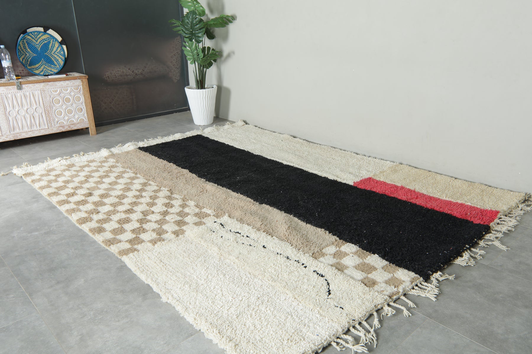 This one-of-a-kind Moroccan wool rug features a trendy mix of checkerboard patterns, bold black stripes, and vibrant red accents on a soft ivory base. Handmade by skilled artisans, this patchwork-style rug adds personality and warmth to any room. A perfect choice for design-forward interiors seeking a touch of Moroccan soul with a contemporary edge.