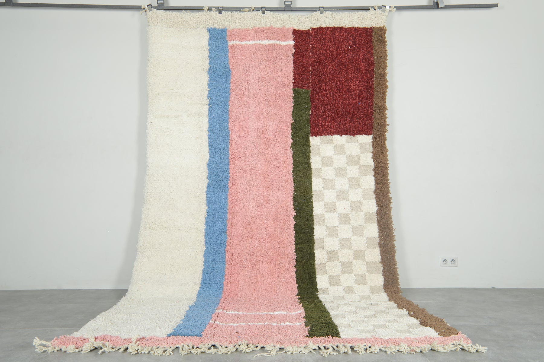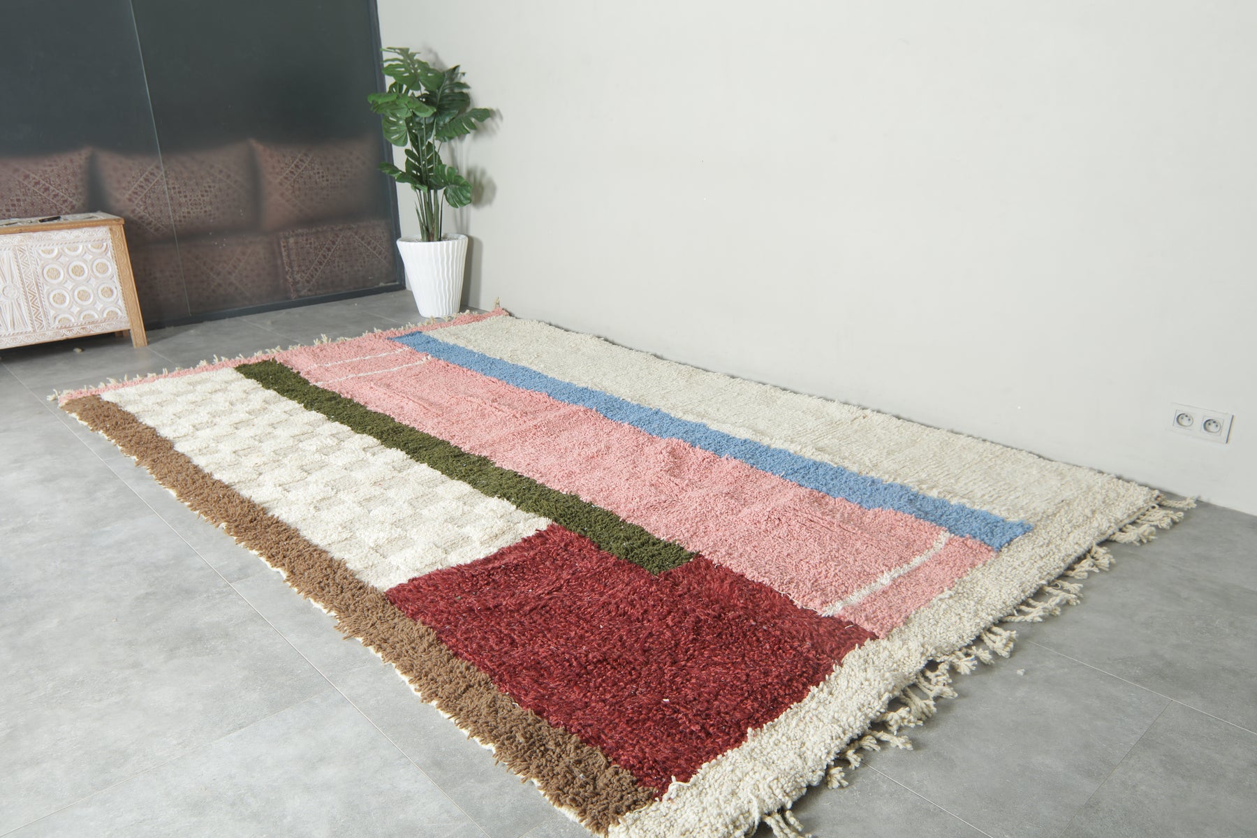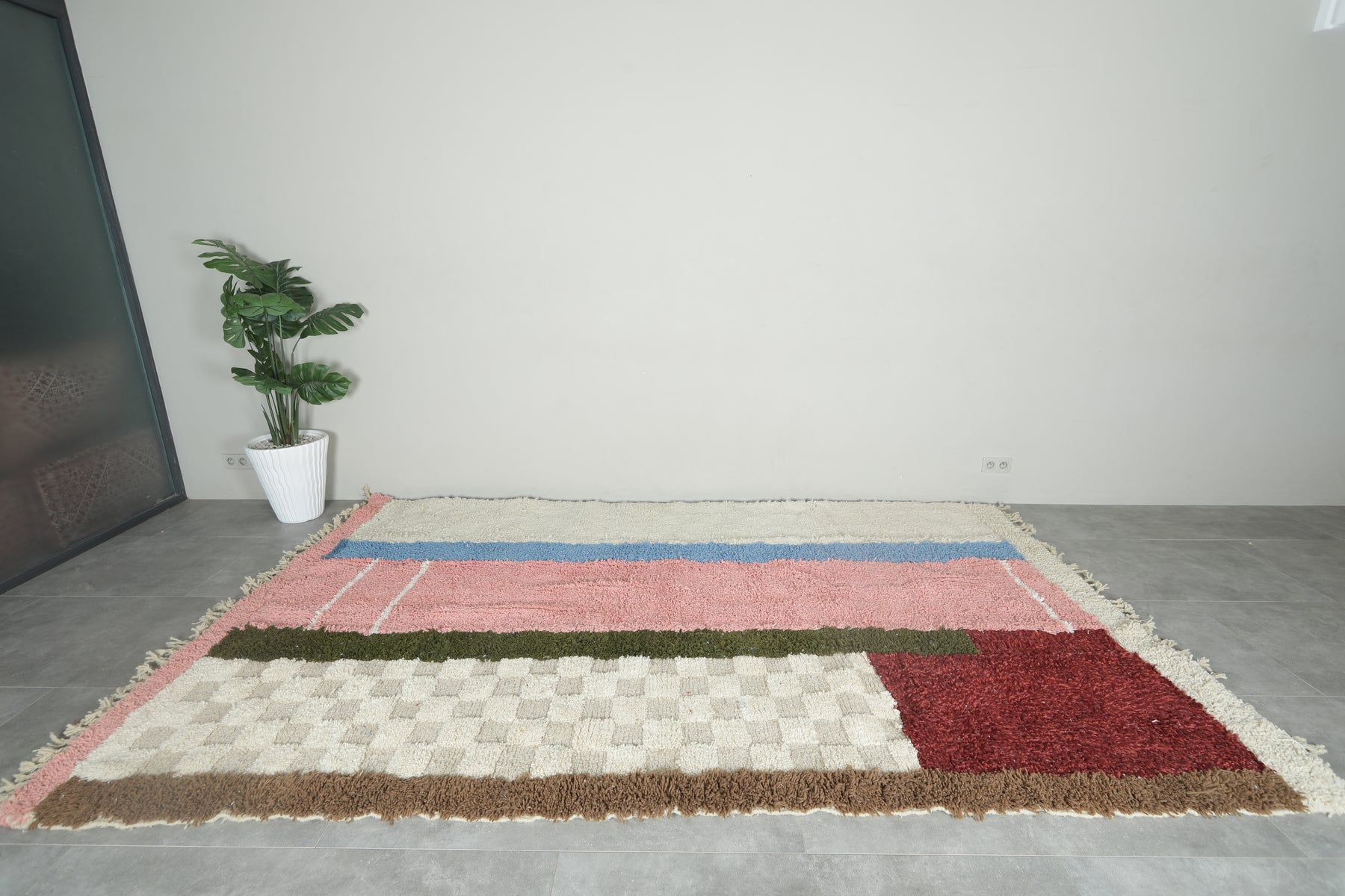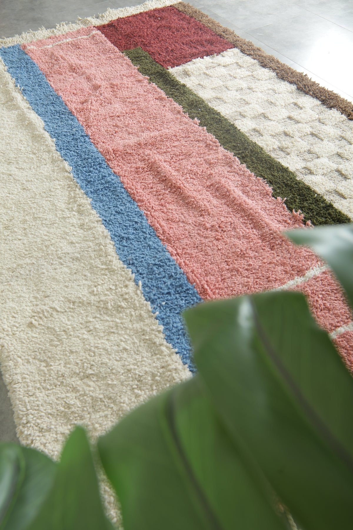 Add a bold, artistic touch to your home with this handmade Moroccan wool rug, crafted in the heart of the Atlas Mountains. Featuring a striking color-block design, this rug combines vibrant hues of cream, pink, blue, red, green, beige, and brown—each section handwoven into a modern patchwork layout inspired by traditional Berber craftsmanship.