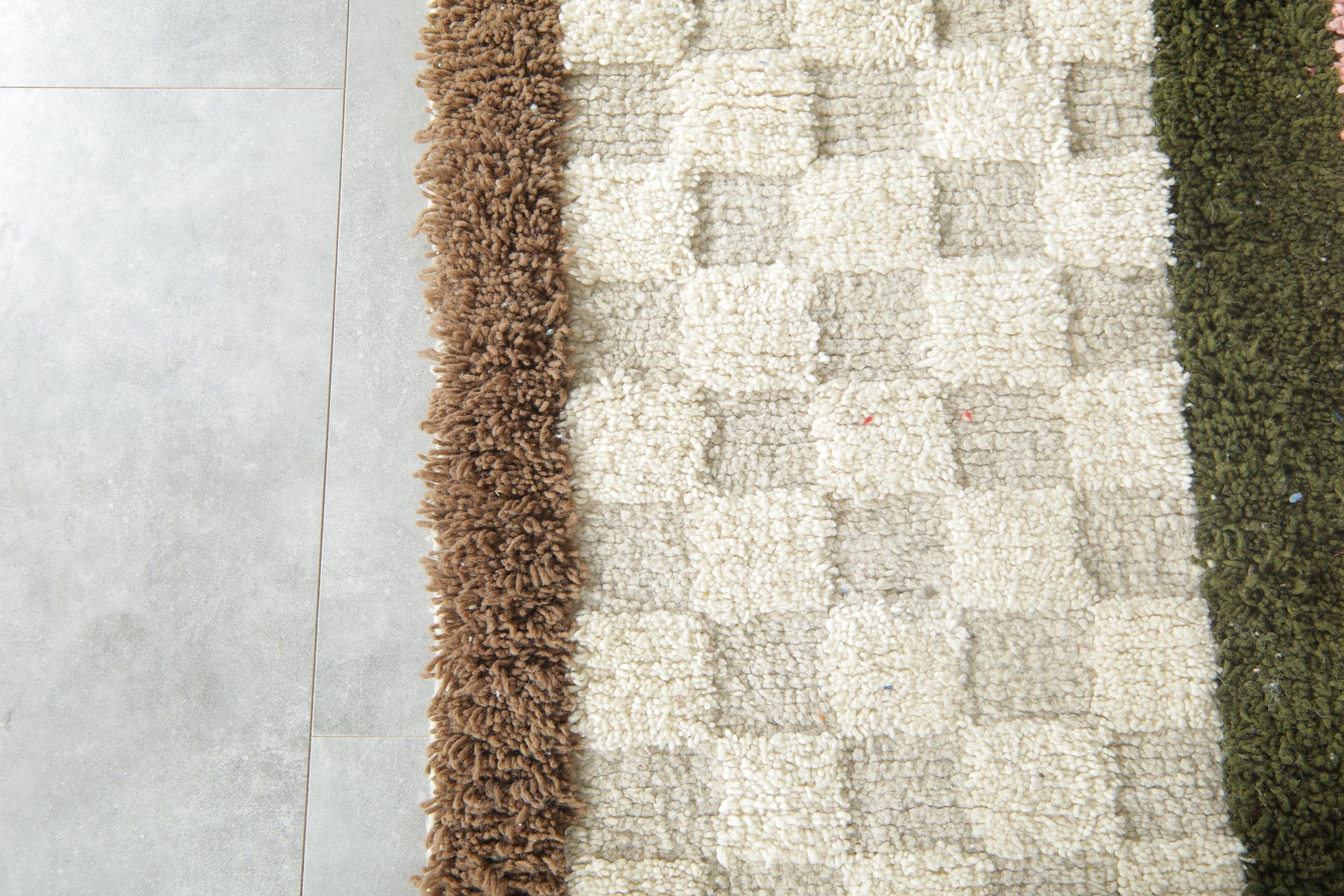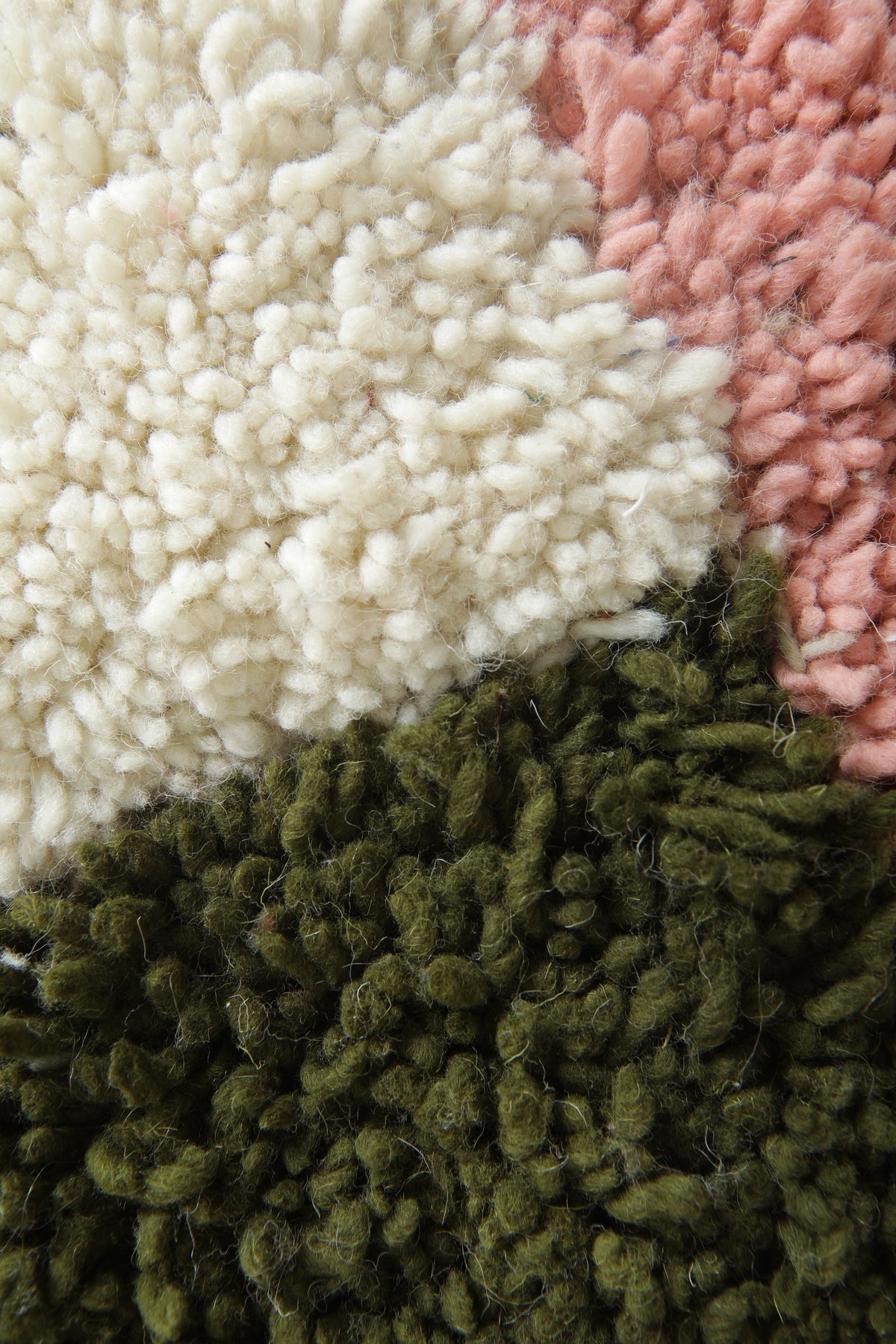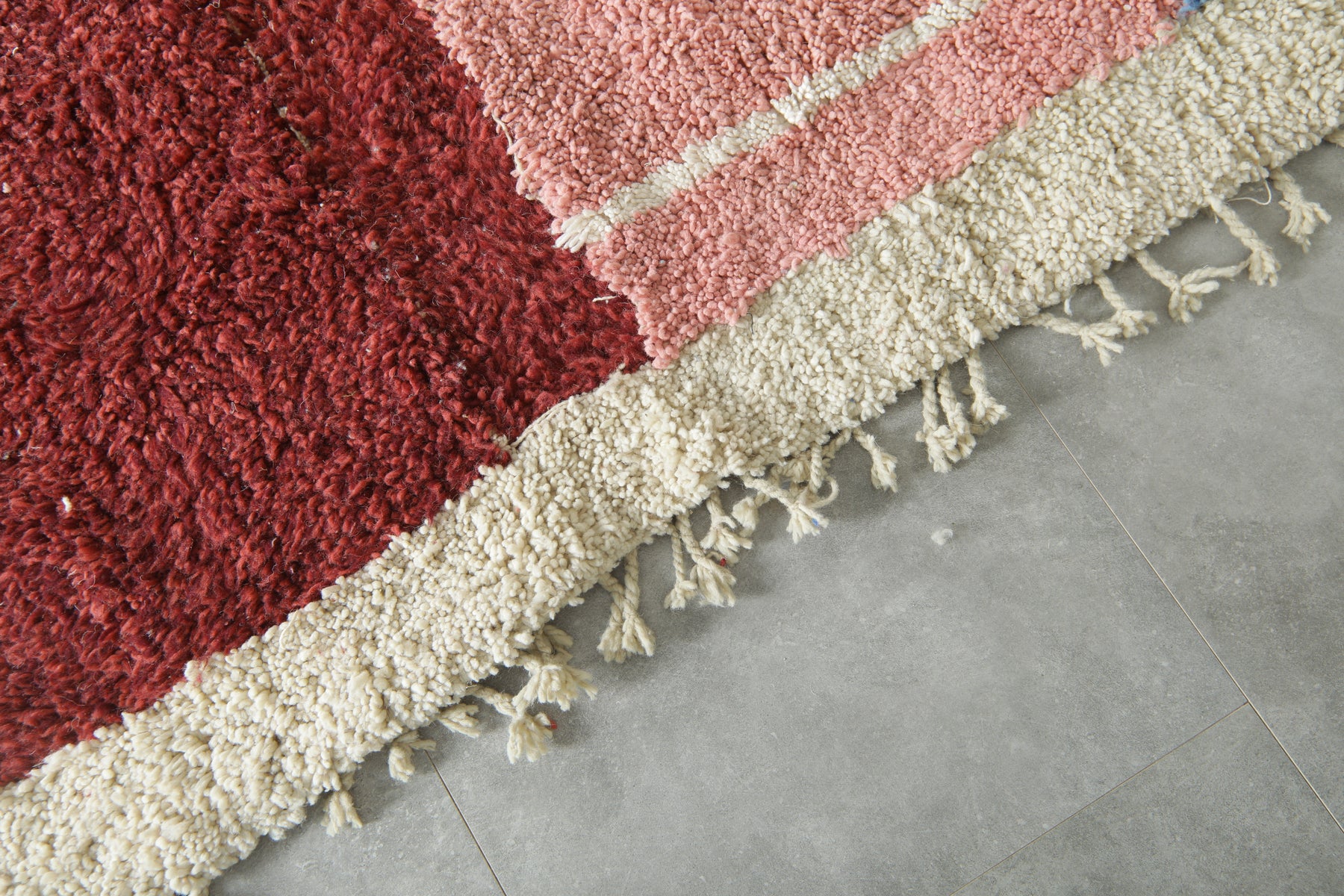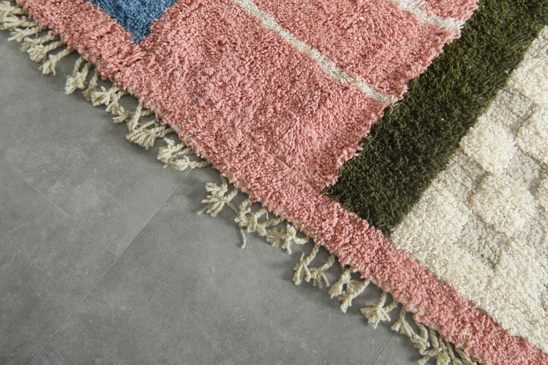 Add a bold, artistic touch to your home with this handmade Moroccan wool rug, crafted in the heart of the Atlas Mountains. Featuring a striking color-block design, this rug combines vibrant hues of cream, pink, blue, red, green, beige, and brown—each section handwoven into a modern patchwork layout inspired by traditional Berber craftsmanship.