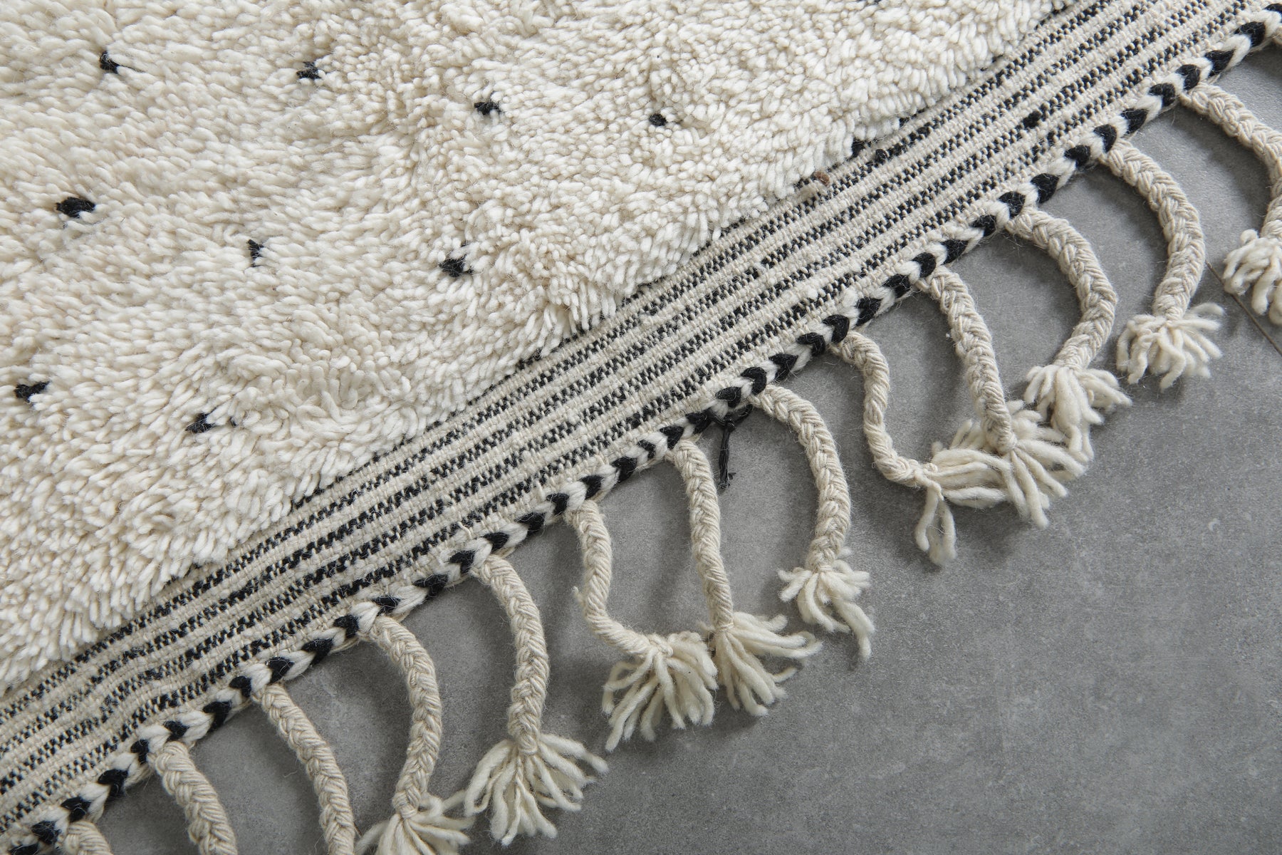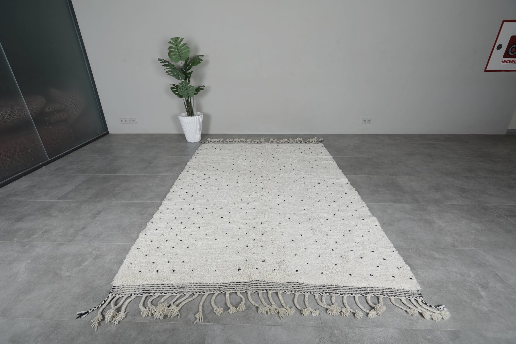 Luxurious Beni Ourain rug measuring 6.3 x 9.1 ft, handwoven from premium Moroccan wool. Featuring a modern dotted pattern on a soft ivory base, this minimalist Berber carpet adds warmth, texture, and sophistication to contemporary, Scandinavian, and bohemian interiors.