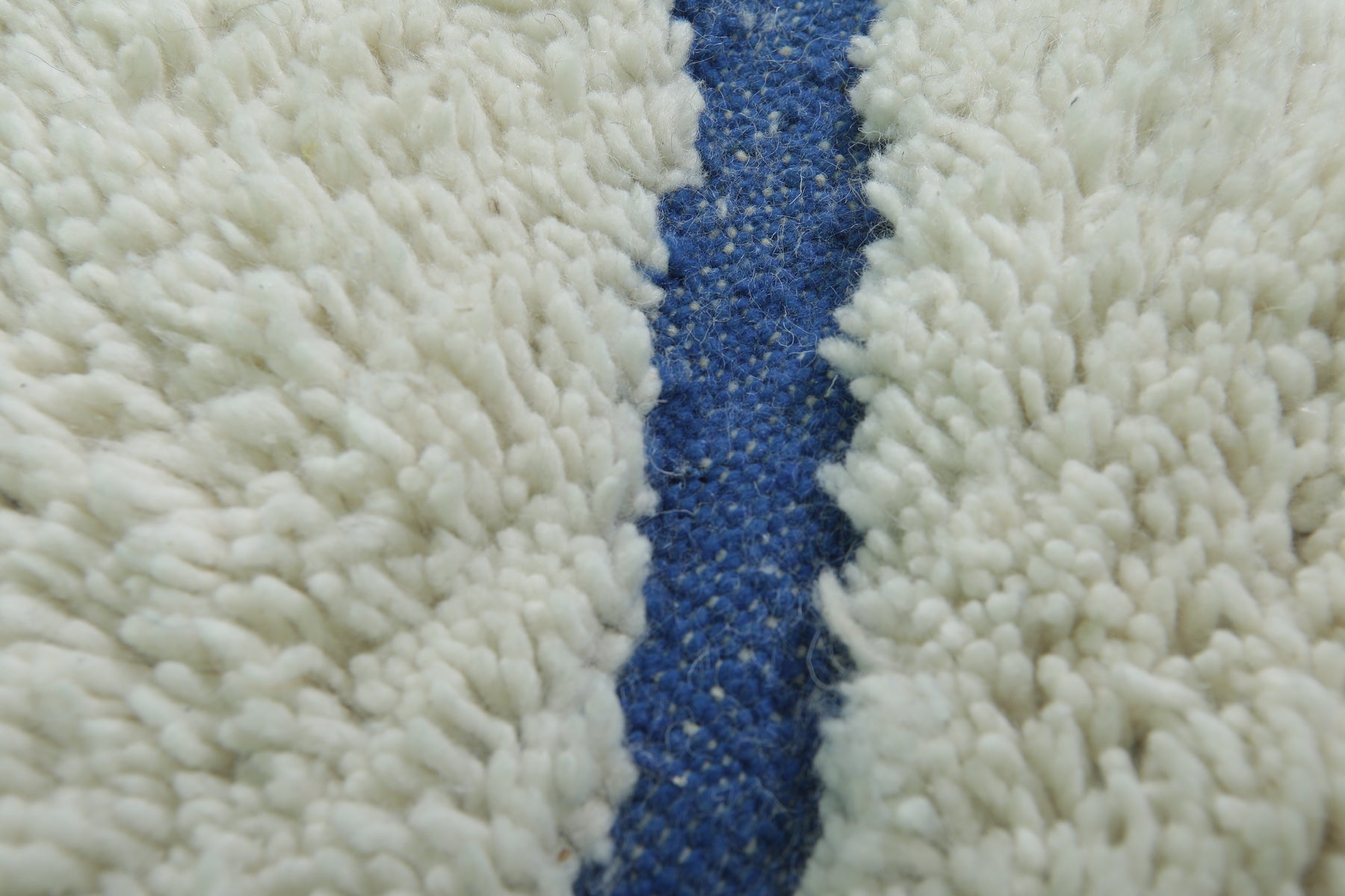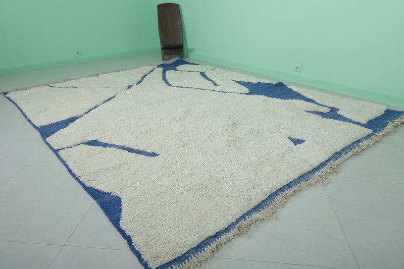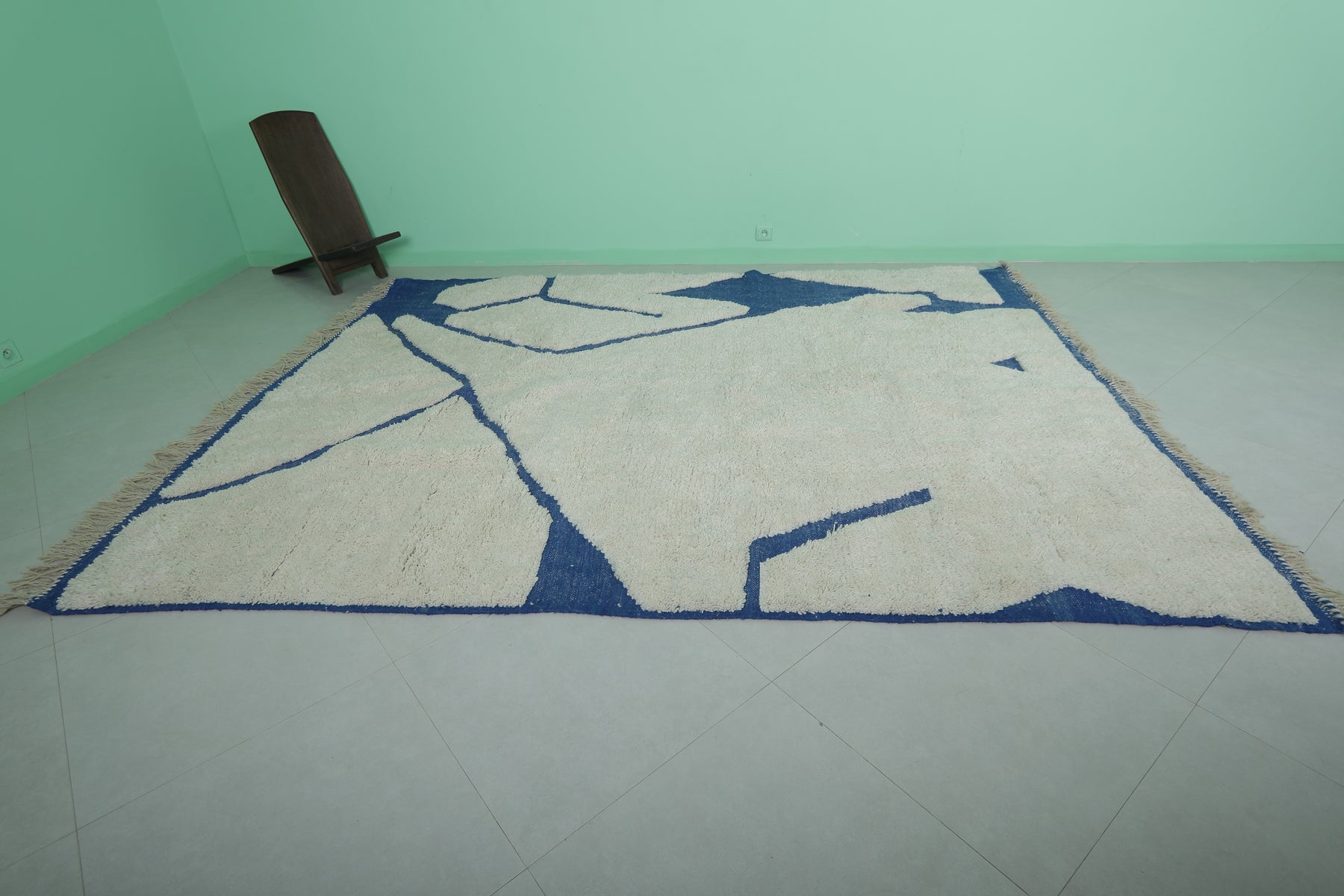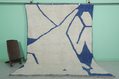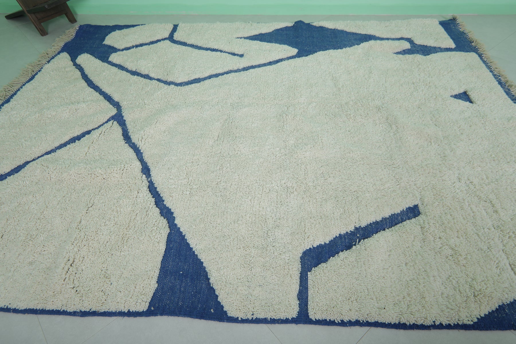 Add a modern artistic touch to your space with this Hand-Knotted Moroccan Rug, sized at 7.9 x 10.3 feet (243 CM x 313 CM). Featuring a striking blue and ivory abstract design, this premium wool rug offers a plush texture and exceptional craftsmanship.