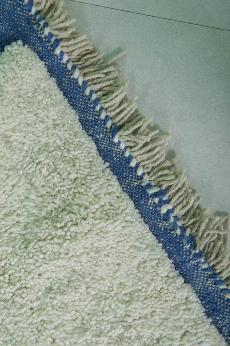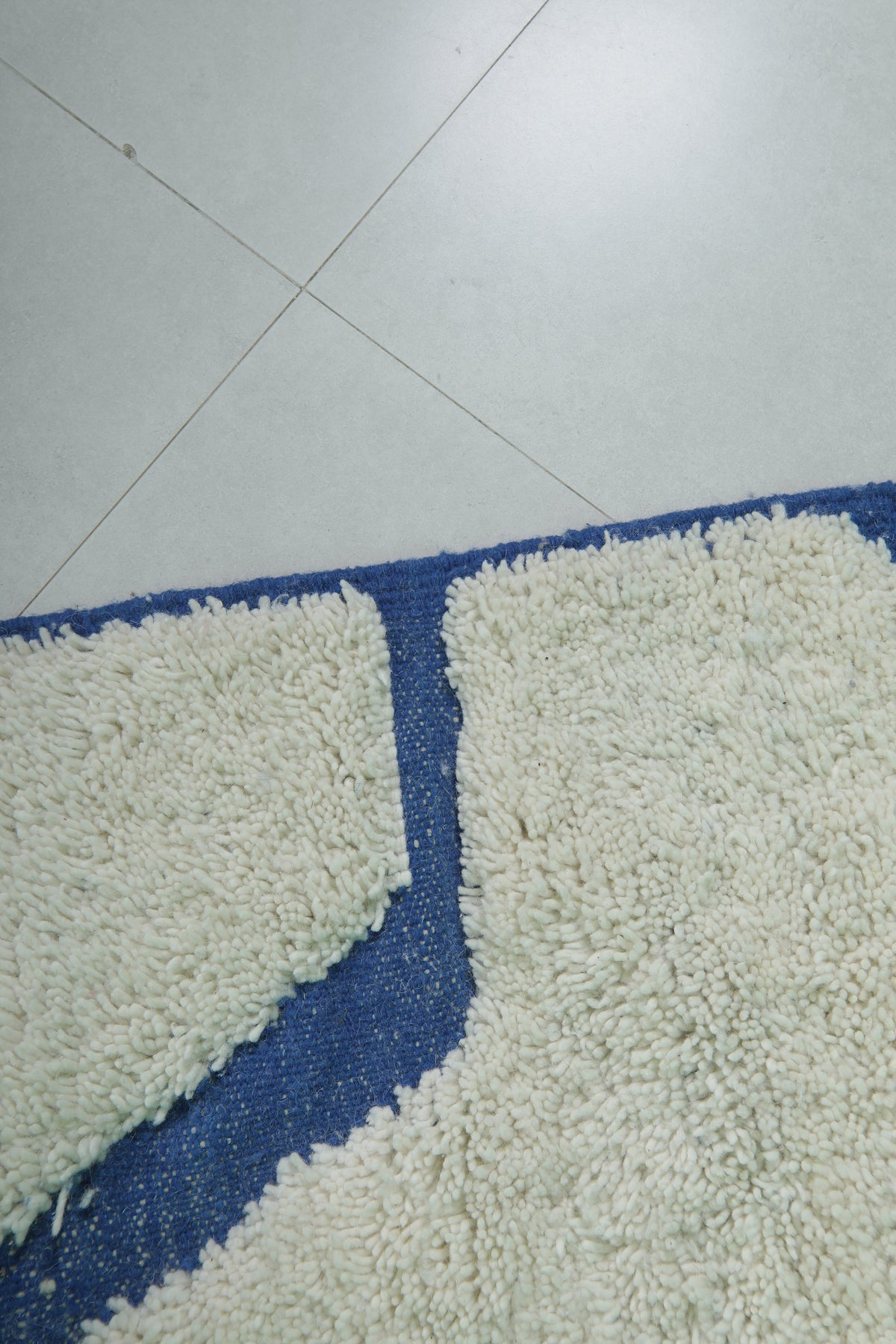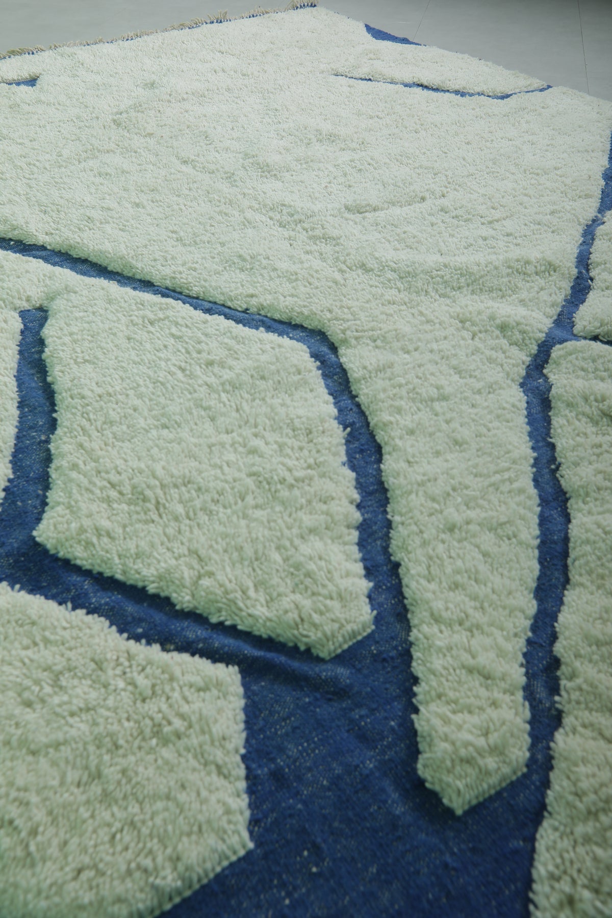 Add a modern artistic touch to your space with this Hand-Knotted Moroccan Rug, sized at 7.9 x 10.3 feet (243 CM x 313 CM). Featuring a striking blue and ivory abstract design, this premium wool rug offers a plush texture and exceptional craftsmanship.