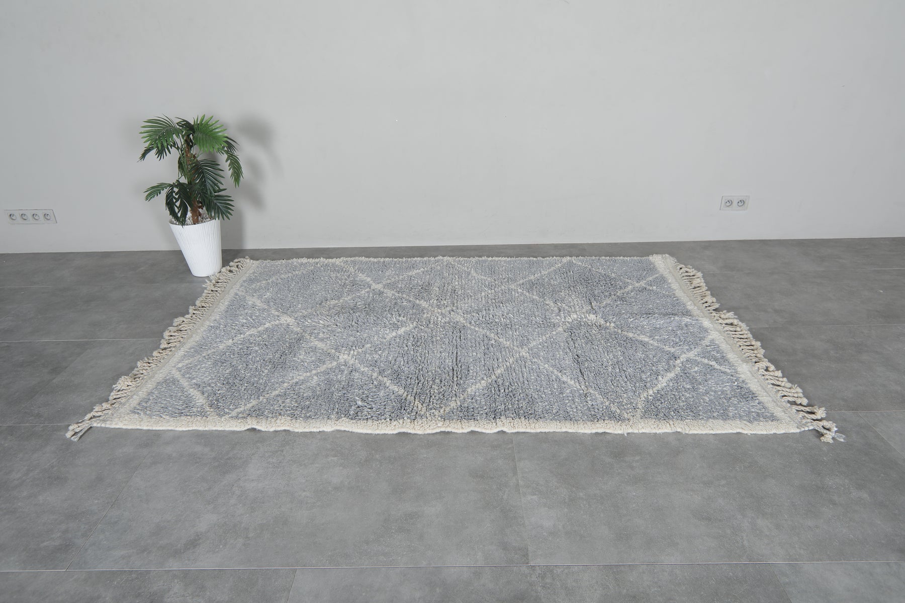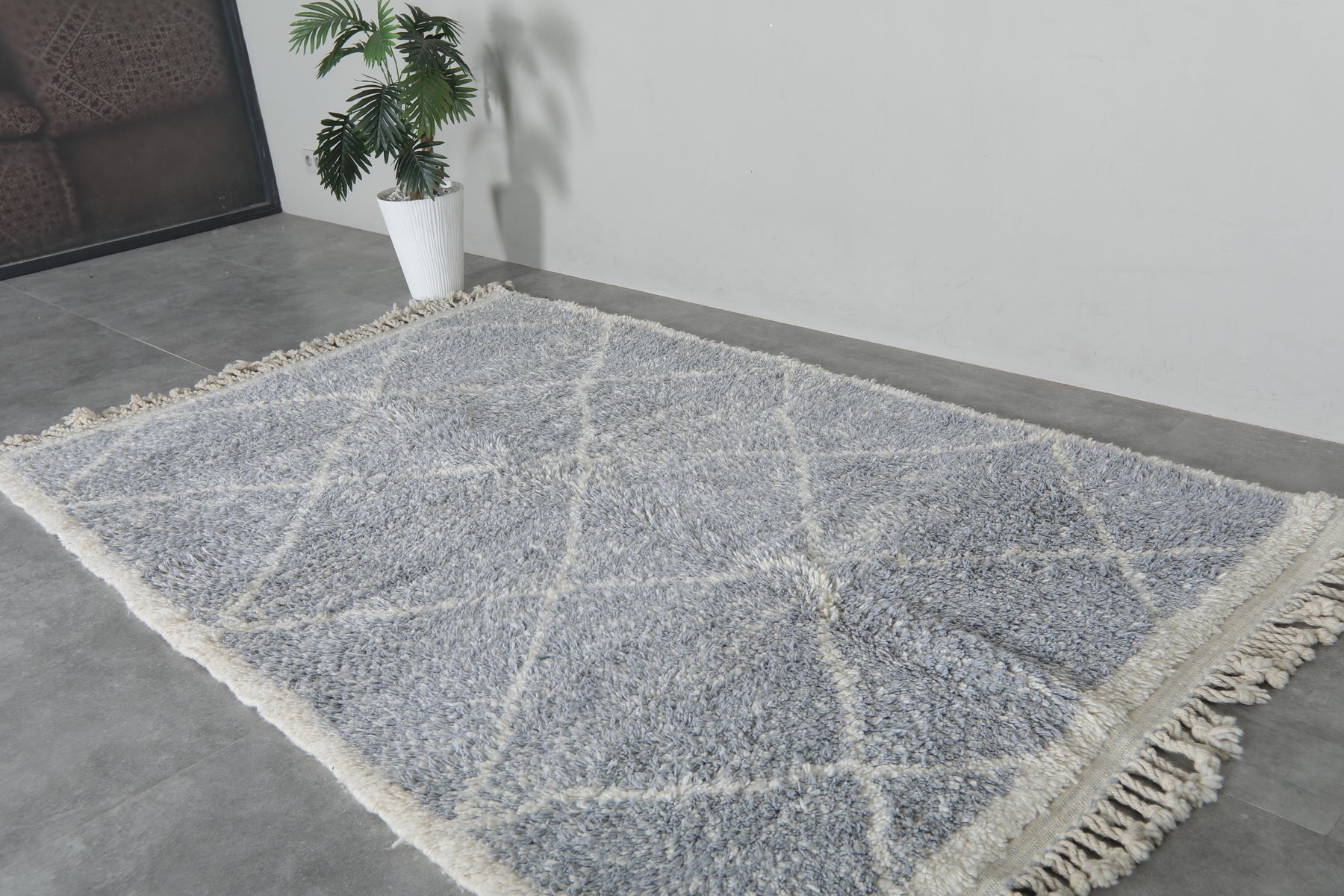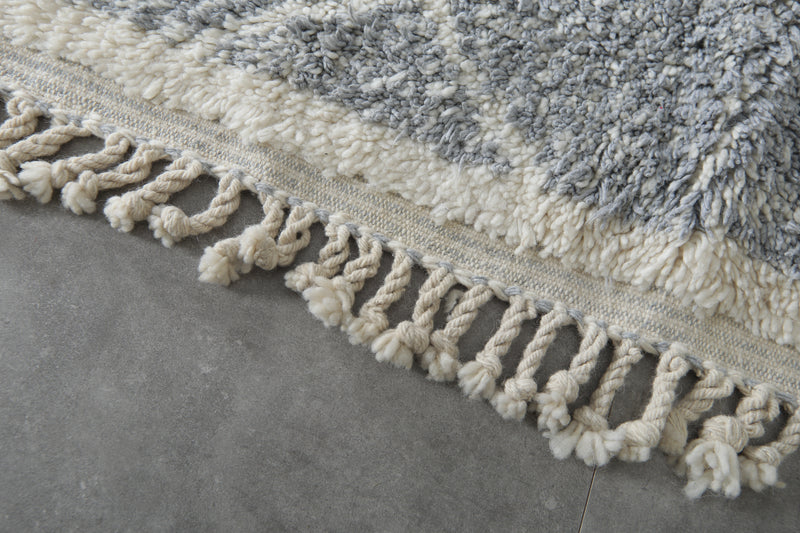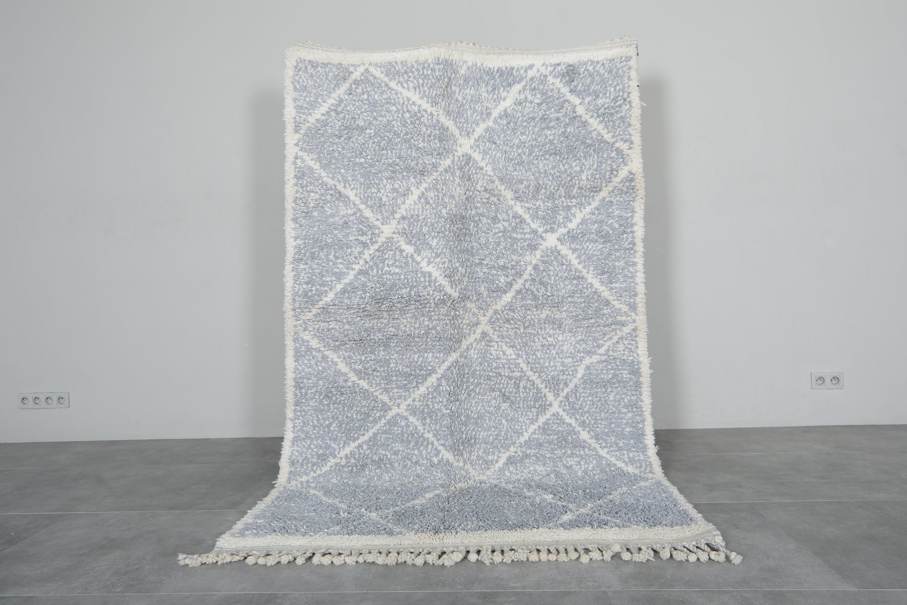Enhance your home with this Hand-Knotted Moroccan Wool Rug, sized at 5 x 7.8 feet (153 CM x 238 CM). Featuring a timeless diamond pattern in soft gray and ivory, this plush, high-quality rug blends traditional Moroccan craftsmanship with modern elegance.