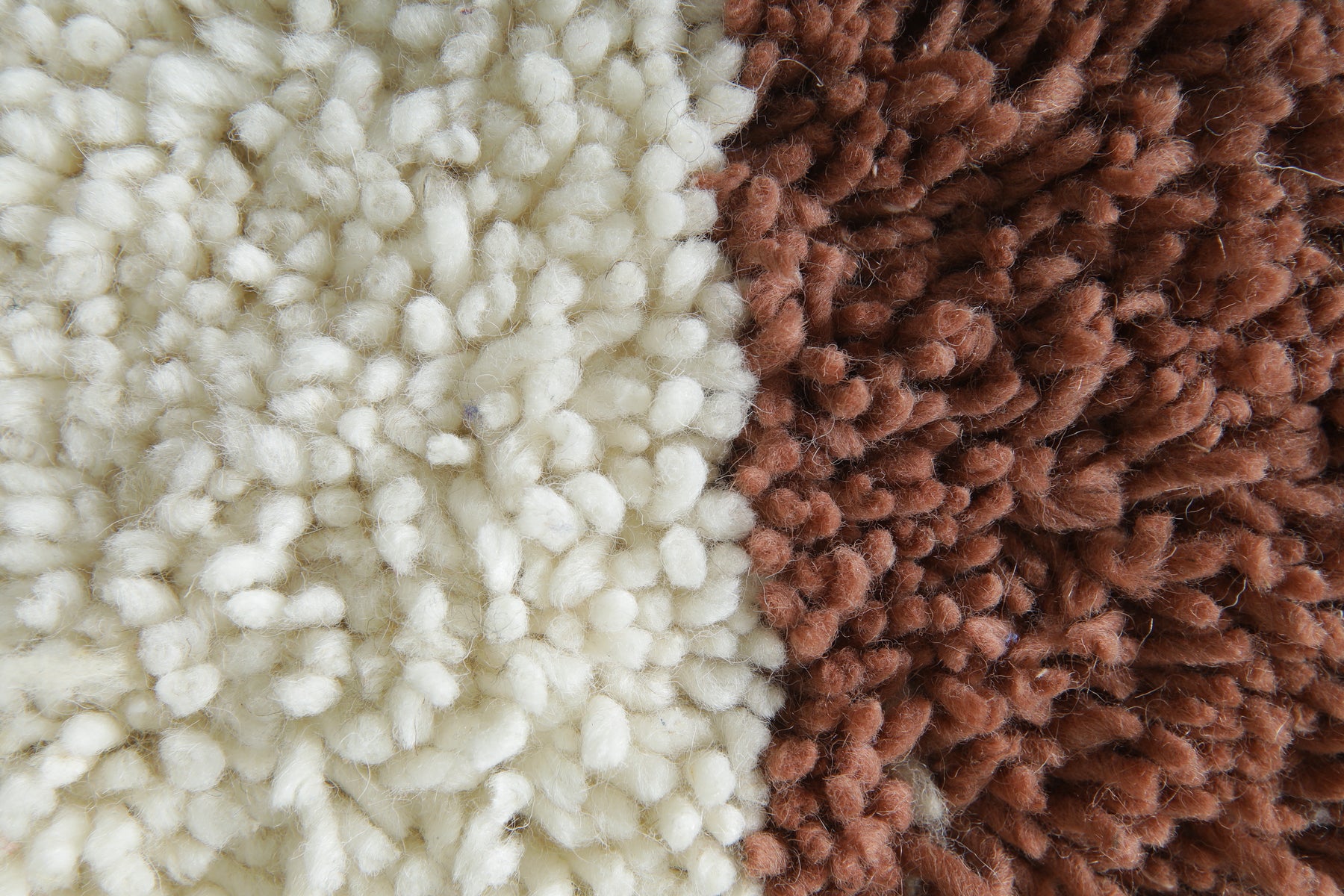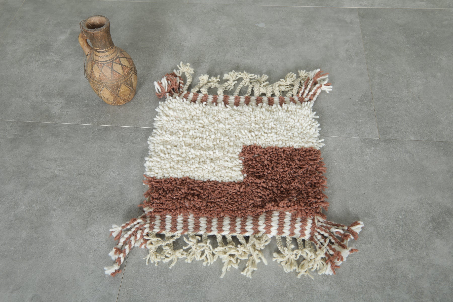 Add a touch of artisanal charm to your space with this handmade Moroccan mini rug, featuring a bold color block design in creamy white and rich terracotta brown. Crafted from premium wool with intricate braided fringes, this small decorative rug is perfect for tabletops, wall accents, or as a unique home décor piece. Ideal for boho, rustic, or modern interiors.