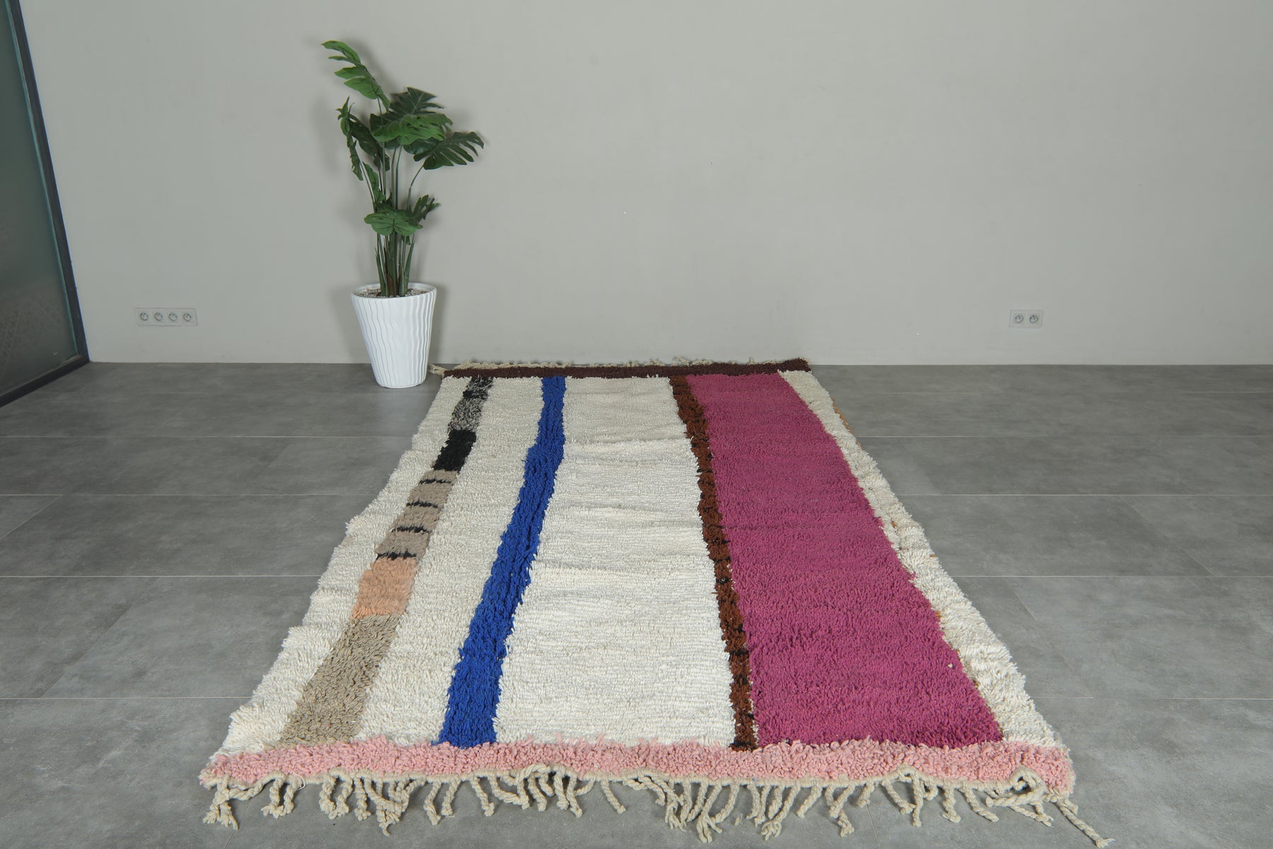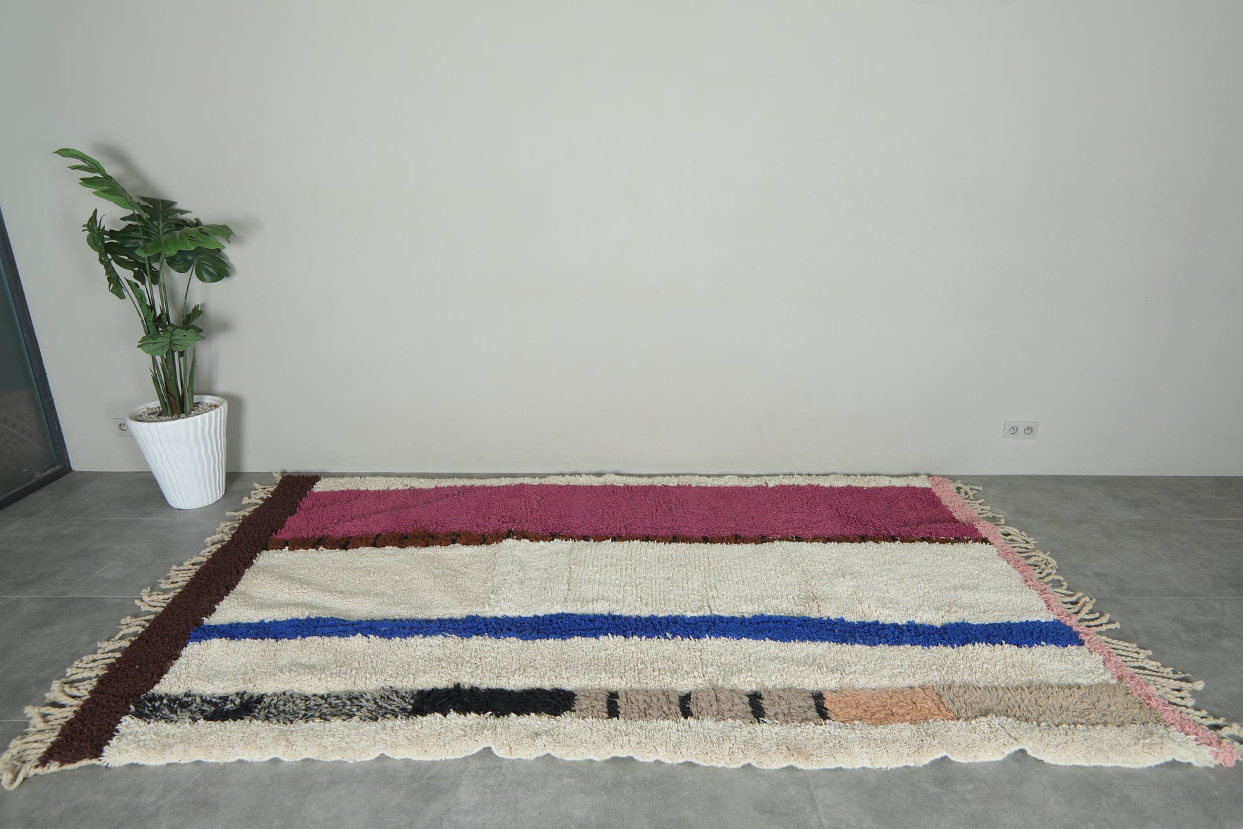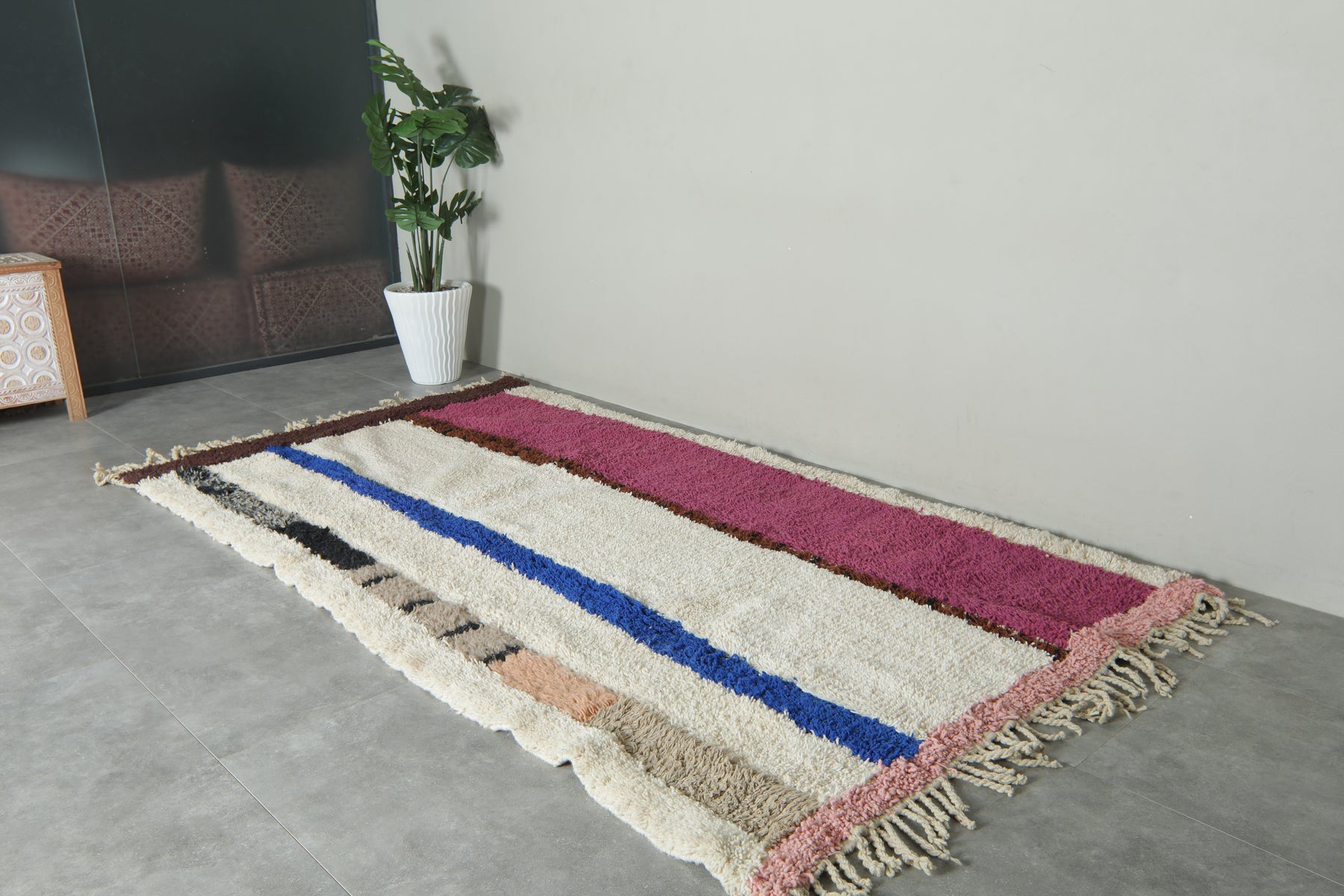 Bring personality and handcrafted style to your space with this stunning Moroccan striped wool rug. Its stunning blend of fuchsia, cobalt blue, ivory, beige, peach, and black, this handwoven rug is a true showstopper. The soft cream background is a beautiful contrast to the stripes, resulting in a rich-looking piece that easily transitions to modern, bohemian, or eclectic decor. Hand-woven in wool, this rug is durable and smooth — perfect for living rooms, hallways, or studios. A great way of adding color and culture into your room.