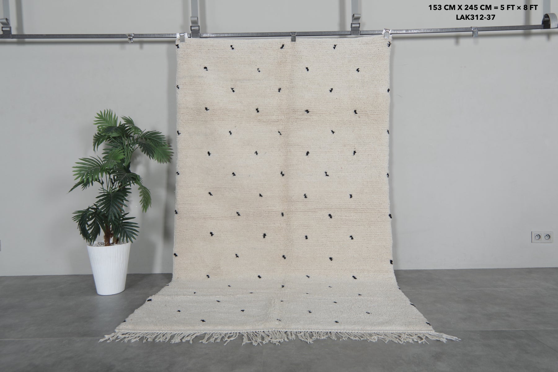 Elevate your space with this Handwoven Moroccan Wool Rug, sized at 5 x 8 feet (153 CM x 245 CM). Featuring a minimalist ivory design with delicate black accents, this timeless piece adds warmth and texture to any interior.