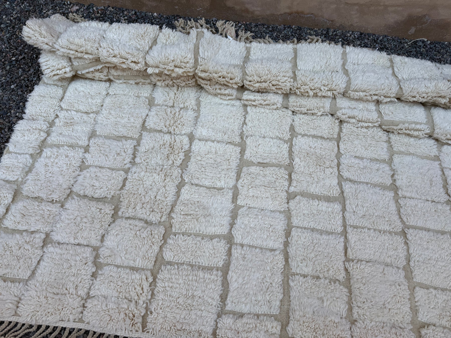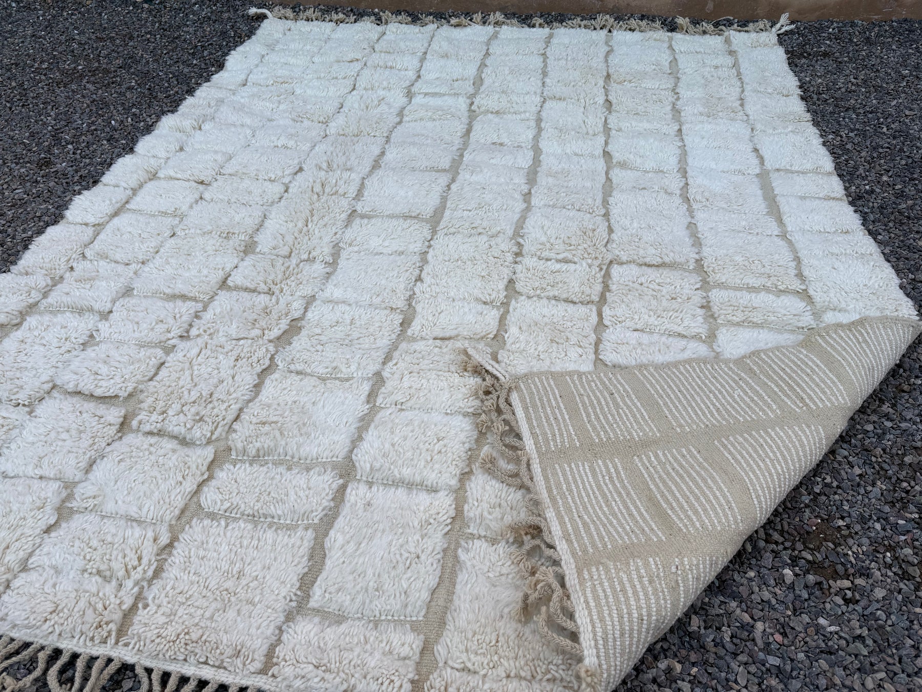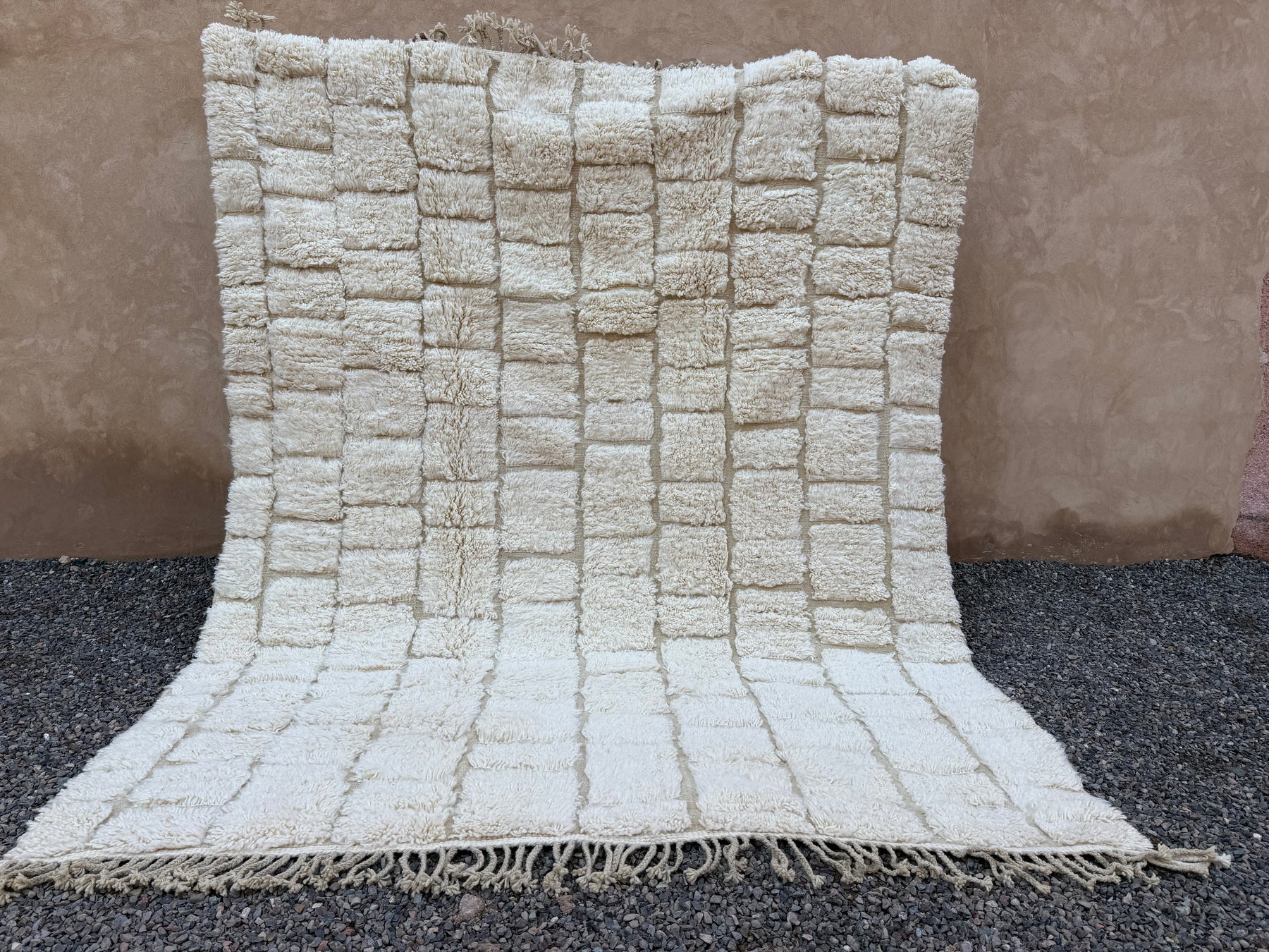 Embrace minimalism with warmth through this stunning ivory Moroccan rug, featuring a raised grid texture that adds subtle dimension and artisan charm. Expertly handwoven from 100% natural wool by Berber artisans in the Atlas Mountains, this rug combines soft luxury with timeless design.
