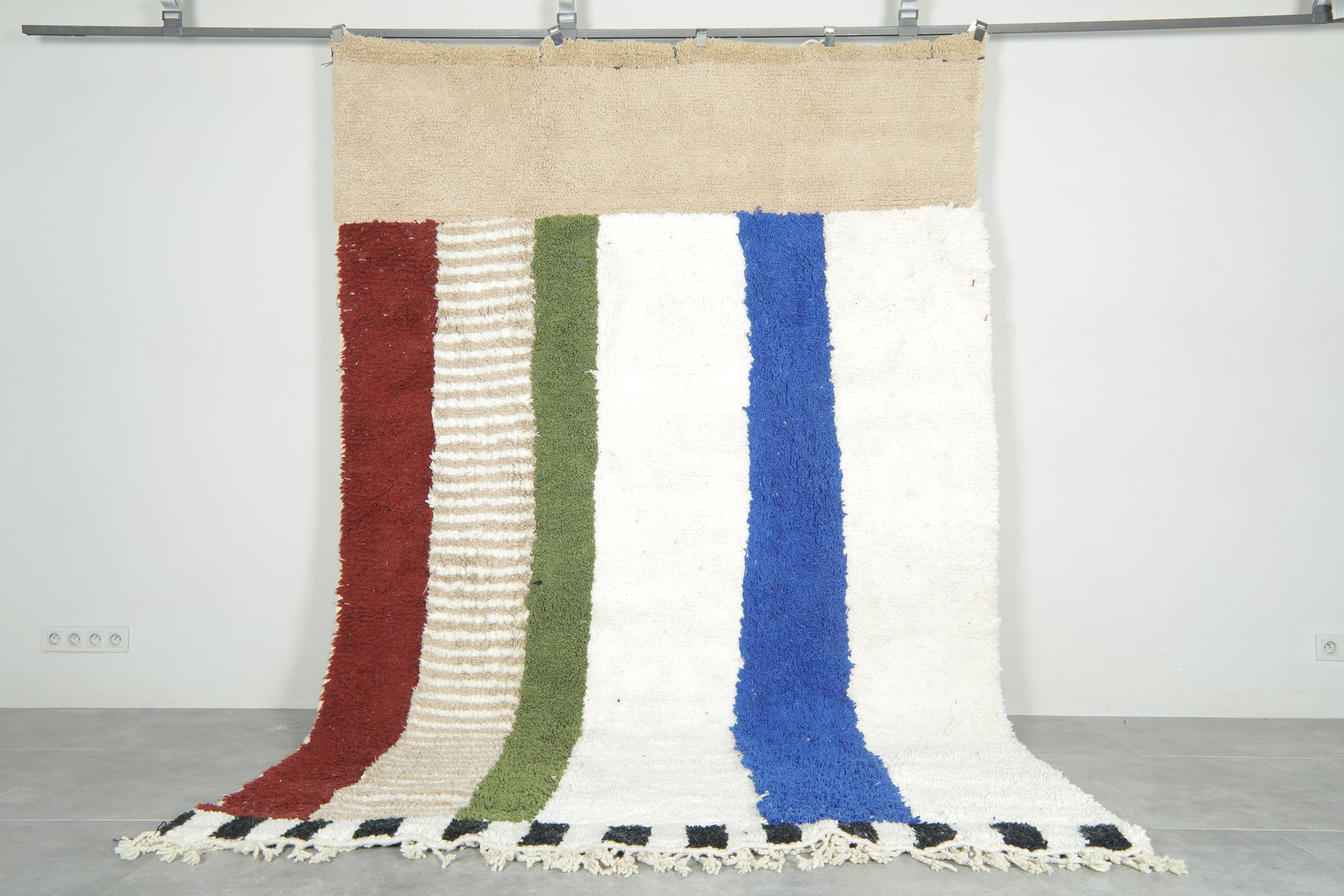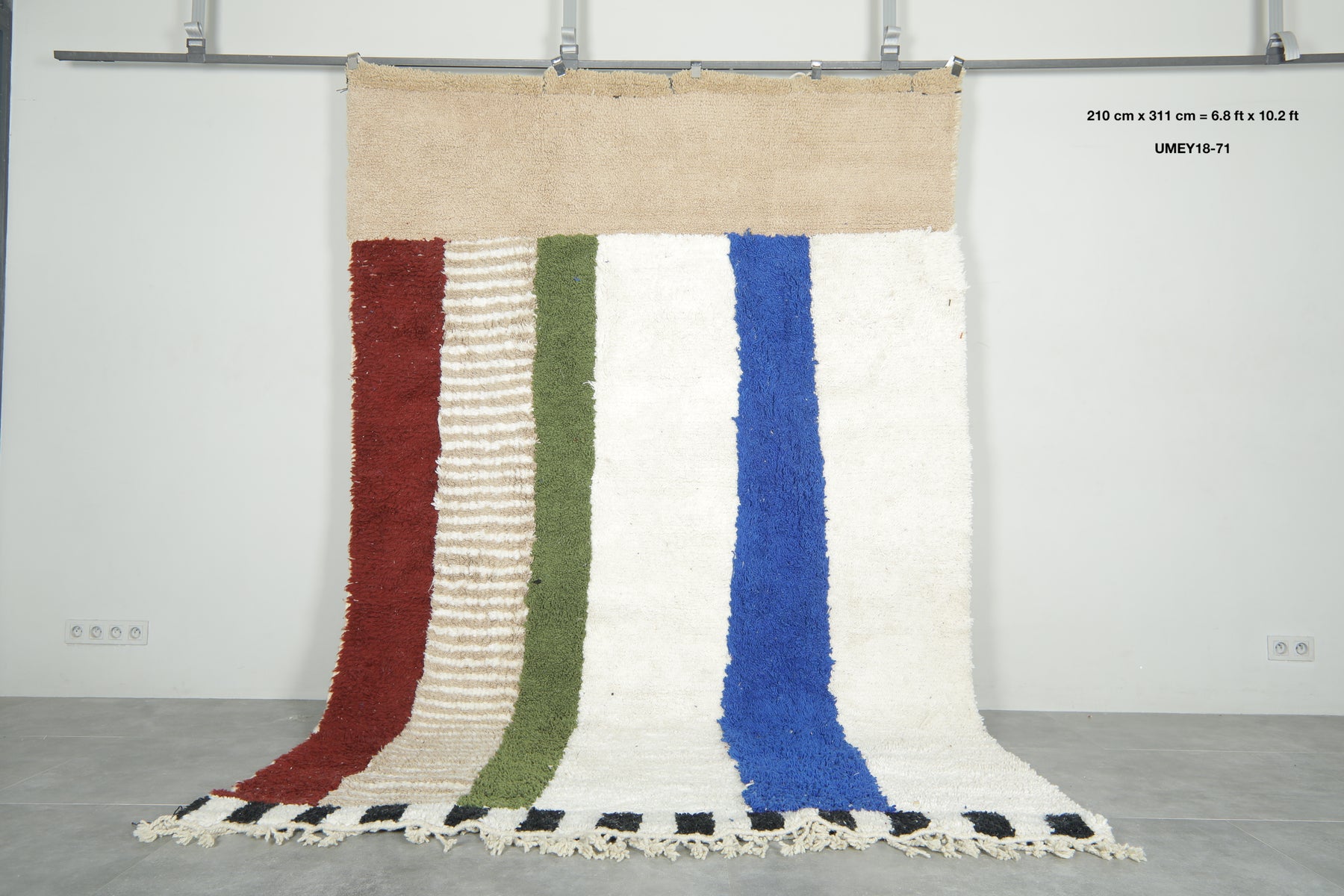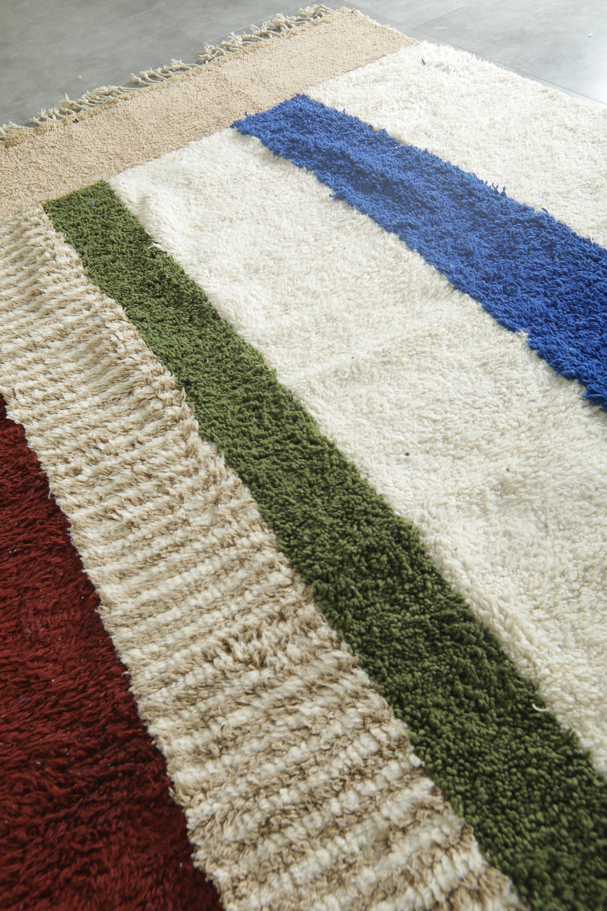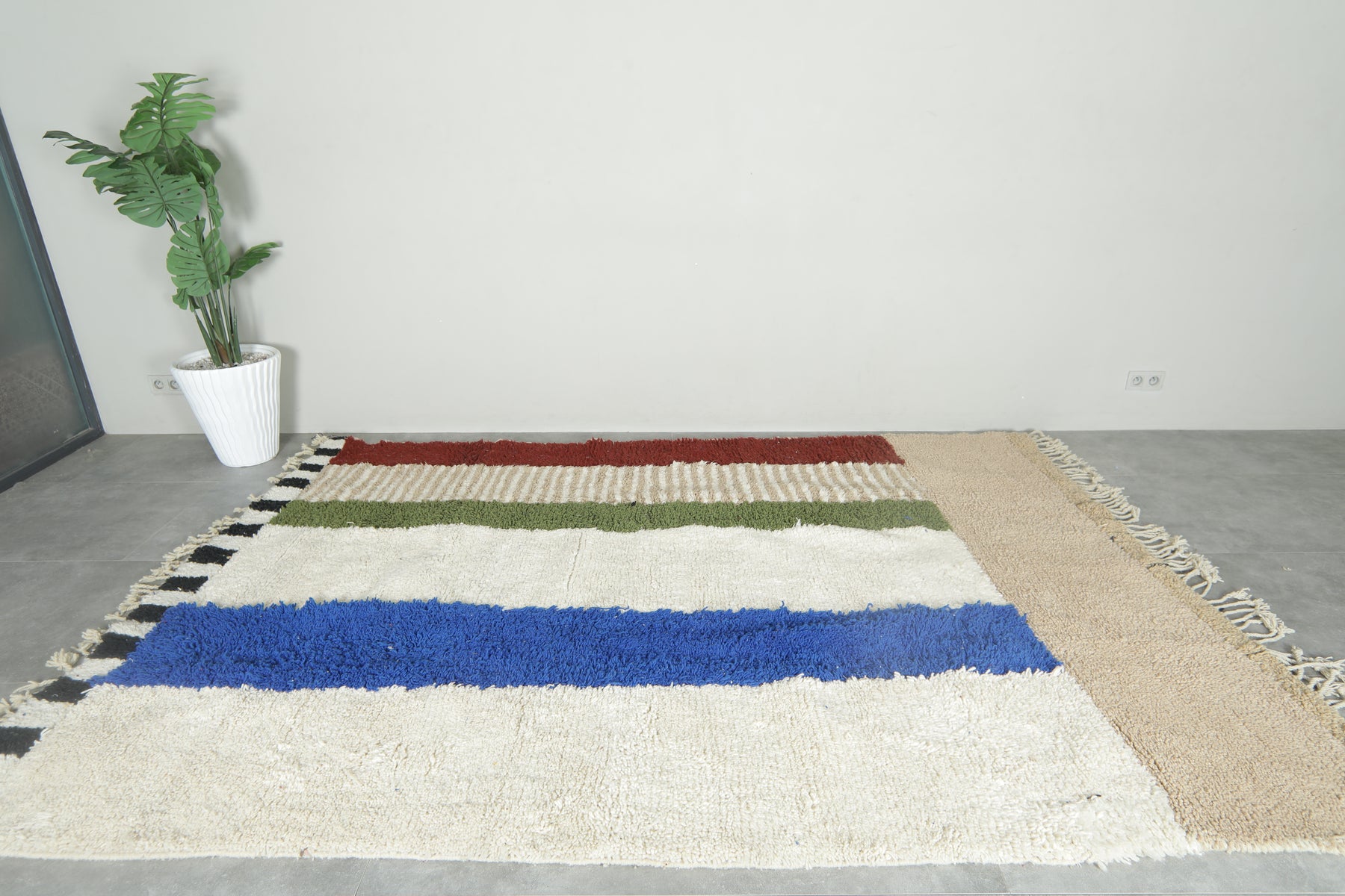 Elevate your interior with this vibrant handwoven Moroccan rug, featuring a bold mix of modern and earthy tones. The creamy off-white base provides a clean, neutral foundation, while colorful vertical stripes in deep red, olive green, beige, and royal blue add a striking visual contrast. Expertly crafted from high-quality wool, this rug is both soft and durable—perfect for living rooms, bedrooms, or creative spaces.