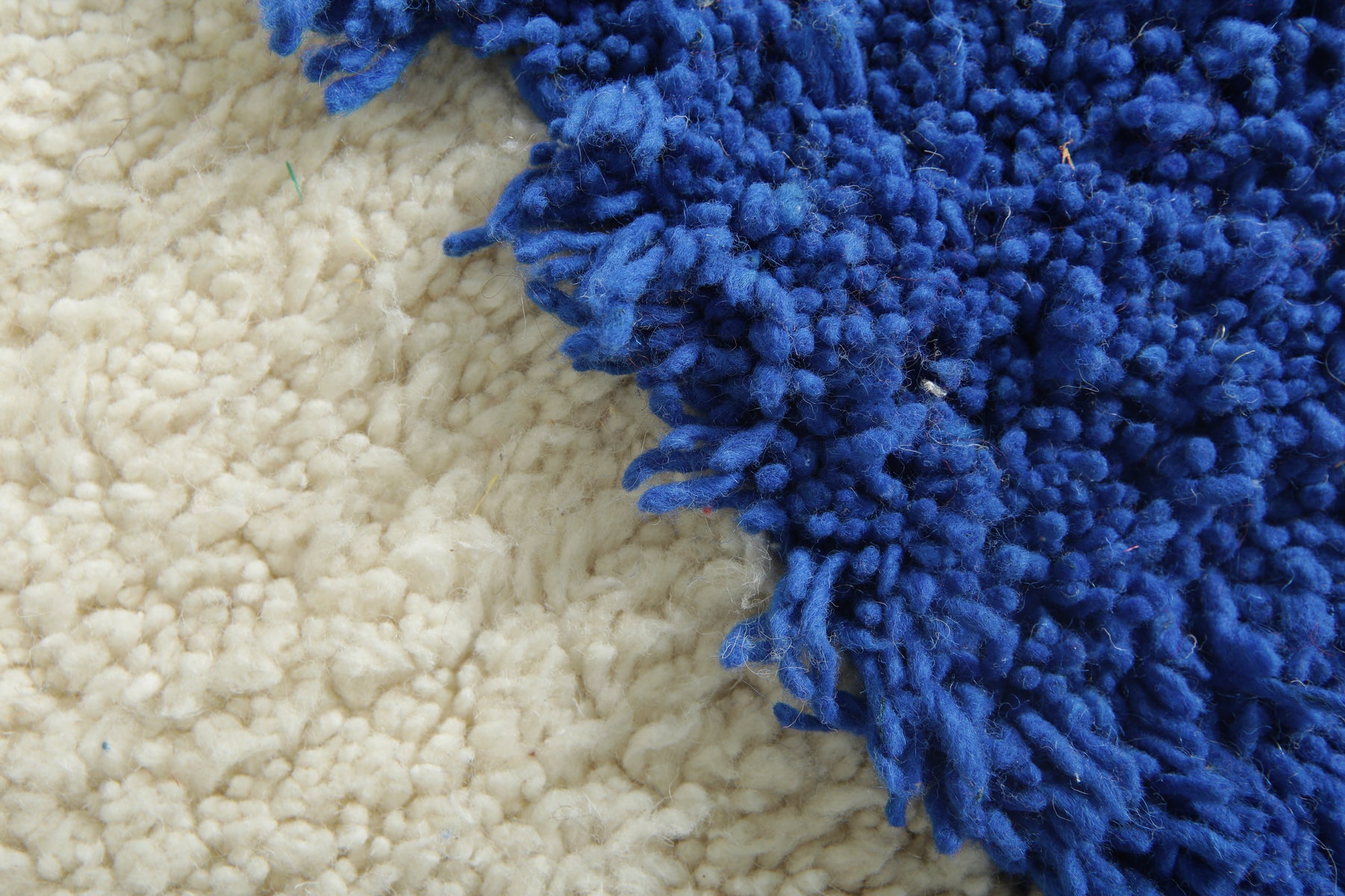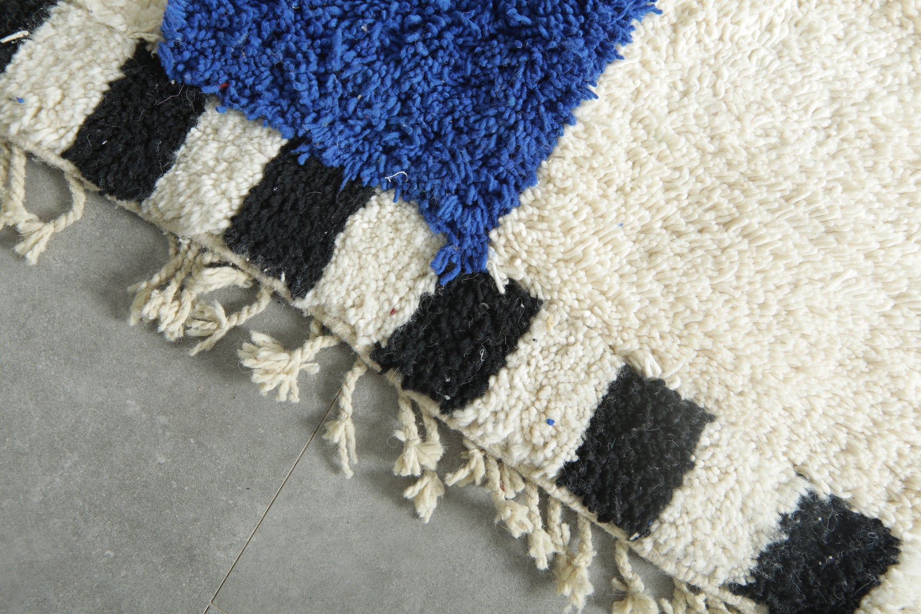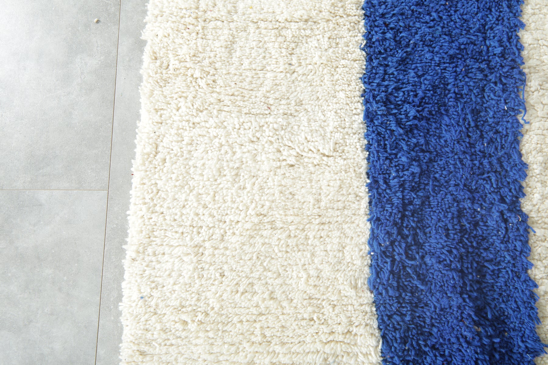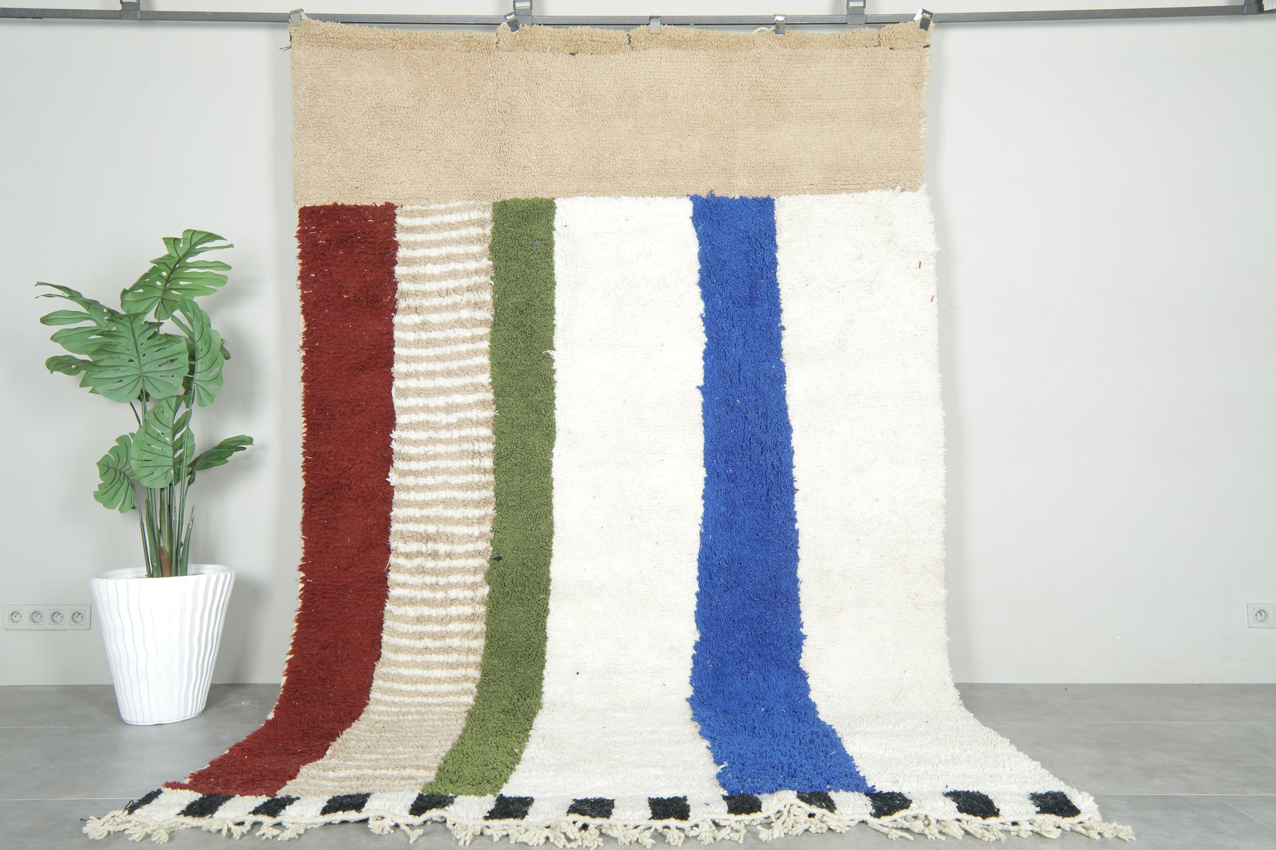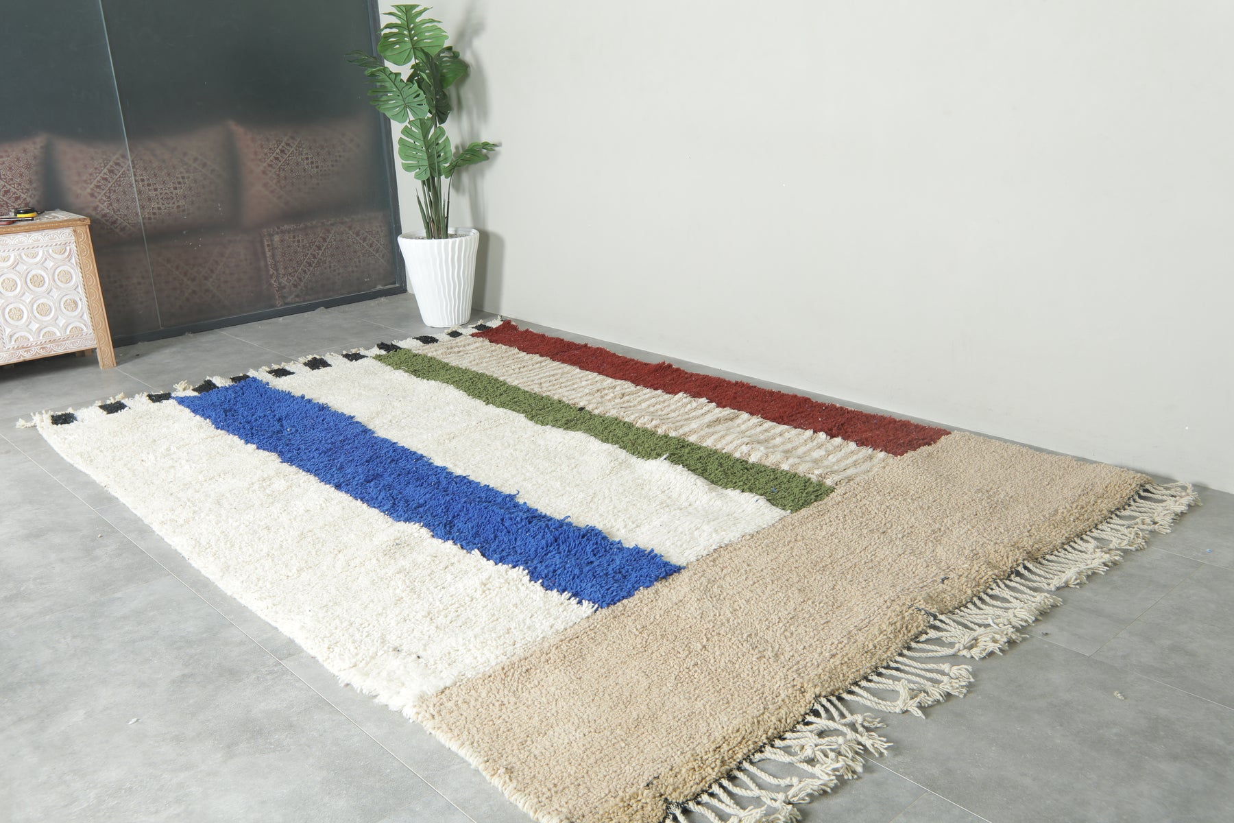 Elevate your interior with this vibrant handwoven Moroccan rug, featuring a bold mix of modern and earthy tones. The creamy off-white base provides a clean, neutral foundation, while colorful vertical stripes in deep red, olive green, beige, and royal blue add a striking visual contrast. Expertly crafted from high-quality wool, this rug is both soft and durable—perfect for living rooms, bedrooms, or creative spaces.
