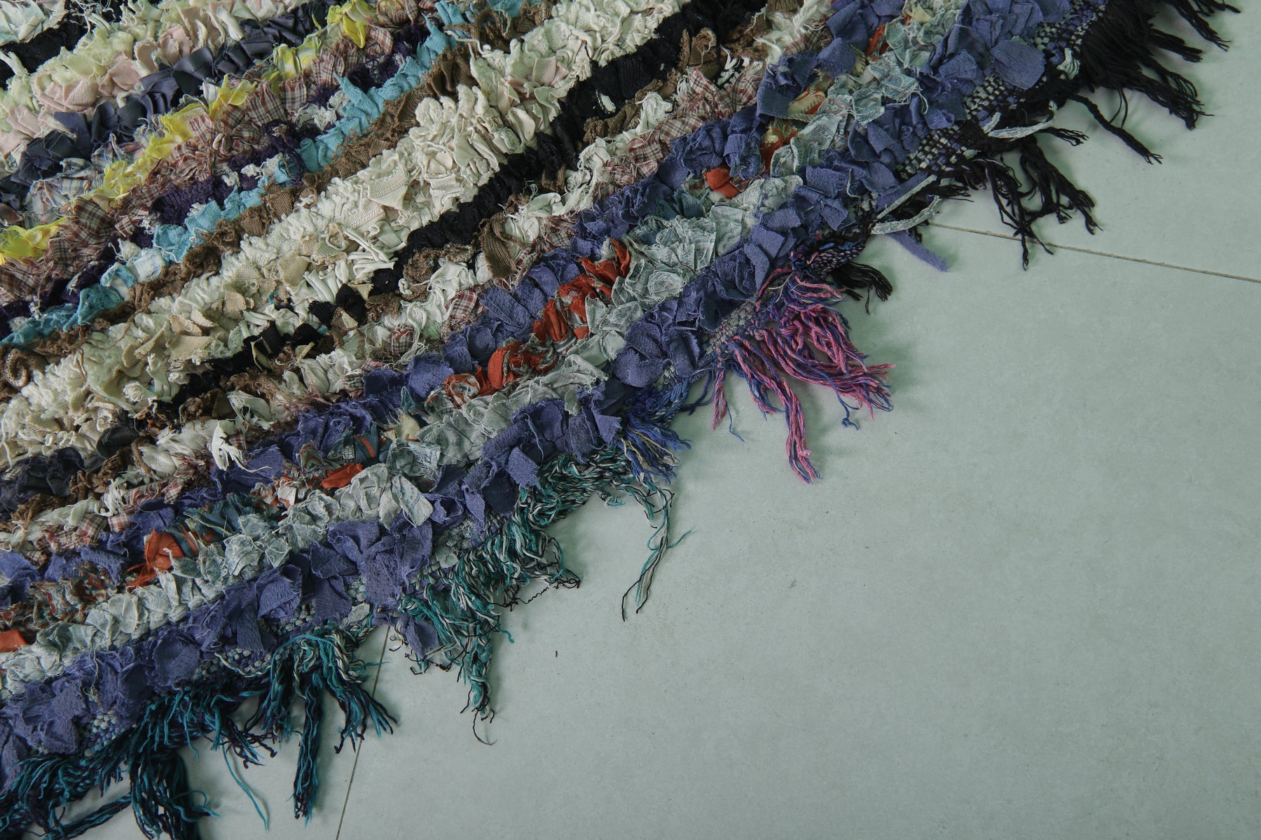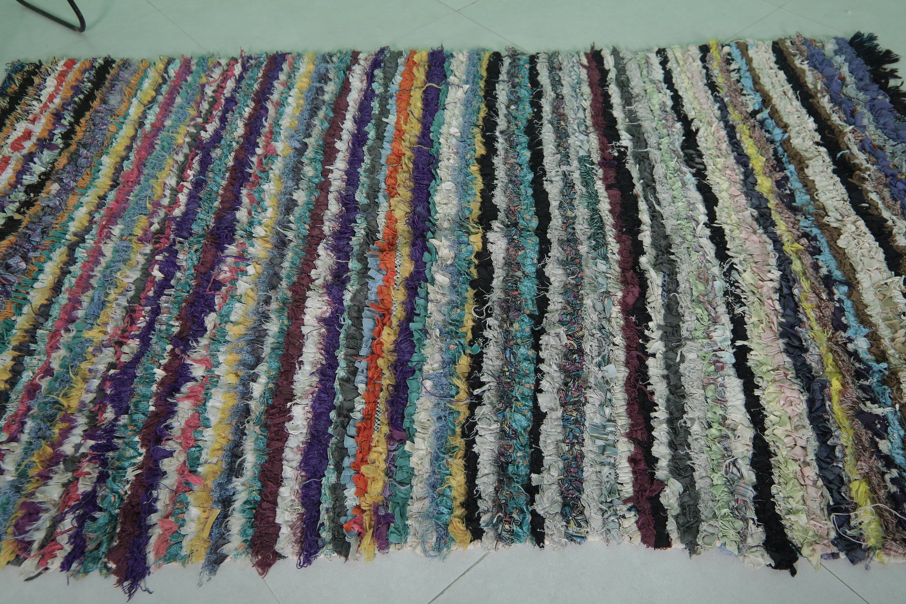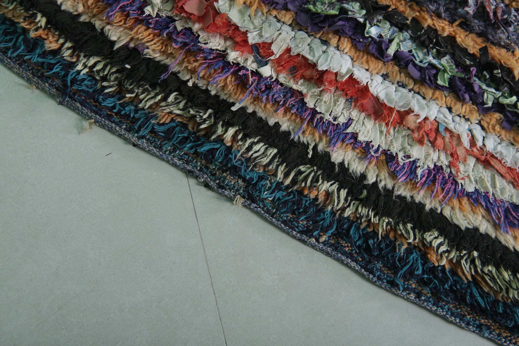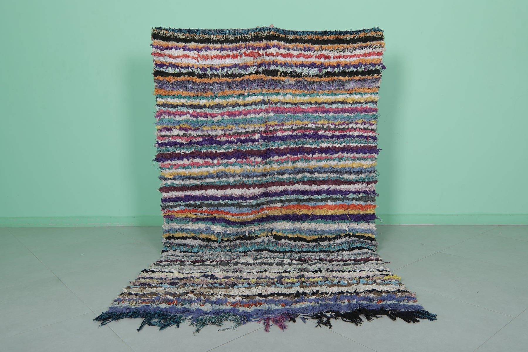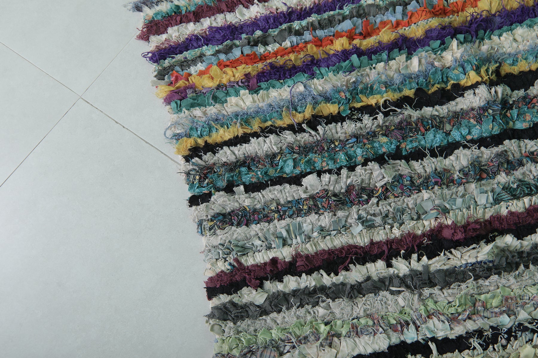 Discover the artistry of Moroccan craftsmanship with this 4.2 x 7 FT Berber Boucherouite Rug. Handwoven from recycled fabric, its horizontal striped pattern showcases a mix of vibrant purples, yellows, blues, and neutrals, creating a visually captivating piece. This eco-friendly design offers a soft texture and an eclectic vibe, perfect for brightening up any living room, bedroom, or hallway. A stunning blend of tradition and sustainability, ideal for bohemian and contemporary interiors alike.