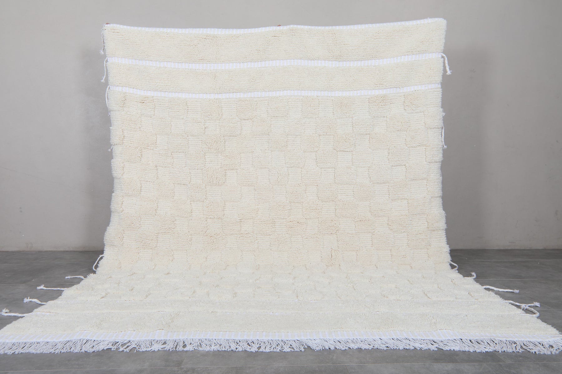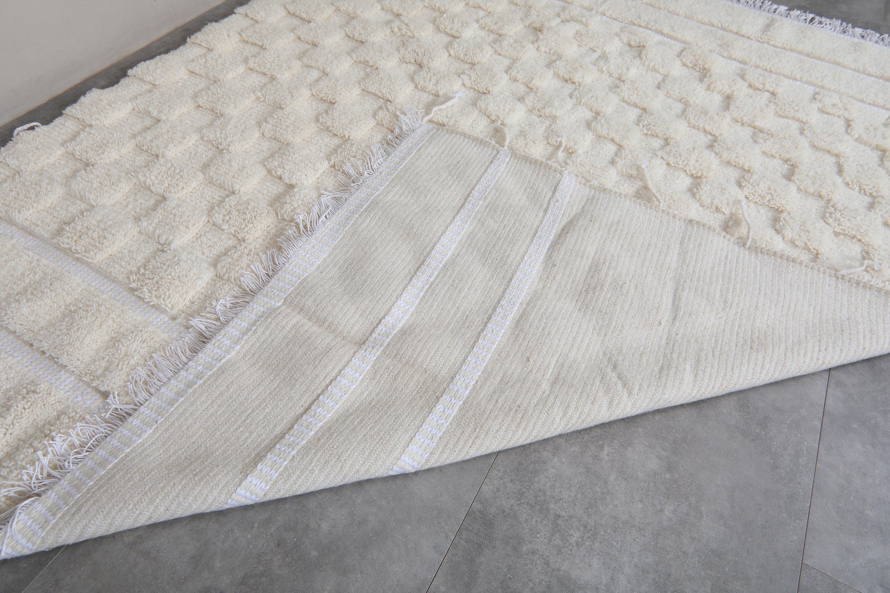 Add a touch of elegance to your interior with this handwoven Moroccan rug in soft cream, subtly striped in white and texturally patterned in a checkerboard effect. Woven from 100% wool, this rug adds warmth and style to any living room, bedroom, or office. The minimalist design is completed with delicate white fringe tassels, adding a clean, refined finish. Its neutral palette makes it versatile and provides endless options to fit within any style, whether your taste is modern and Scandinavian, boho, or rustic. Perfect for adding that cozy and artisanal touch, this flatwoven Moroccan rug is timeless, balancing simplicity with traditional craftsmanship. Perfect for those who seek subtle sophistication and quality in their home décor.