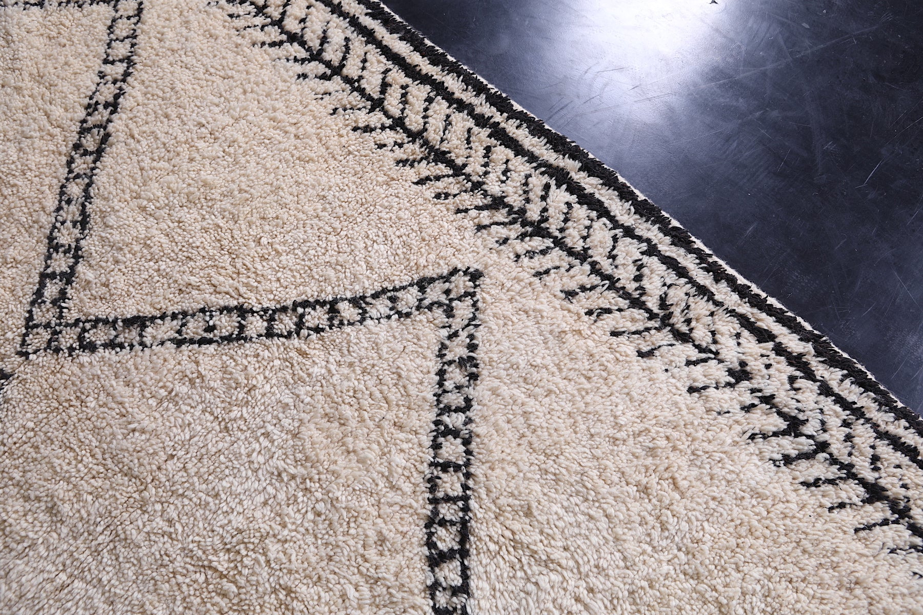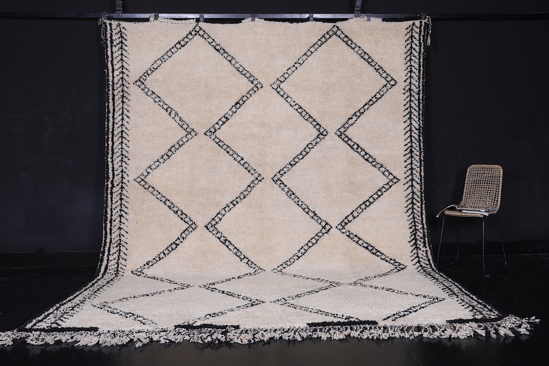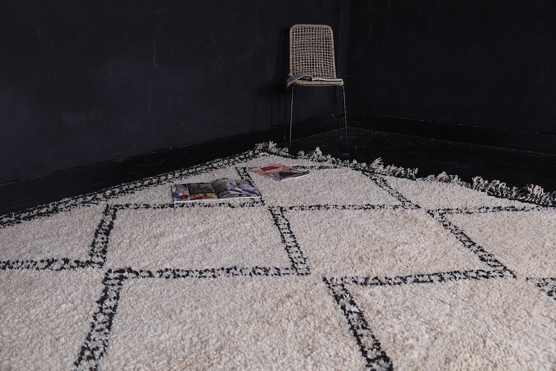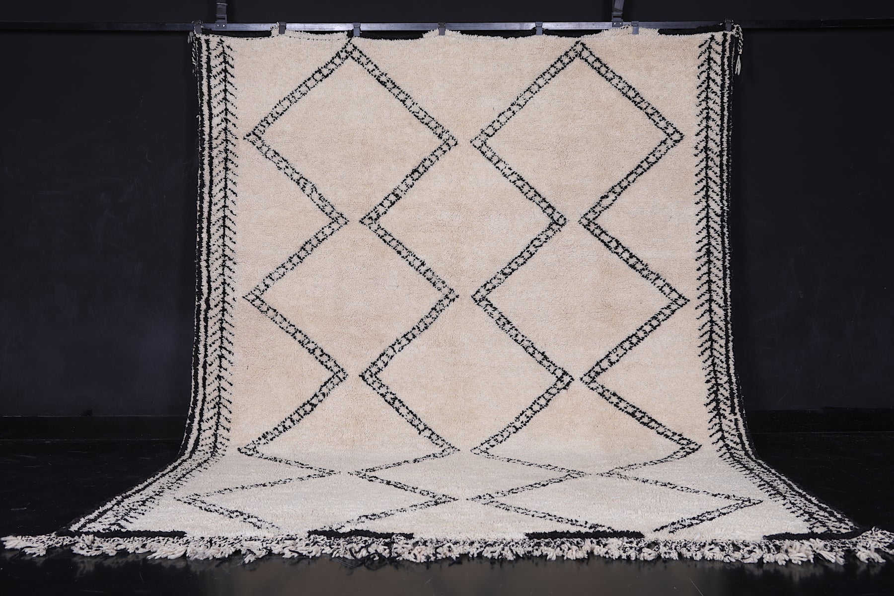 Timeless elegance meets artisan craftsmanship in our Beni Ourain Moroccan Rug, featuring a classic cream base and bold black diamond motif. Handwoven from soft, high-pile wool, this rug showcases traditional Amazigh (Berber) design elements, including a striking geometric lattice and intricately bordered edges that frame the composition beautifully.