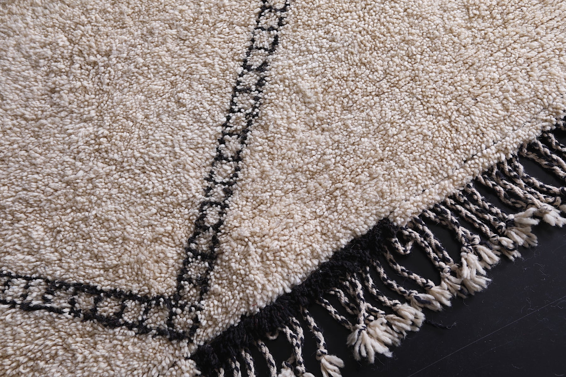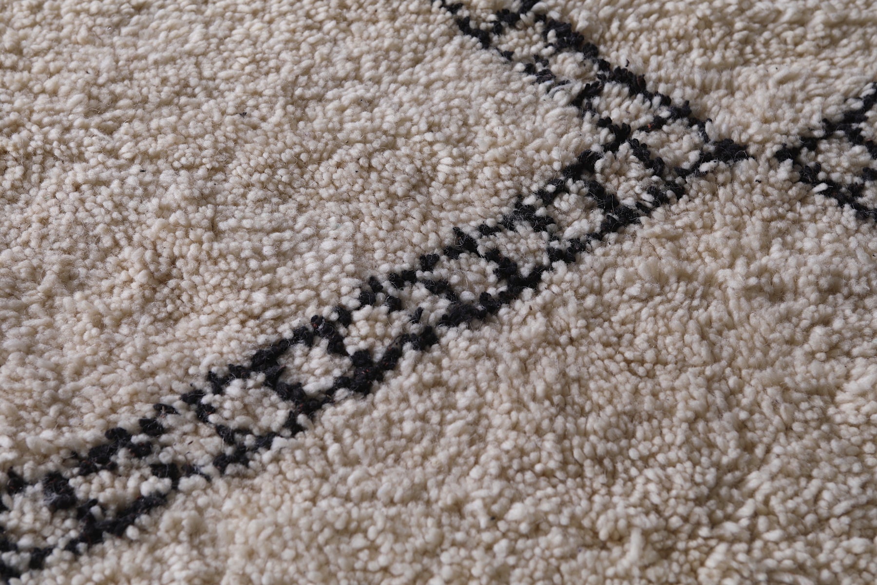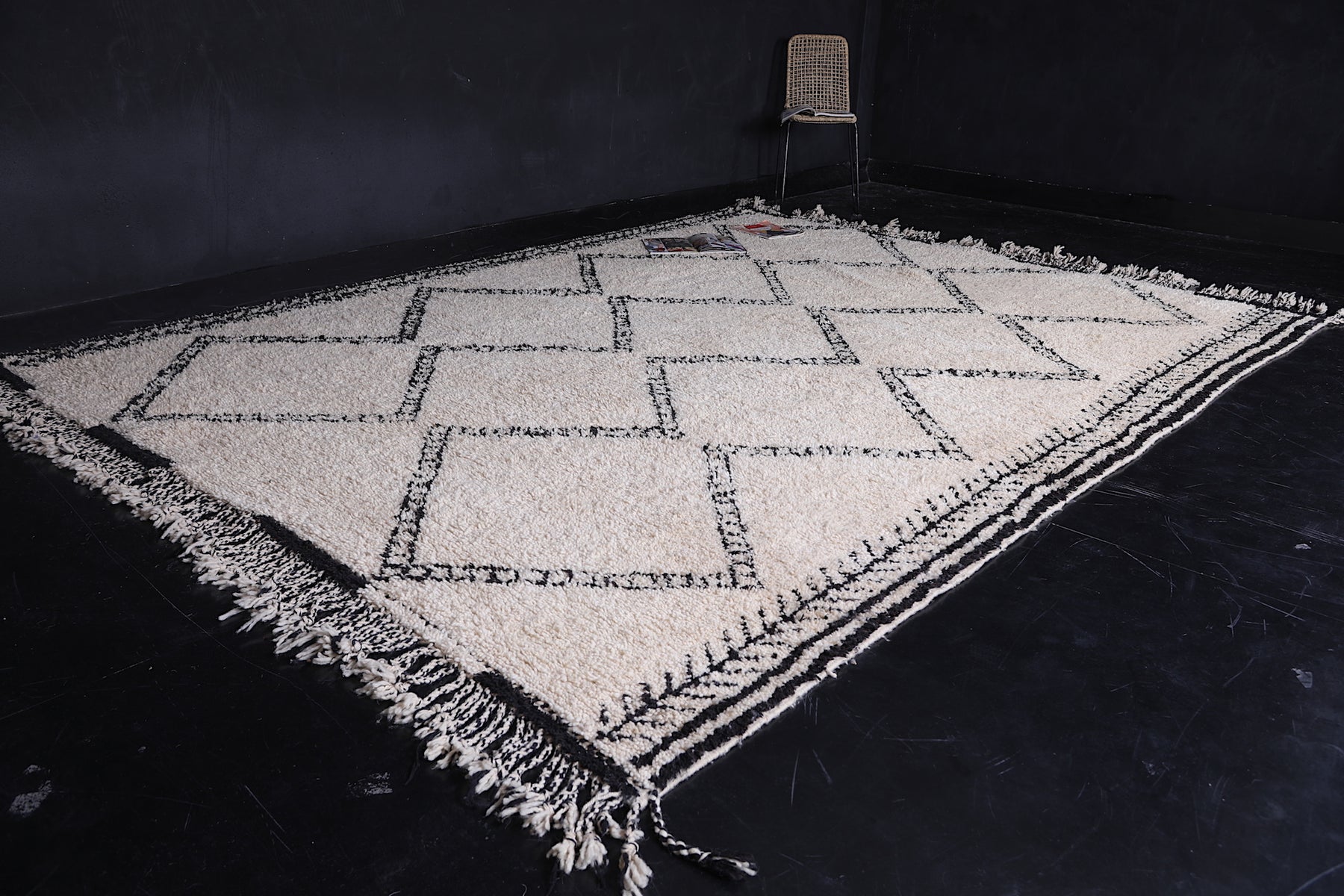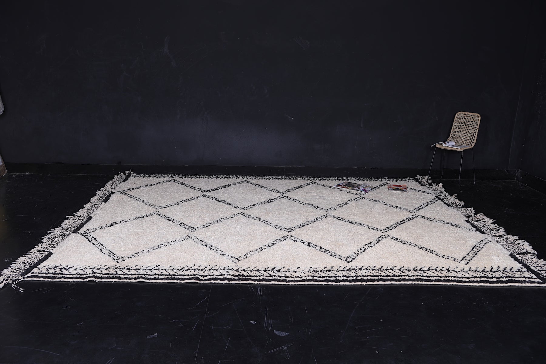 Timeless elegance meets artisan craftsmanship in our Beni Ourain Moroccan Rug, featuring a classic cream base and bold black diamond motif. Handwoven from soft, high-pile wool, this rug showcases traditional Amazigh (Berber) design elements, including a striking geometric lattice and intricately bordered edges that frame the composition beautifully.