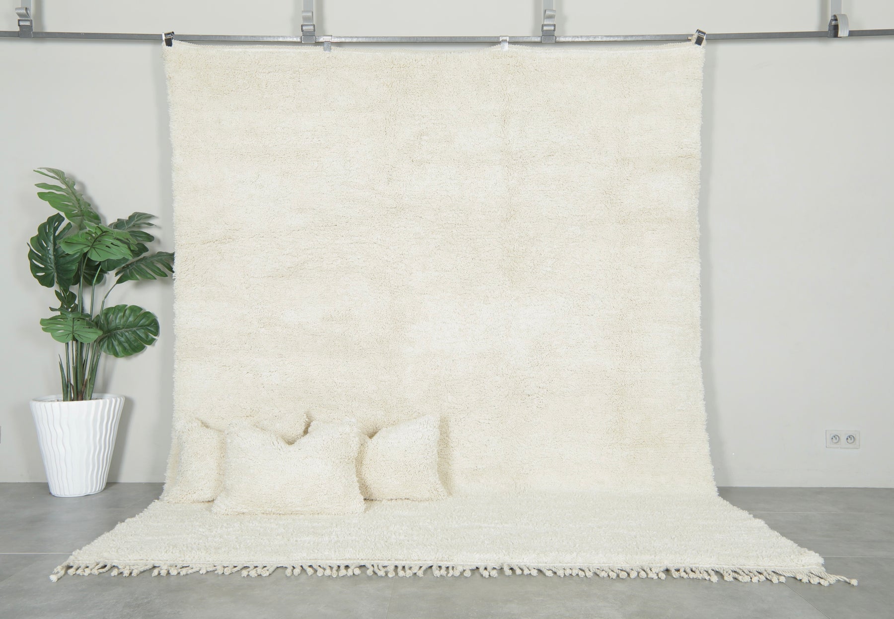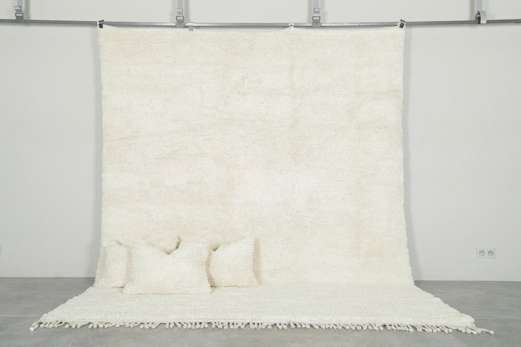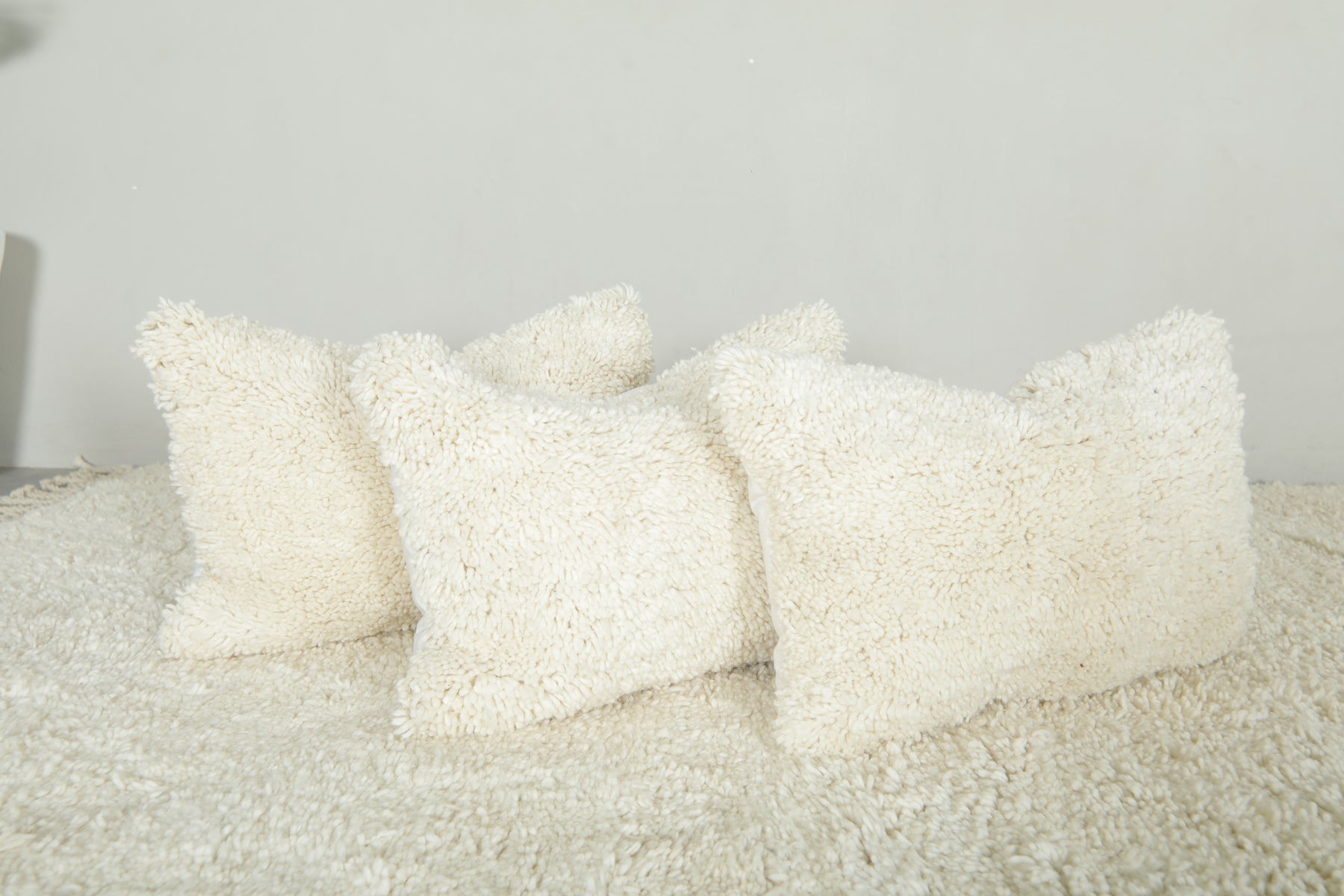 Elevate your living space with this luxurious handmade Moroccan shaggy rug and matching pillow set. Crafted from 100% natural wool, the set includes a plush ivory rug and three soft pillows, designed to bring warmth, comfort, and timeless elegance to your home.