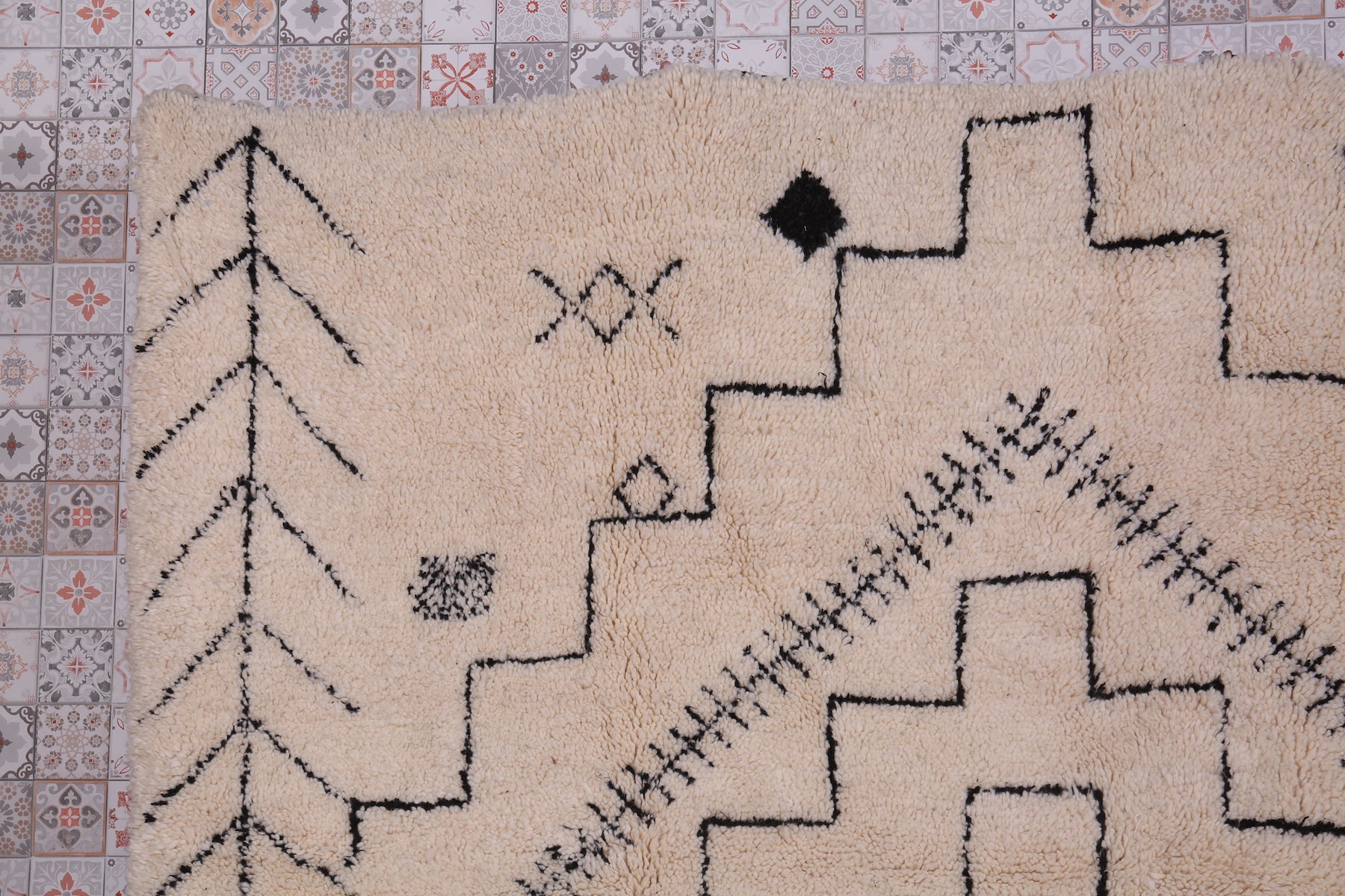 Custom handwoven Moroccan rug – Cream base with black berber symbols